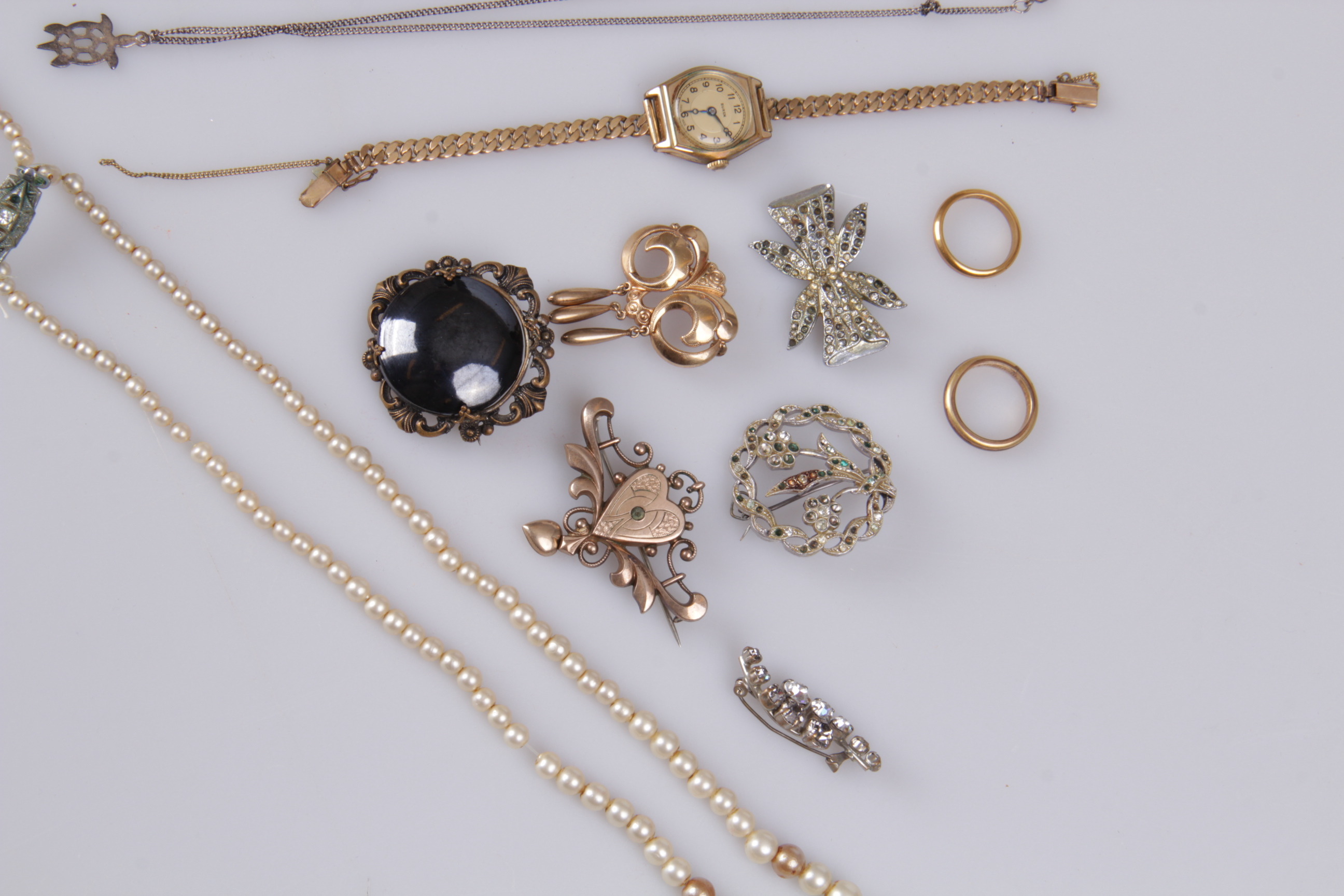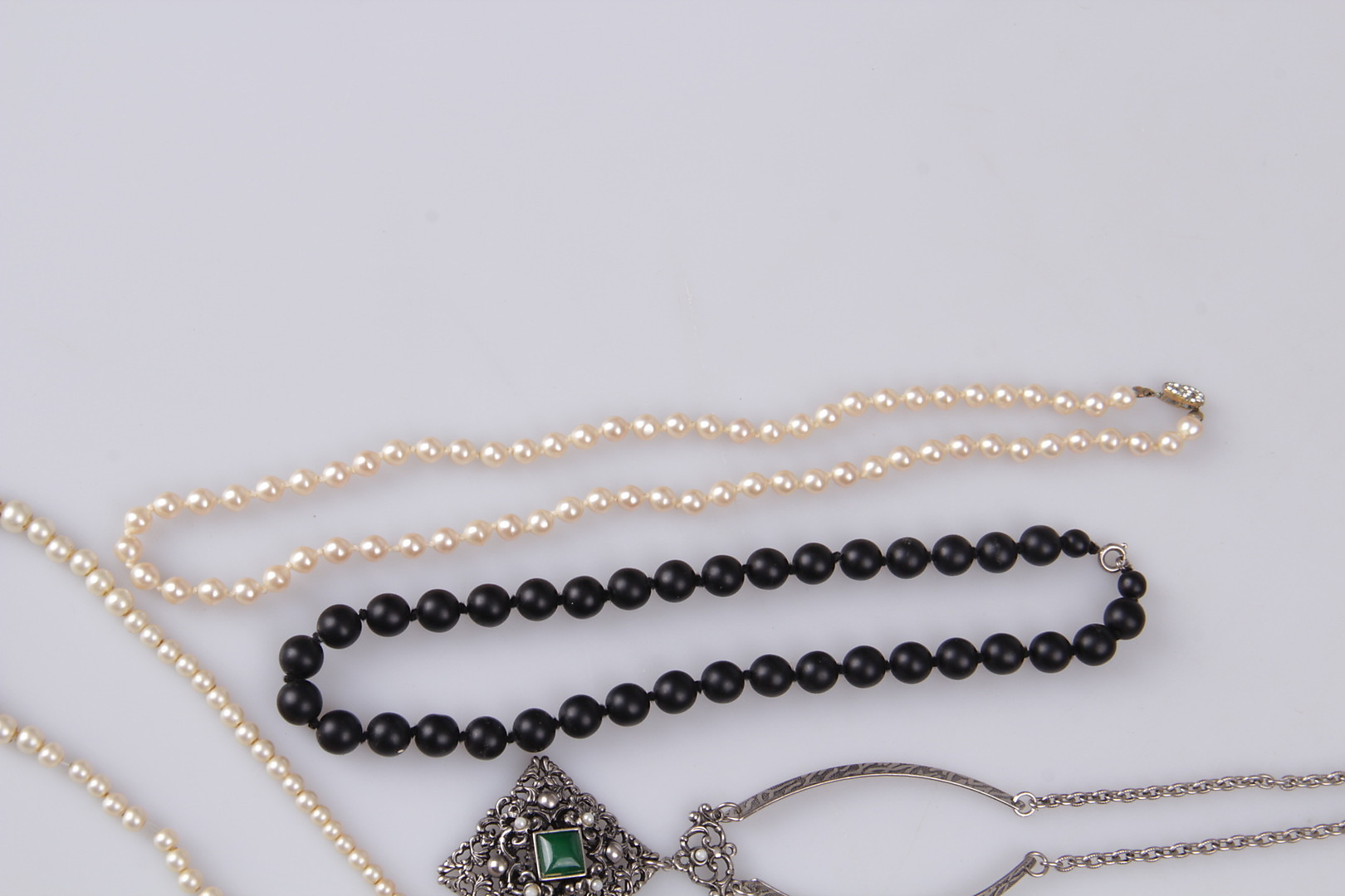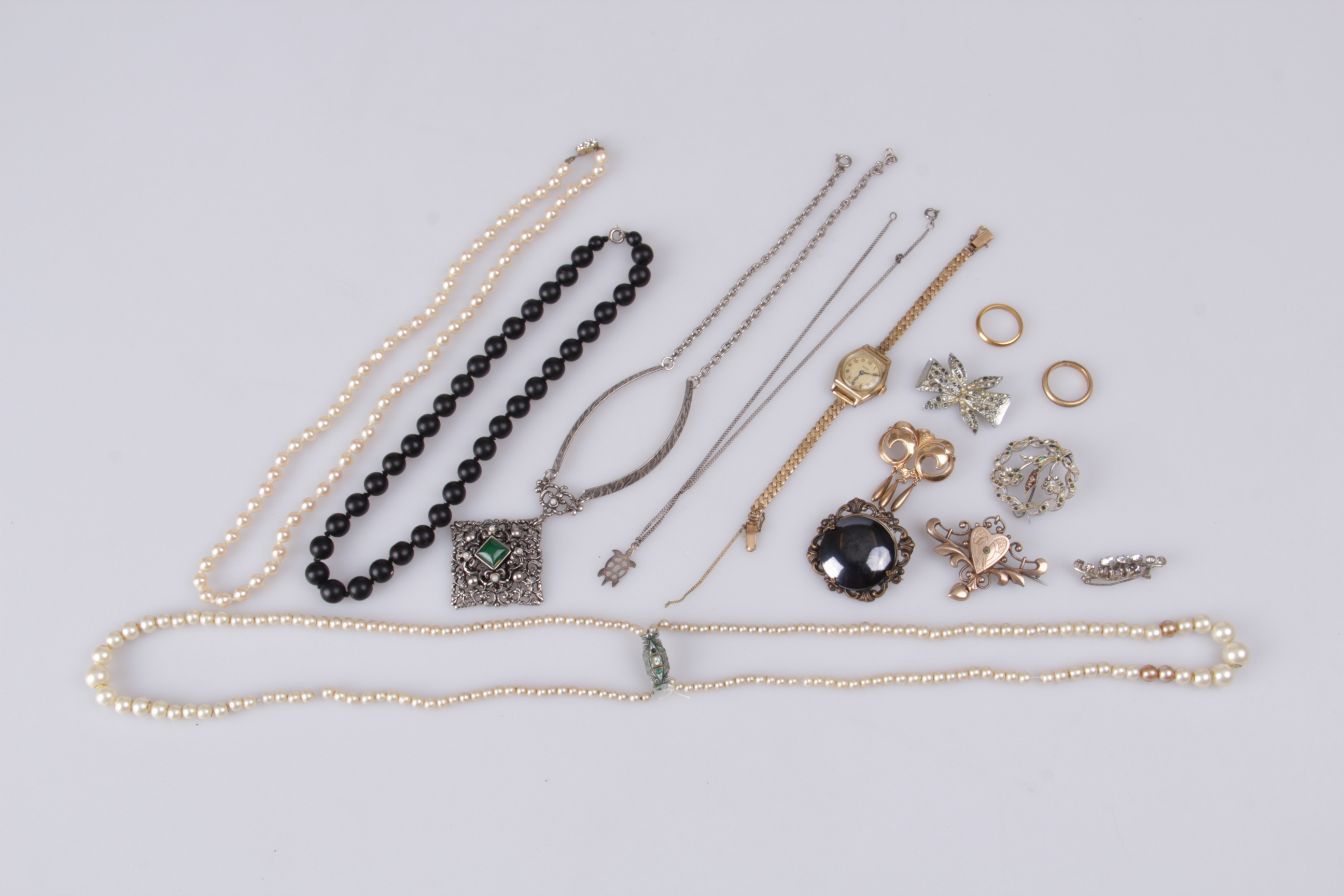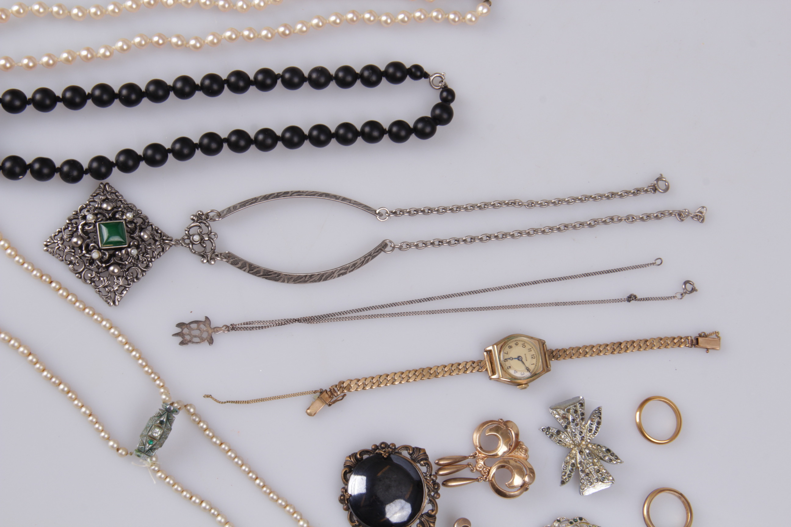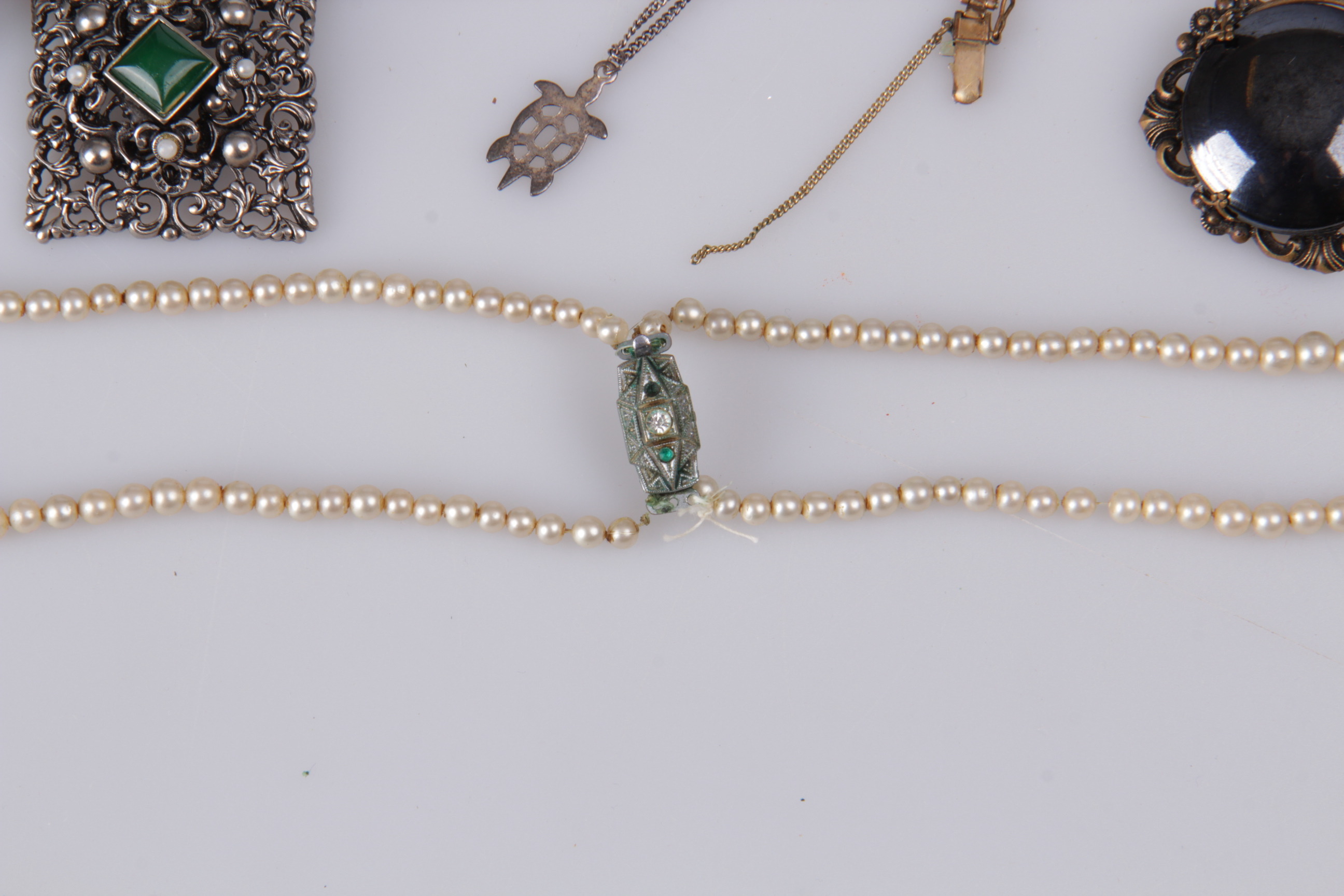 198064. SMYKKER, 14 dele, brocher, perlekæder, sterlingsølv.