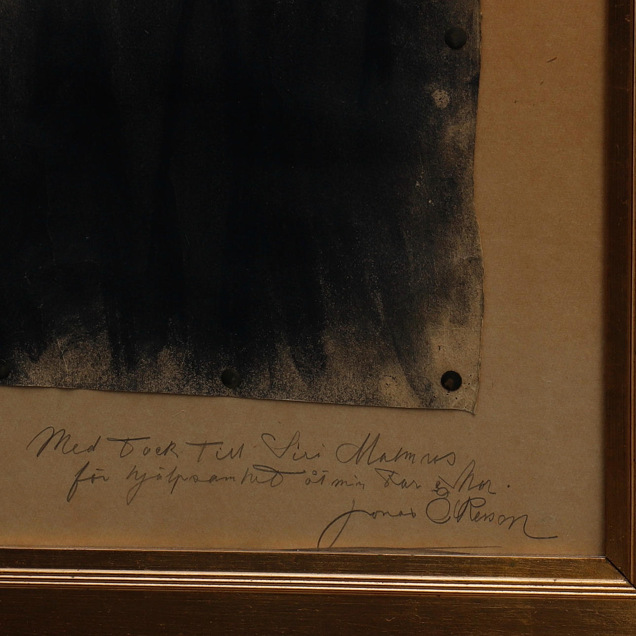 Carbon tegning, signeret med dedikation. På papir, monteret på pap. Cirka 63 x 53 cm.