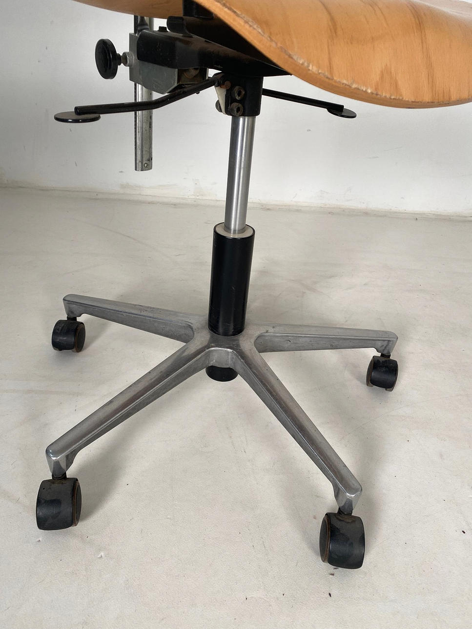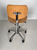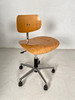 Kontorstol model S 197 R . Designet af Arch. Egon Eiermann for Wilde & Spieth, Tyskland. Mærket med trykmærke på ryglænets justeringsknap. Dreje- og højdejusterbar konstruktion med femstjernet fod af støbt aluminium, udstyret med gastrykfjeder, mekanisk hældningsjustering og hjul, ryglæn og sædeskal af tredimensionelt formet bøgekrydsfiner.