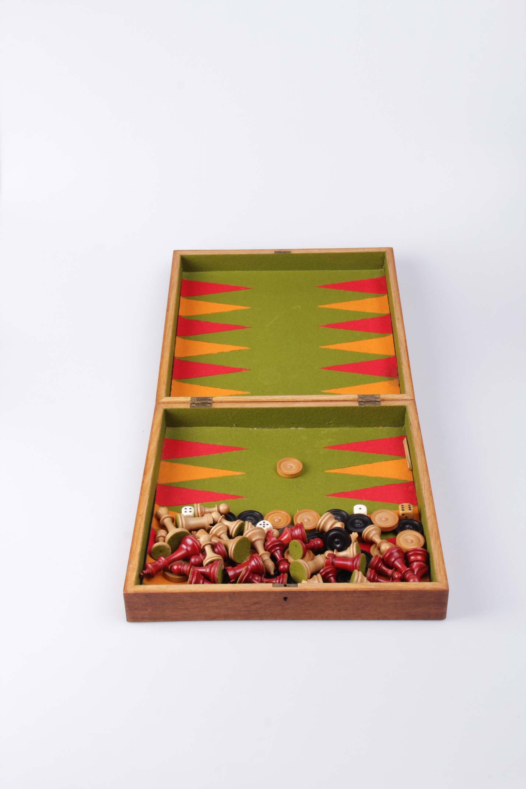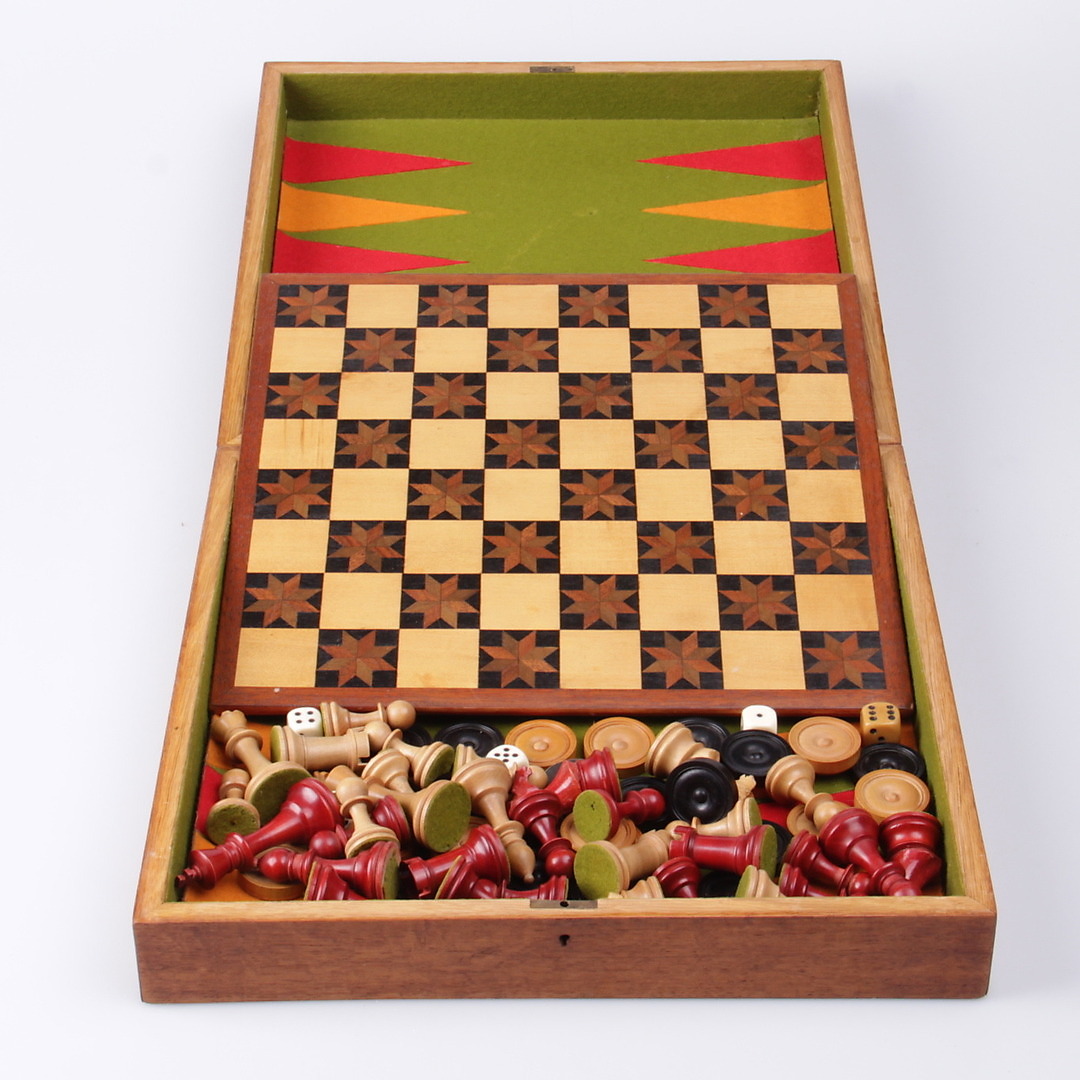 200513. BRÆTSPIL, backgammon og skak, i æske, 20. århundrede.