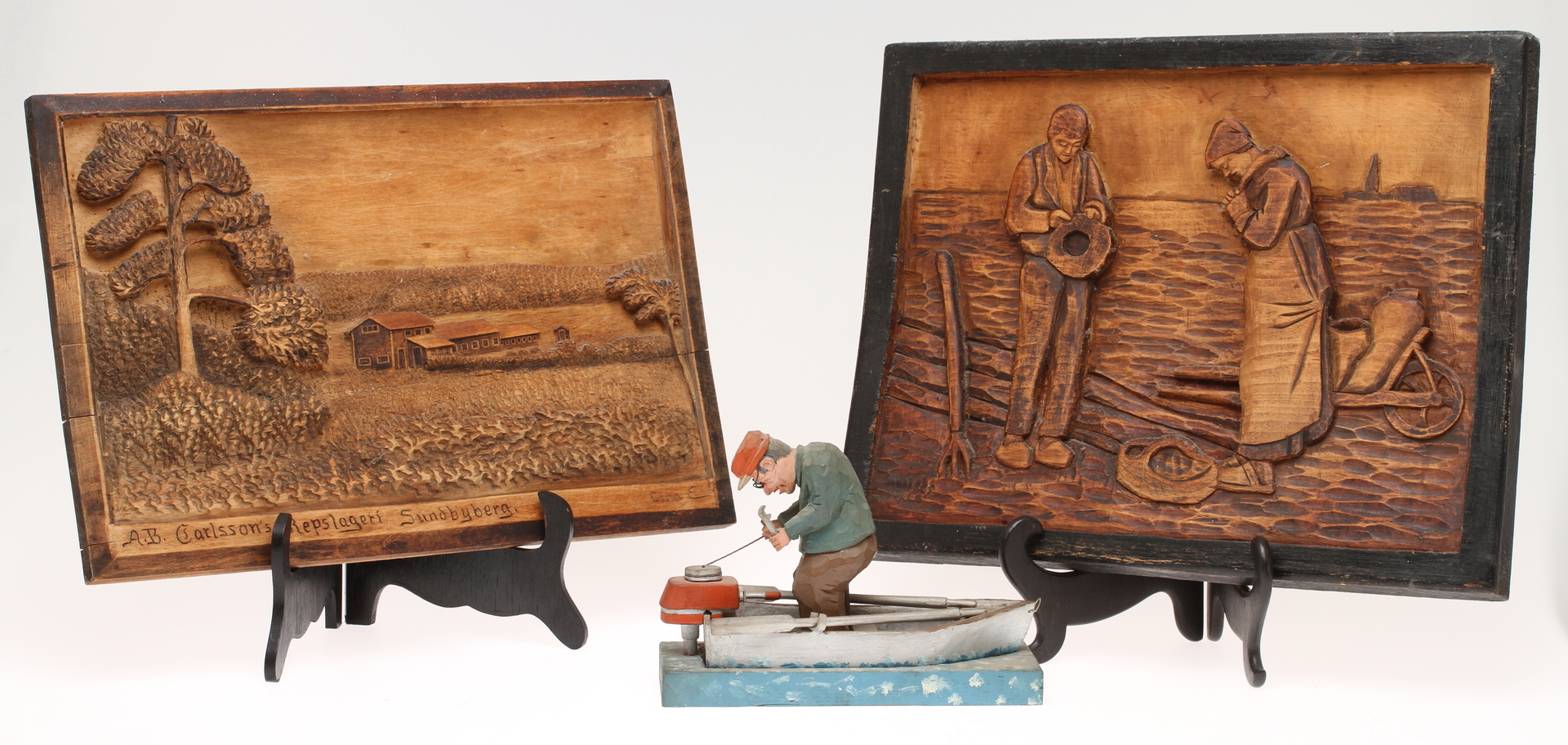 20204. MALERIER 2 stk og FIGUR, træsnit. 1900-tallet.