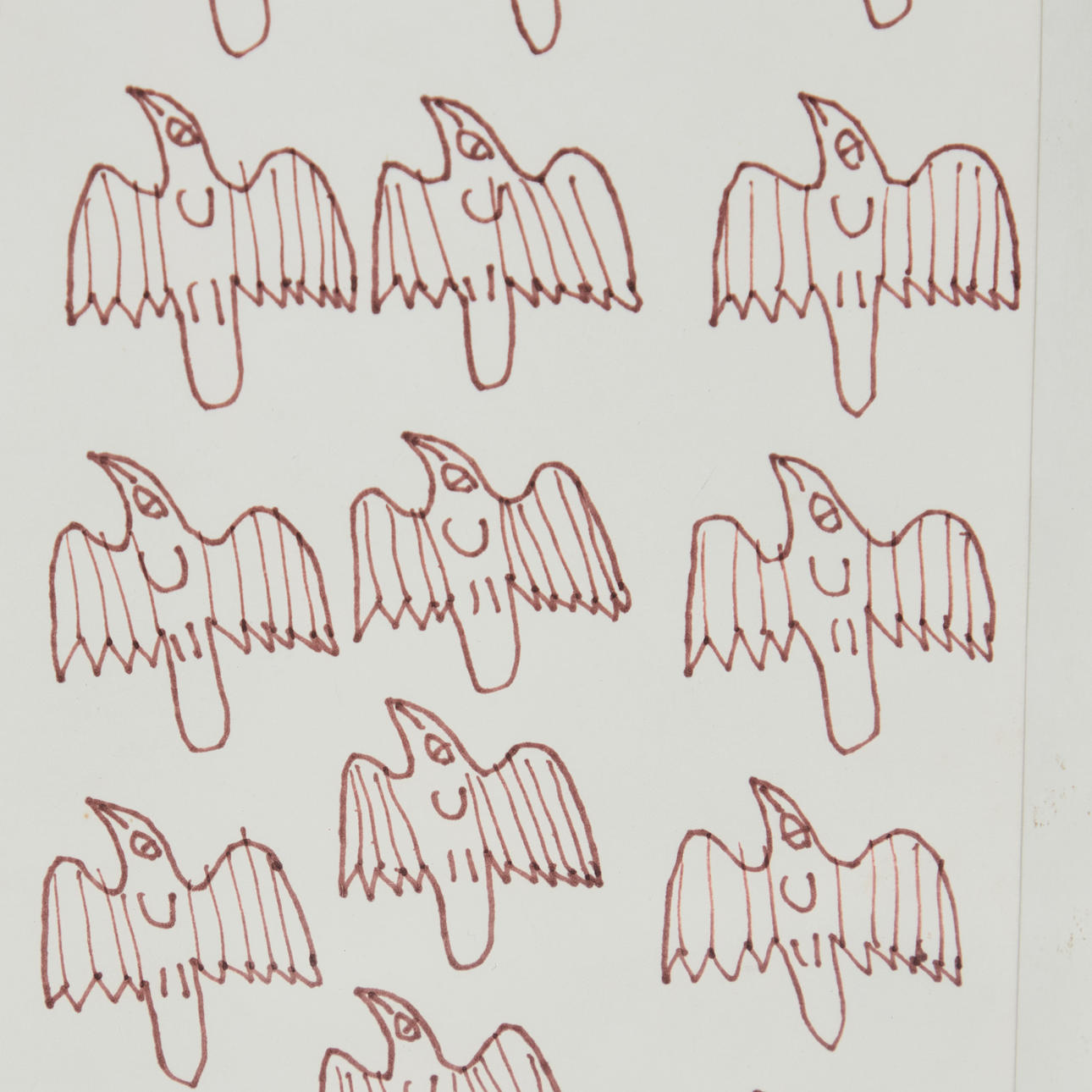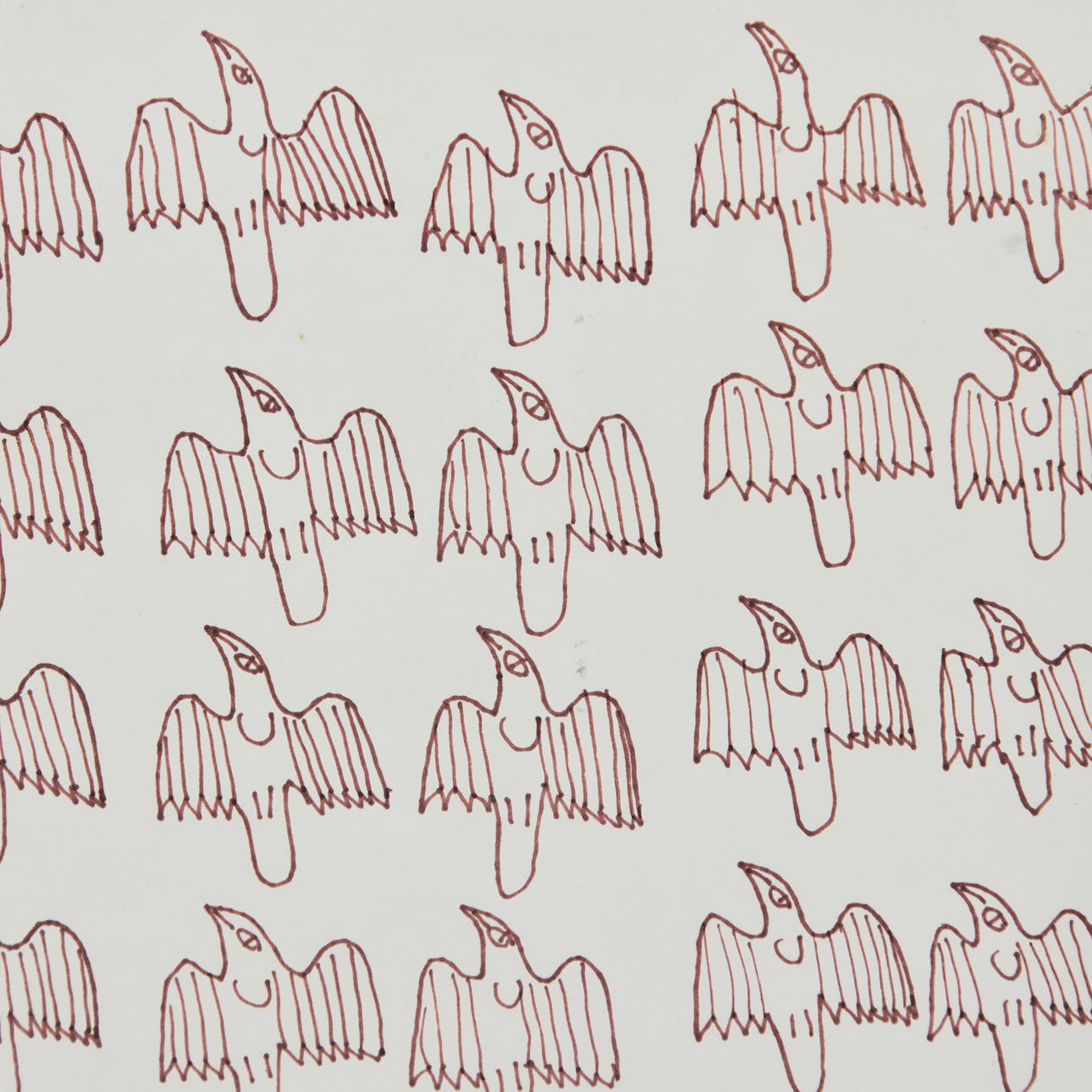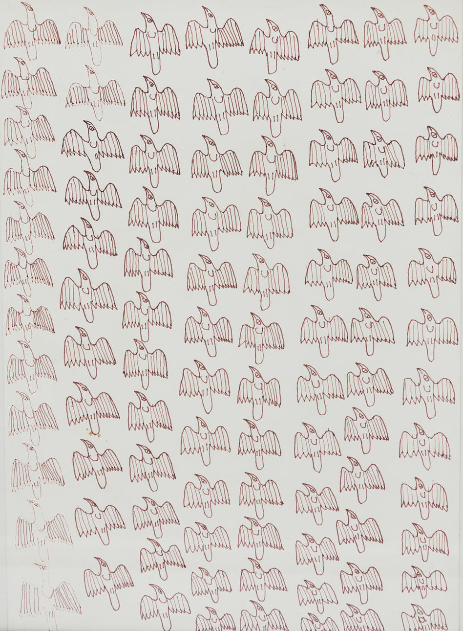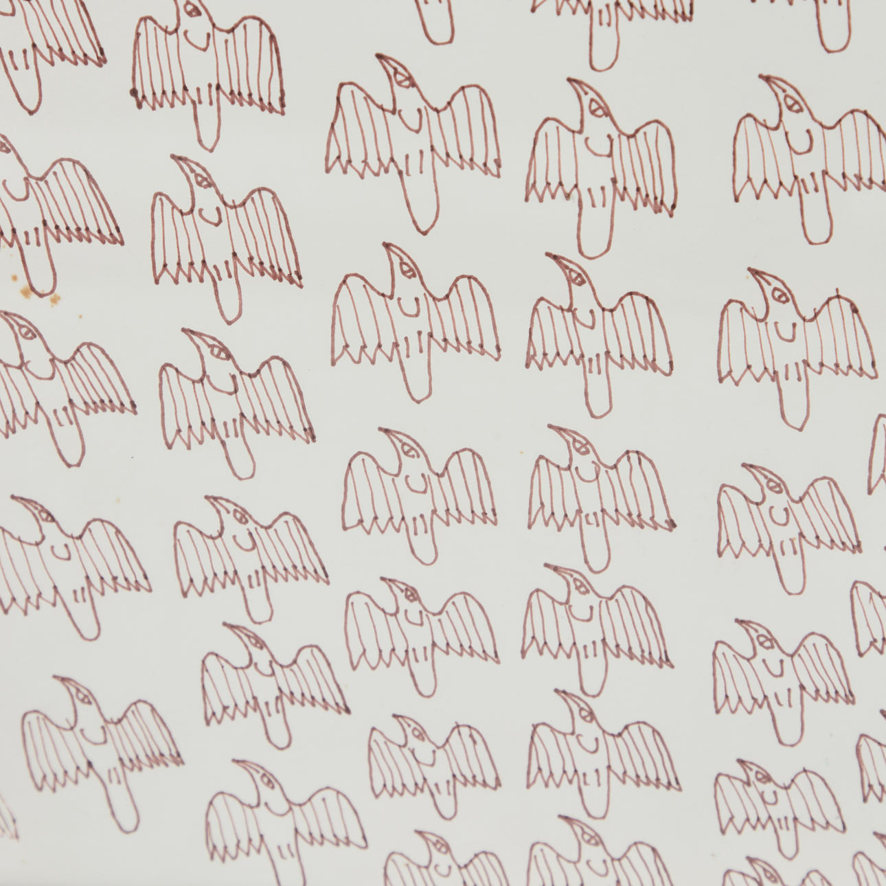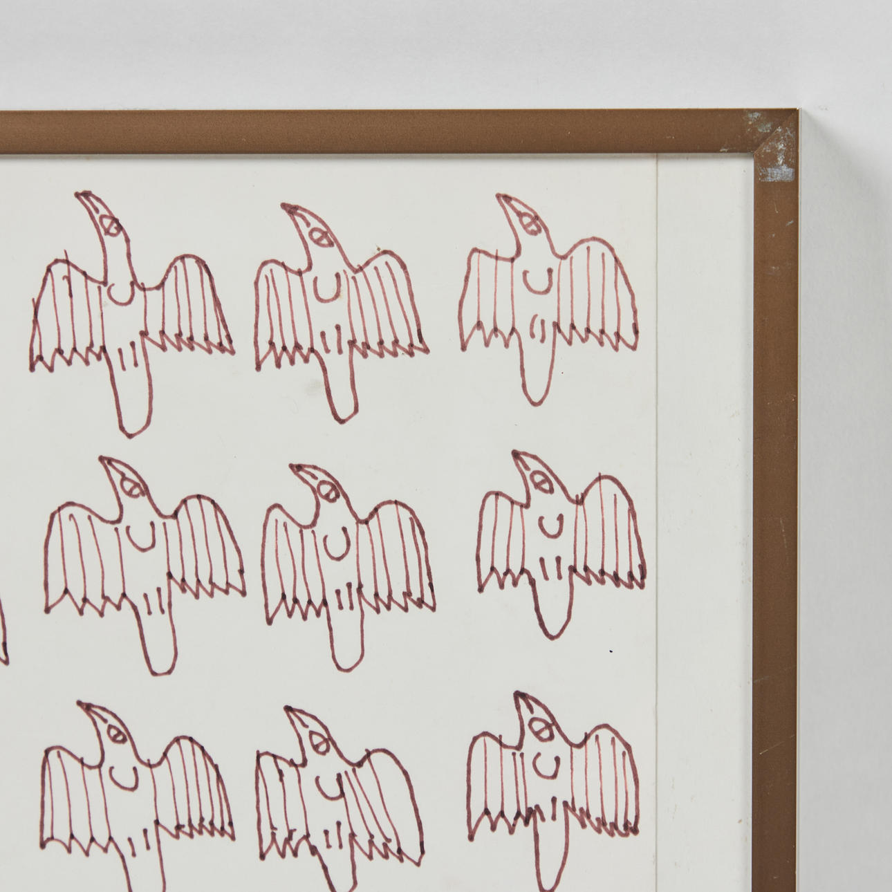Marco Raugei (1958-2003/06), tegning, ørn, filtpen på papir. Parallel afbildning af et væld af ørne i brunt på hvidt, 50x35cm (51,5x41cm).