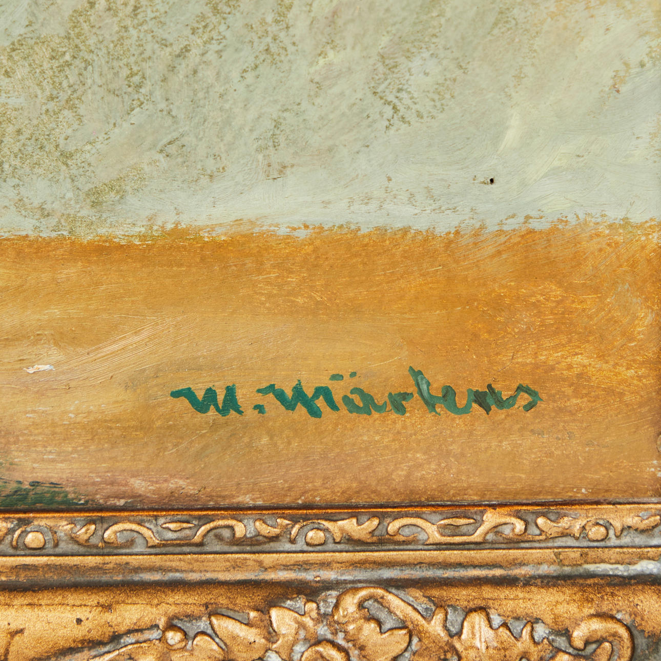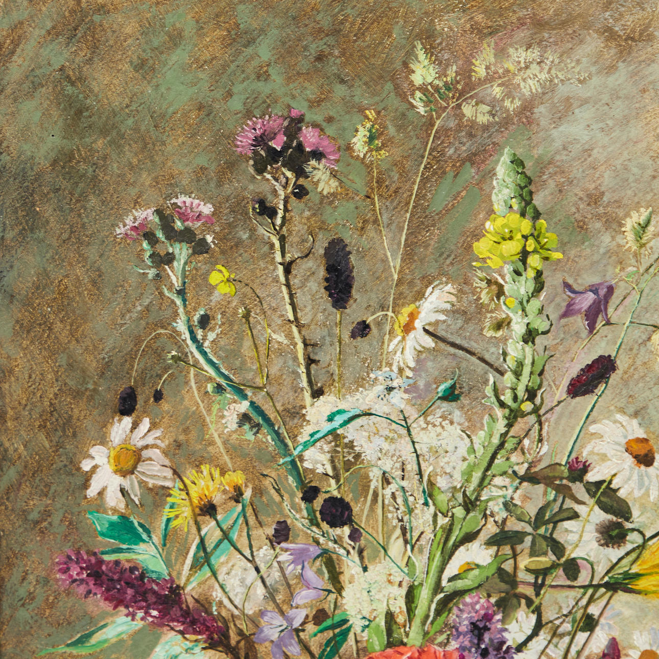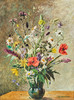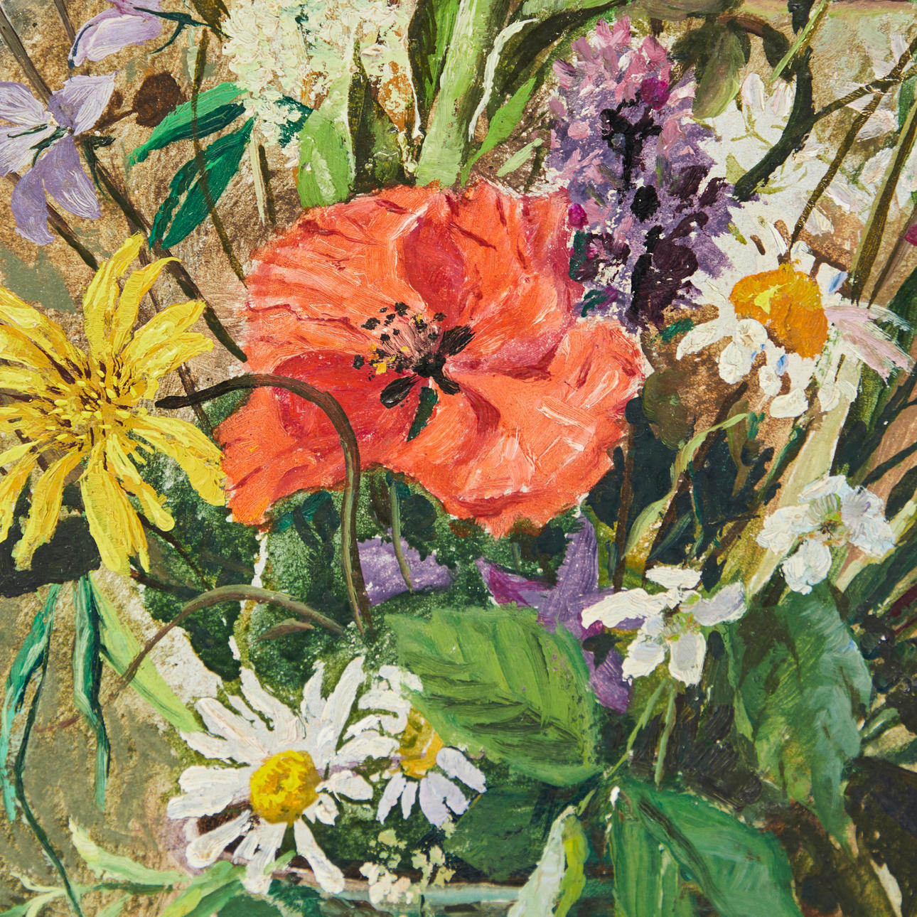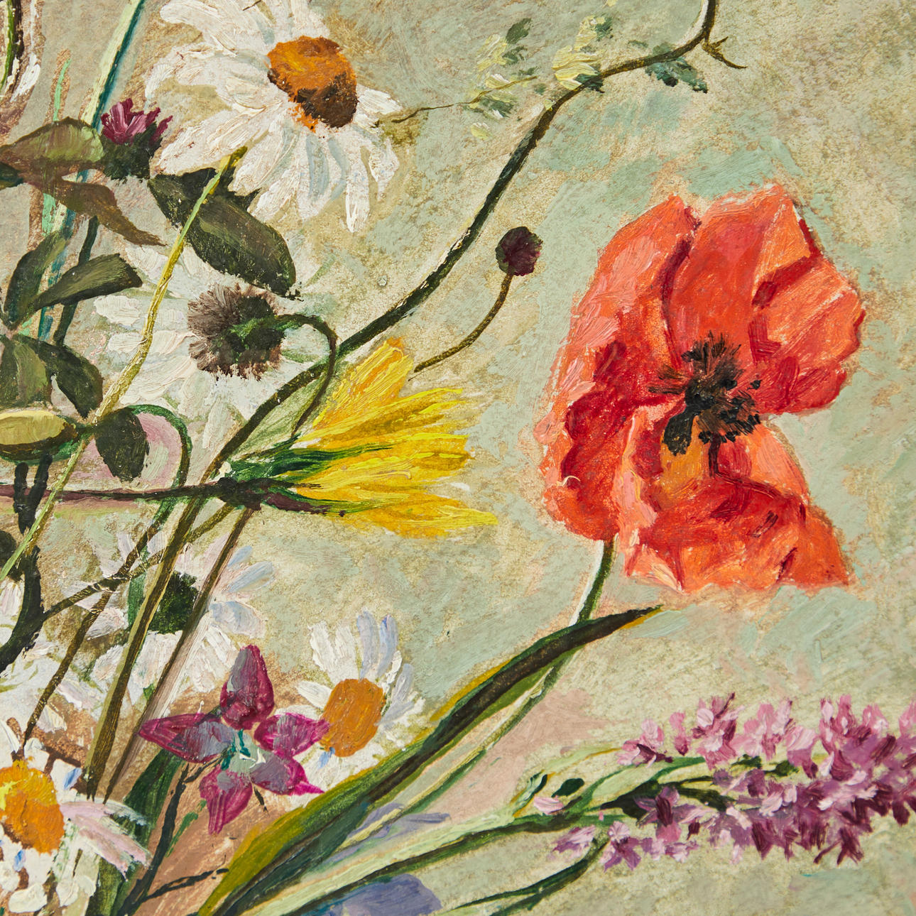 Max Märtens (1887-1970), maleri, blomsterstilleben, olie på lærred. Afbildning af en buket med kornblomster og valmuer i en vase på et bord foran en brun-grøn baggrund, signeret nederst til højre, 57x42cm (71,5x57,5cm).