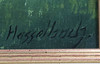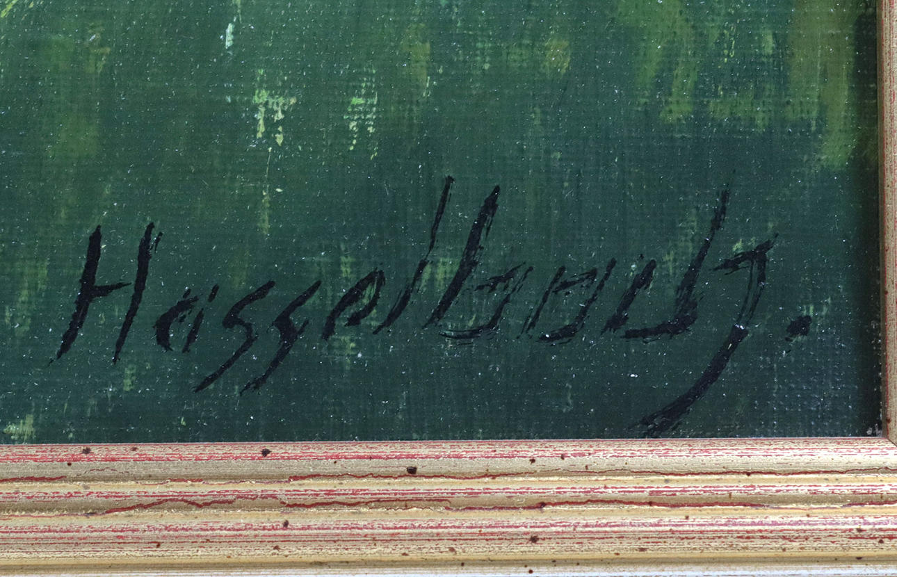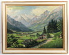 Olie på lærred signeret Hasselbach nederst til højre, landskabsformat udsigt fra en bakke, over en bygd bedt mellem enge og markers spæde grønne med en kirke ved søen, i baggrunden stigende bjergmassiver let dækket af sne, ca. 85 x 67 cm, i profilramme ca. 98x81 cm.