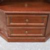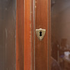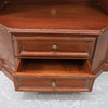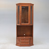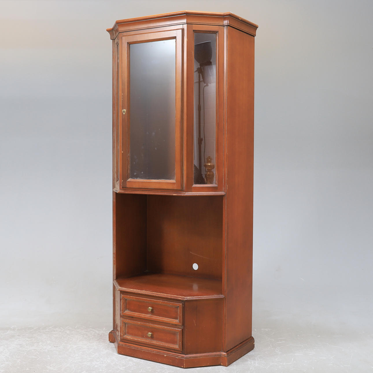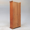 Fineret med gran. Overdel med glaseret skabslåge og gavl. Underdel med foldelåge og skuffe. Længde 98. Bredde 60. Højde 226 cm.