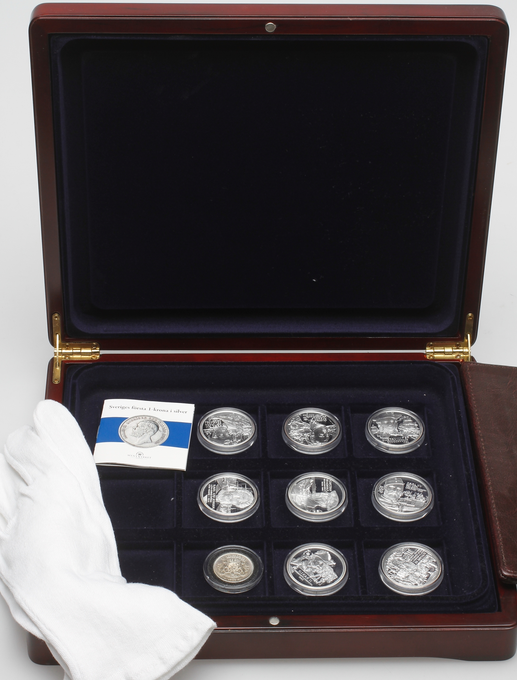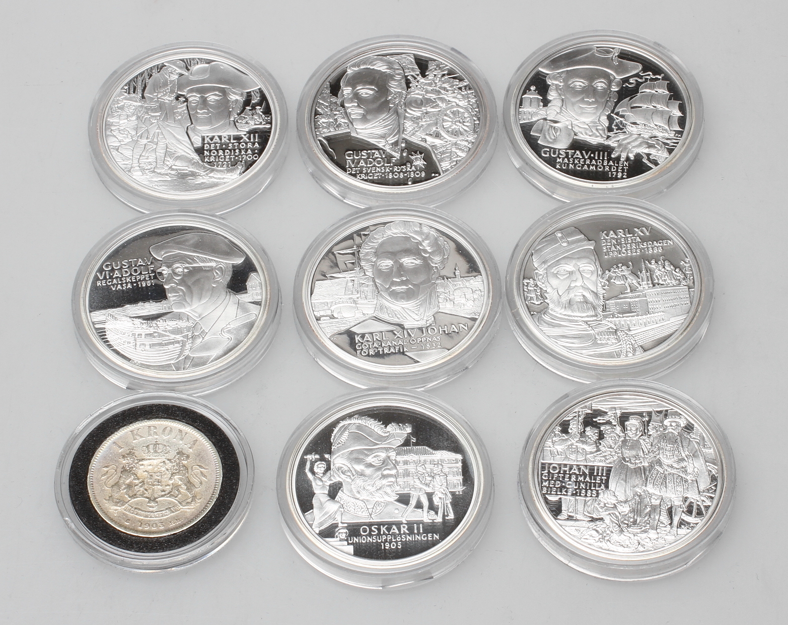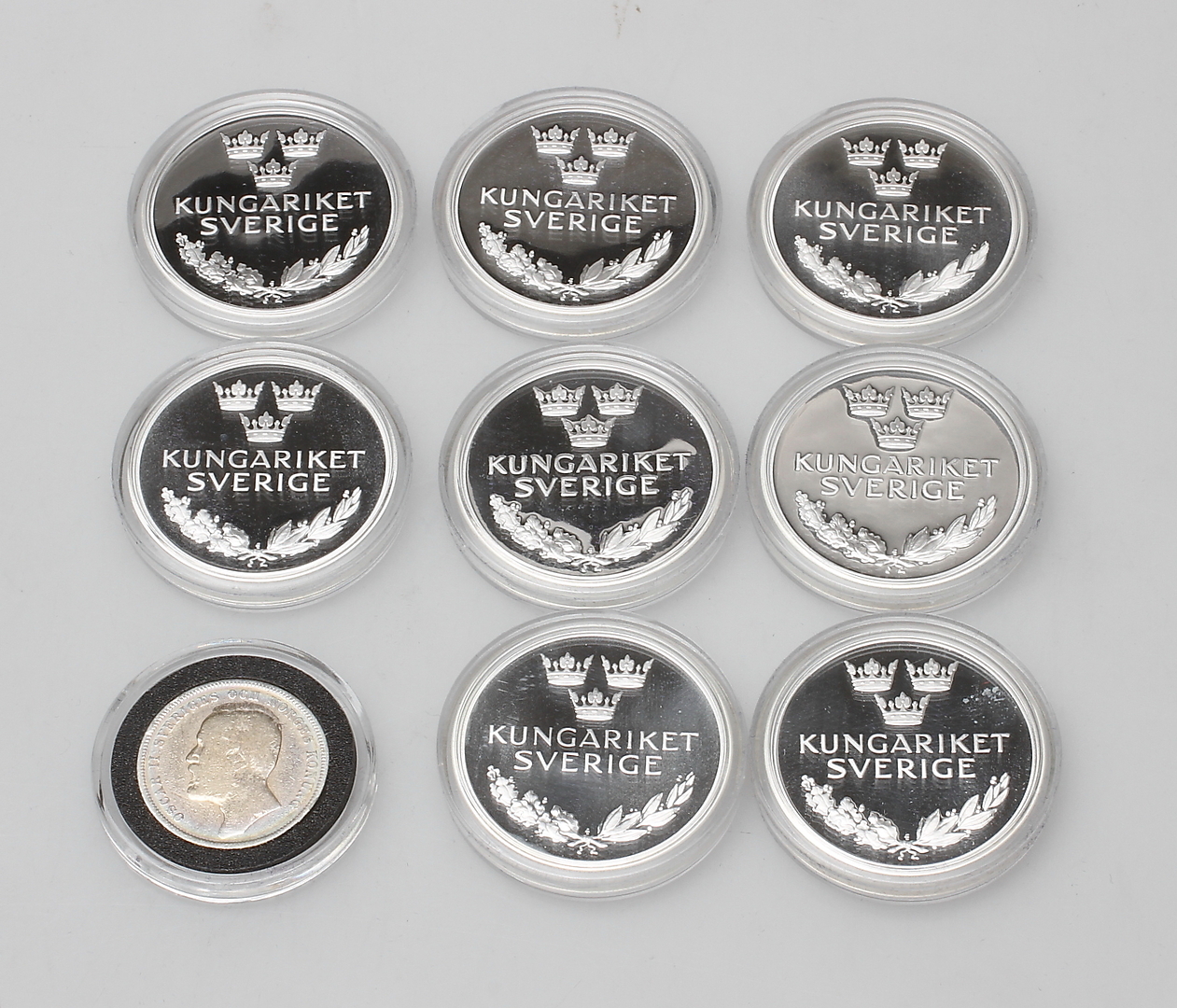 206245. MØNT, 9 stk, Sverige, Sølv, ca. 220 gram.