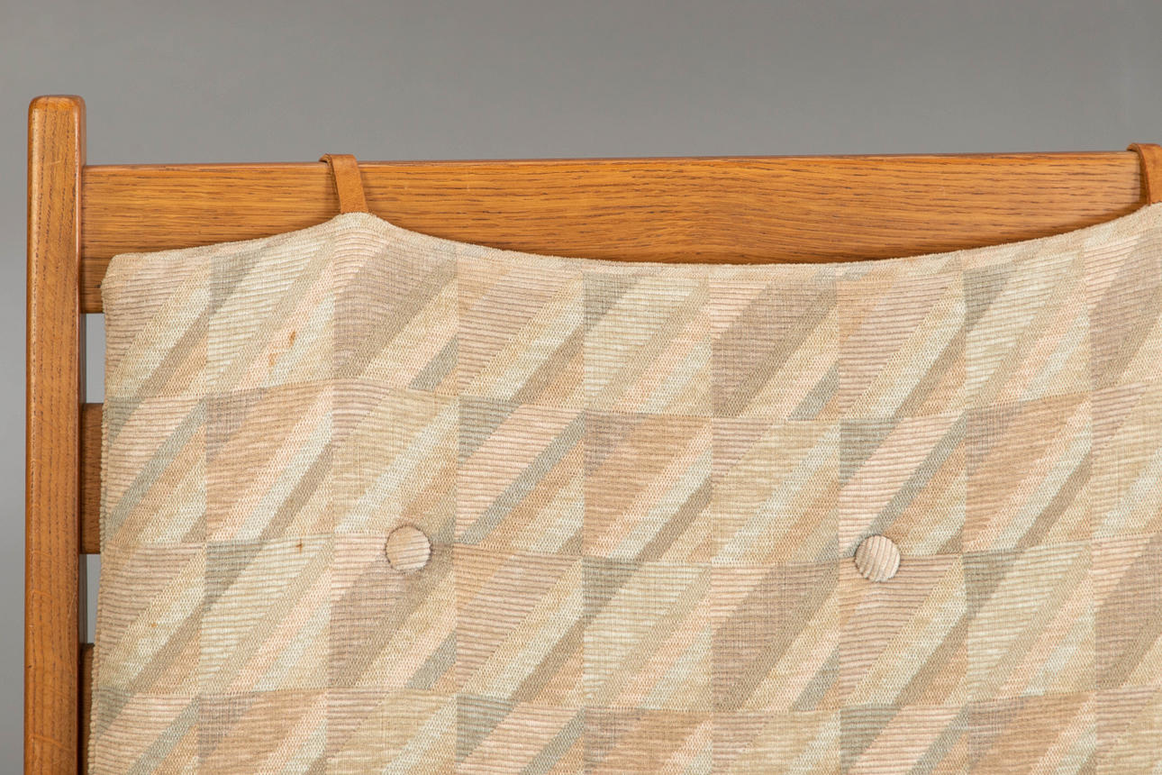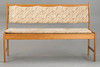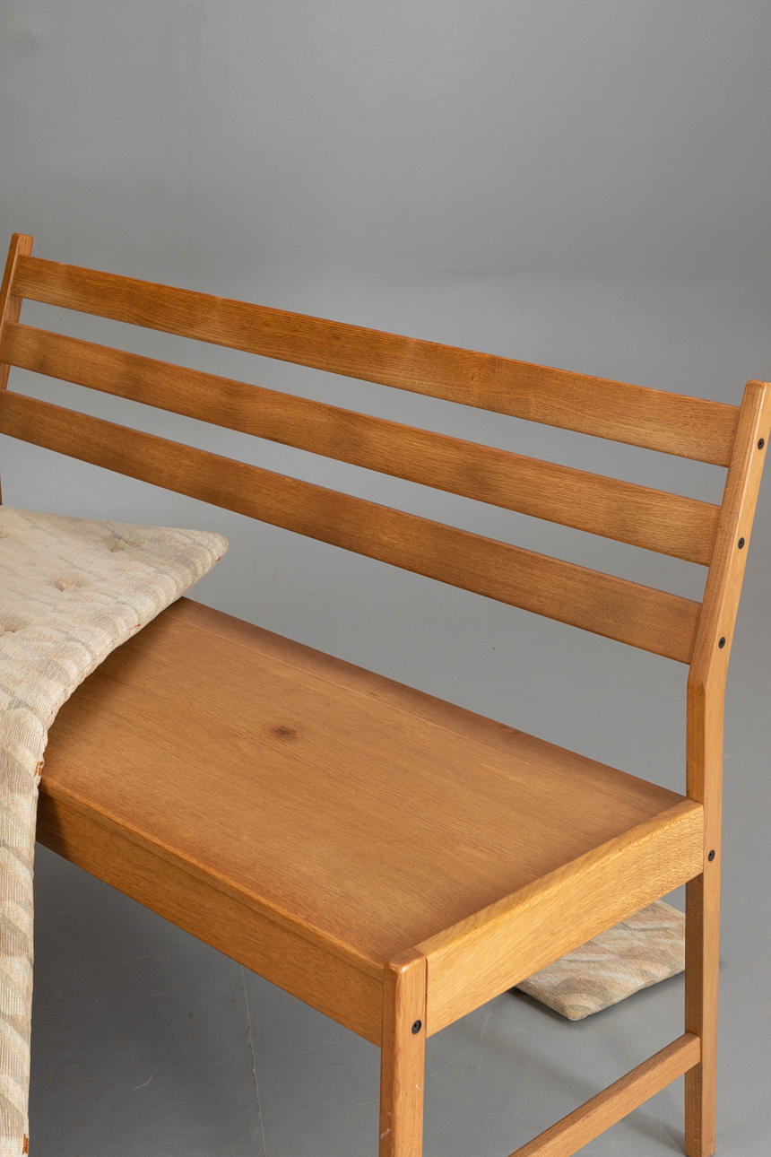 Dansk design, 1960'erne. Massiv eg. Aftagelige polstrede hynder i let, mønstret stof. Bænk HxBxD: ca. 92x144x52cm / stol HxBxD: 92x50x48cm.