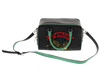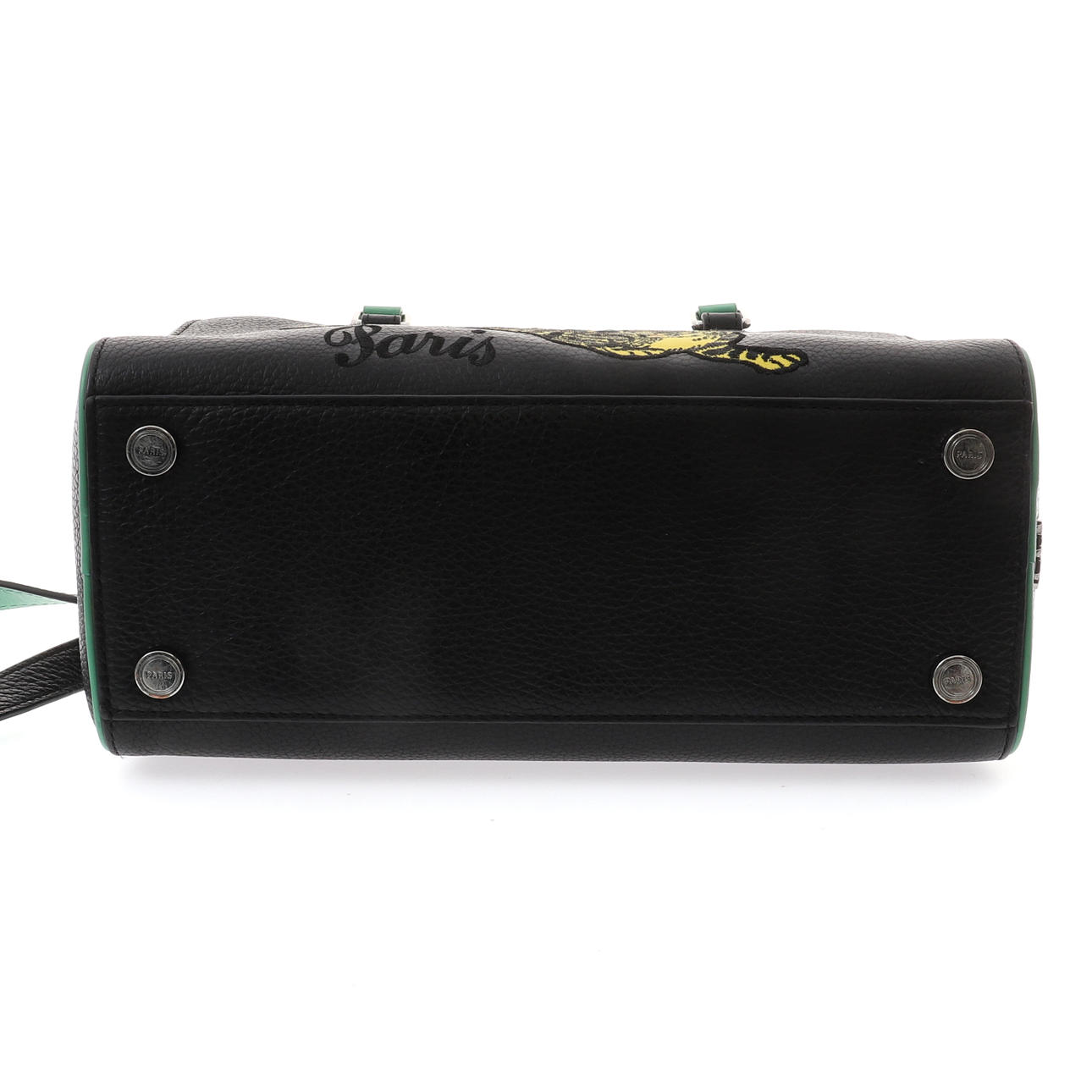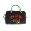 den sorte taske med en tiger foran og 'Kenzo' i et rødt banner, 'Paris' foran på tasken under tiger, tasken med grønne hanke og skulderrem og piping foran på tasken, interiøret med lommer med grønt rør og en lille grøn lomme, 28,5 cm lang x 19 cm høj x 10 cm dyb.