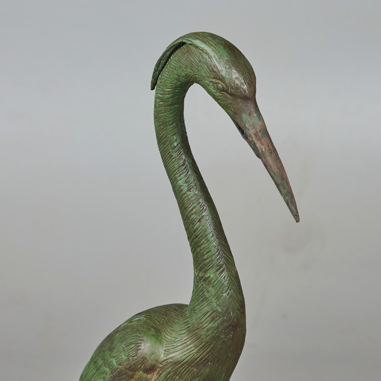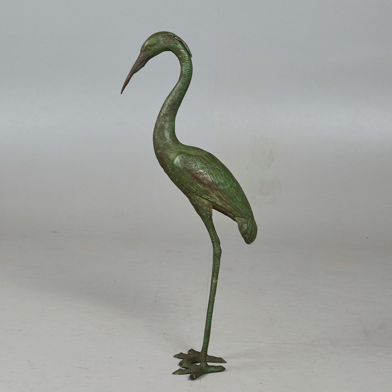 Skulptur / figur, grå hejre, bronze. Grøn patineret bronzefigur indeholdende kobber forestillende en grå hejre, H.105cm, L.44cm, B.18cm.