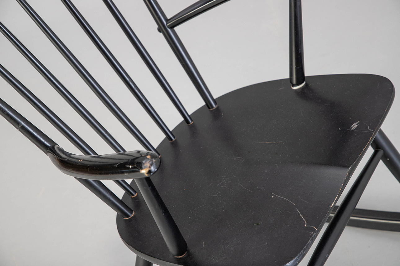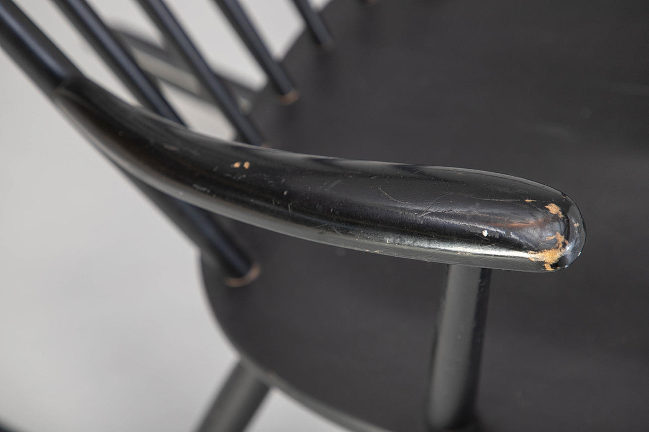 Fremstår med brugsspor, ridser på sædet, slid på armlænene. Ryglænet er gået lidt af.