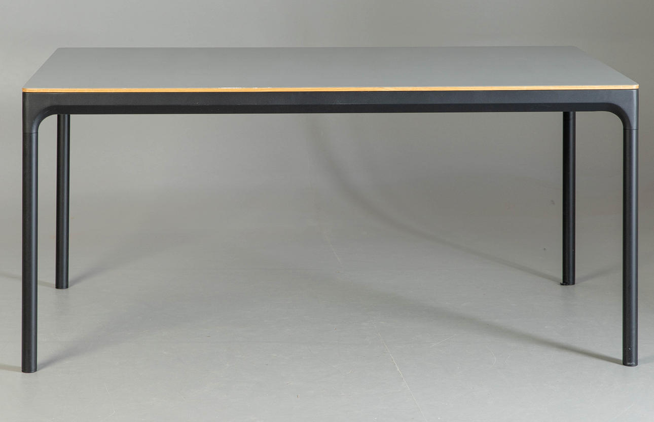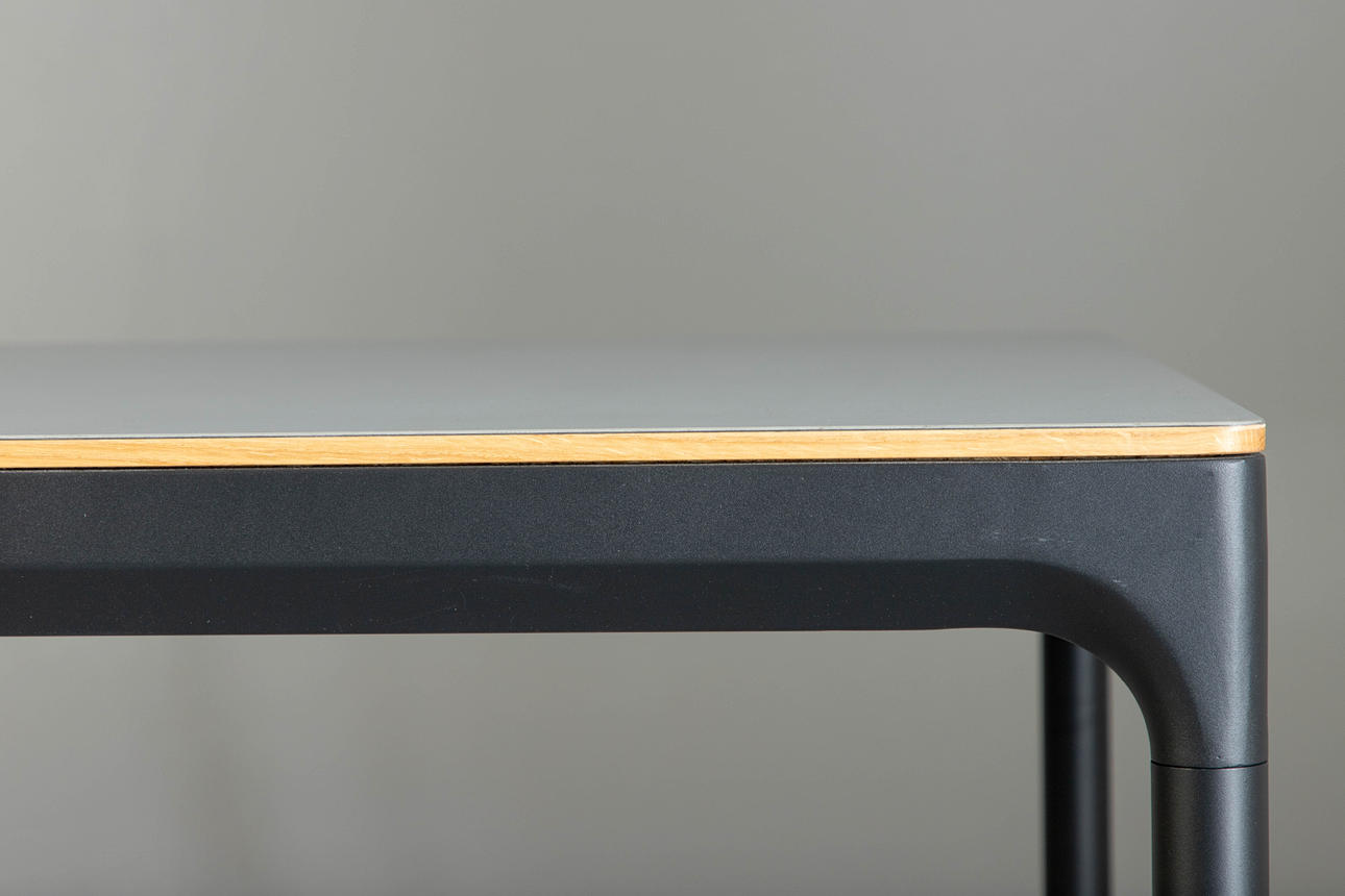 Bord 'Four' af Houe, dansk design. Stel af pulverlakeret aluminium i sort og bordpladebelægning af grå linoleum med olierede egekanter.
