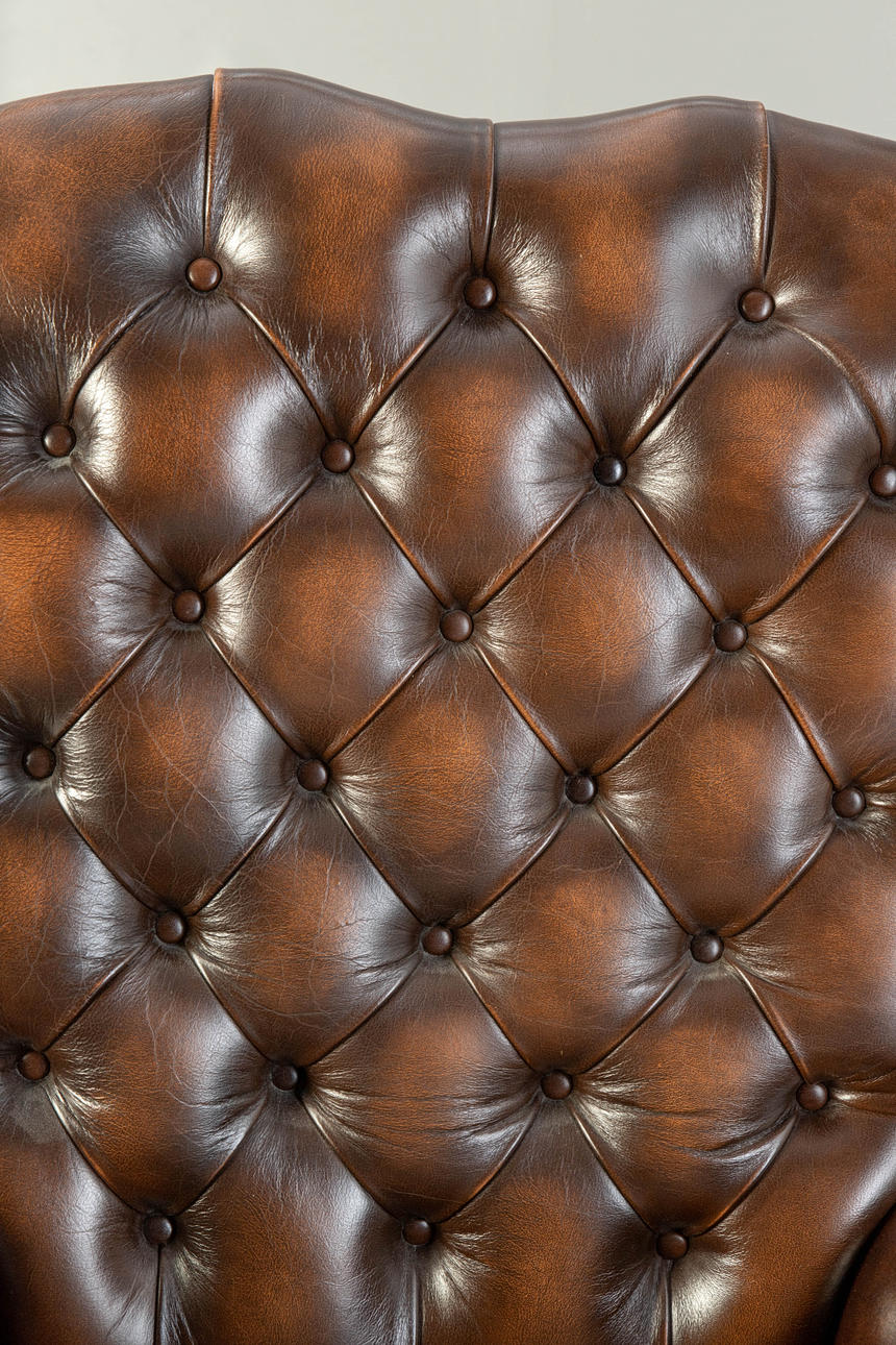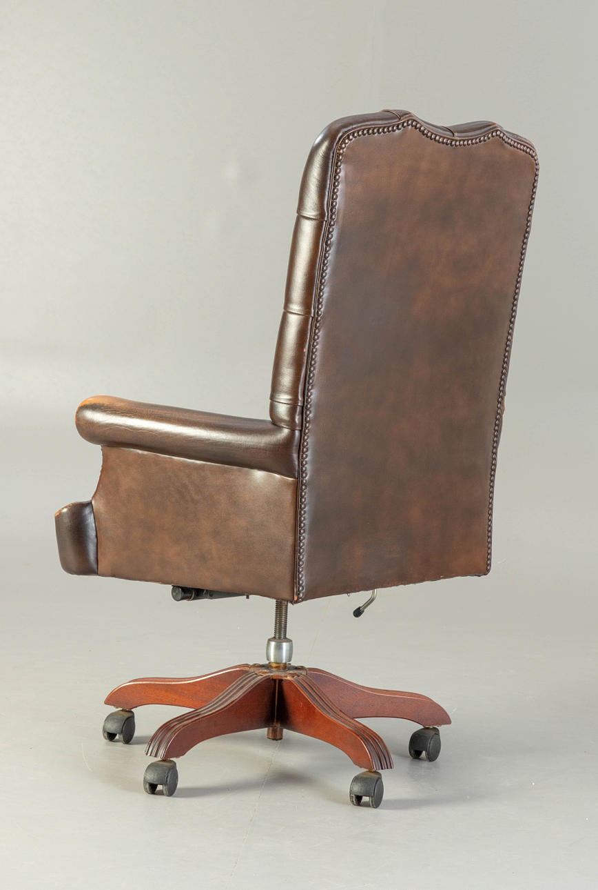 træ/brunt læder. Den fuldt polstrede krop med konisk sæde og højt ryglæn på en profileret femstjernet base på plasthjul, tuftede. C-formede buede armlæn. Kanter med dekorative søm. drejefunktion. HxShxBxD: ca. 119x48x75x63 cm.