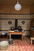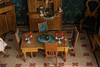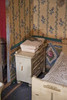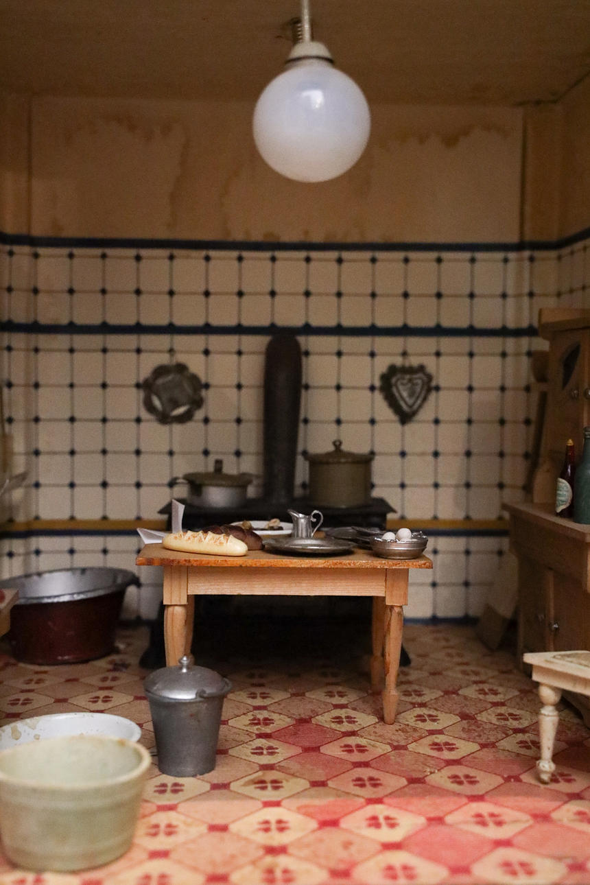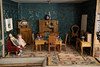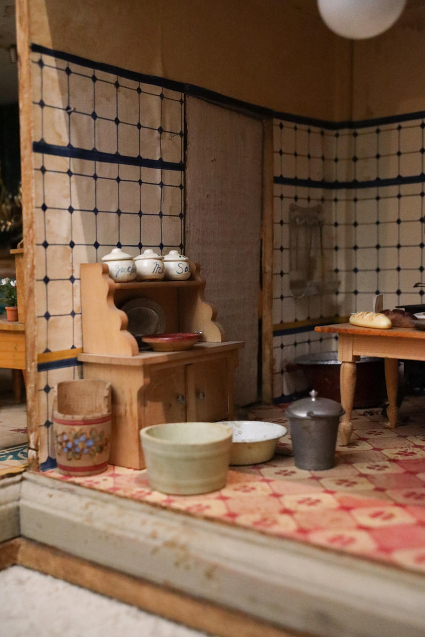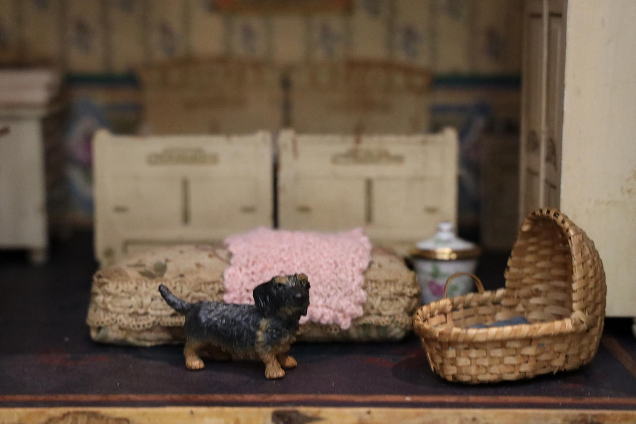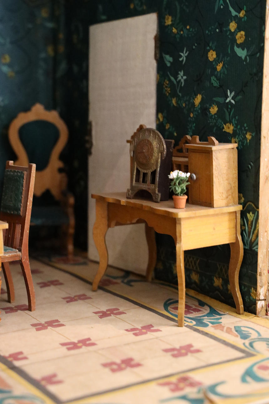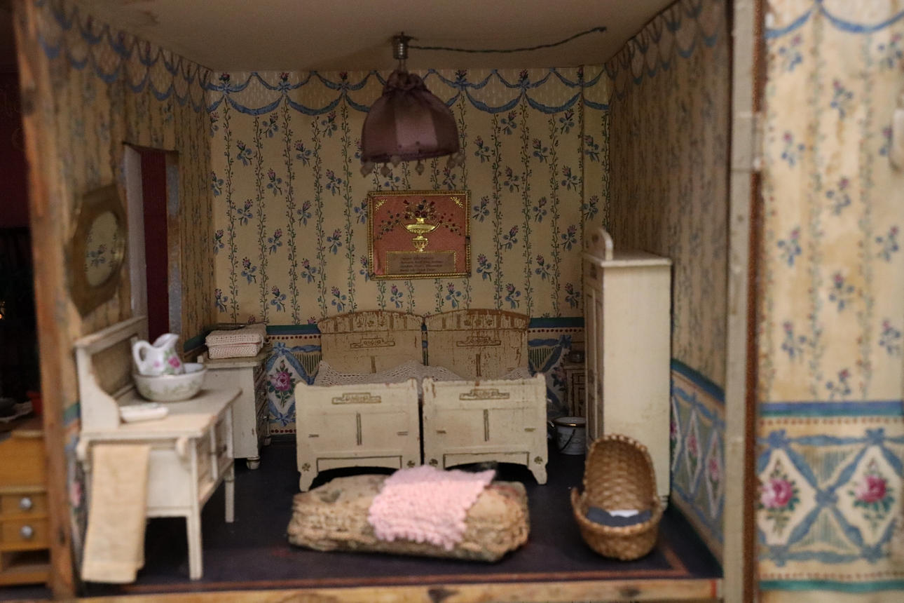 Håndmalet tapet og gulve. Tyske møbler i lyst træ. Dukker i forskellige materialer.