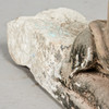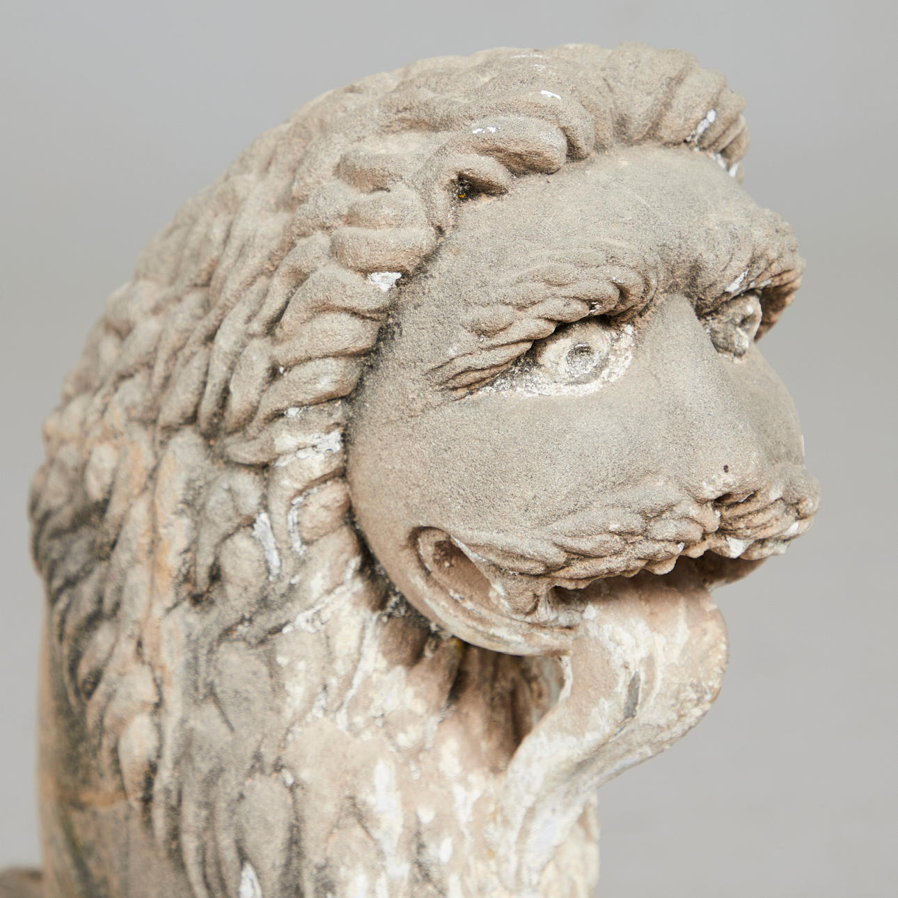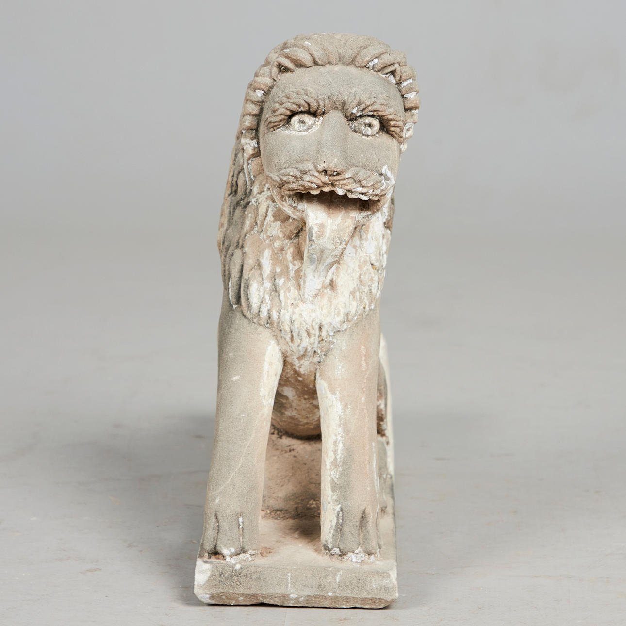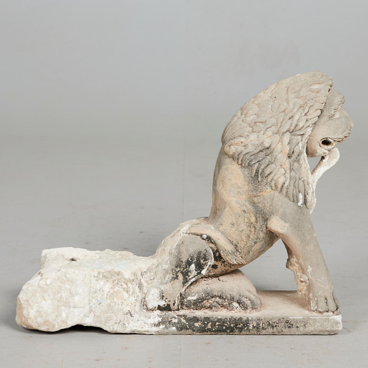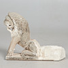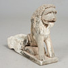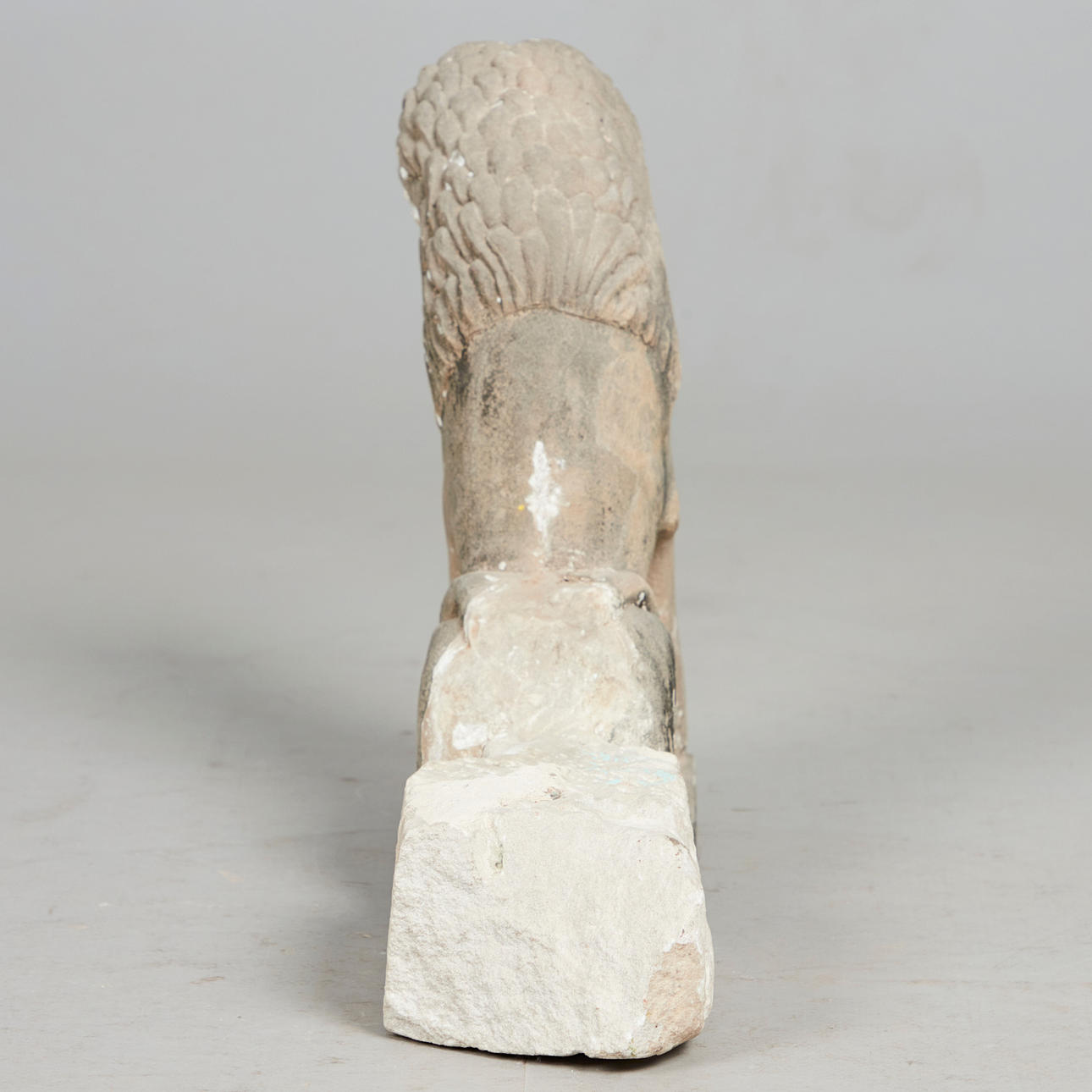 Skulptur / figur, løve, sandsten, Indien. Arkitektonisk fragment i sandsten, der forestiller en løve i en sammenkrøbet stilling, med en lang manke og udtalte knurhår, H.41cm, B.60cm, D.18cm.