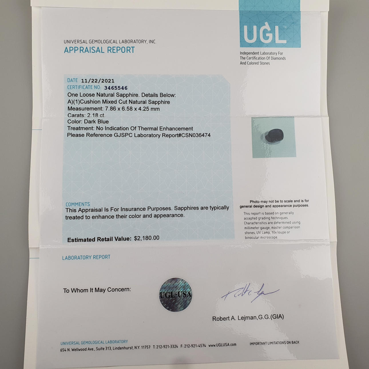 2.18ct Blue Sapphire, certifikat UGL 3465546, forsikret værdi ifølge certifikat: $2.180.