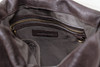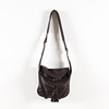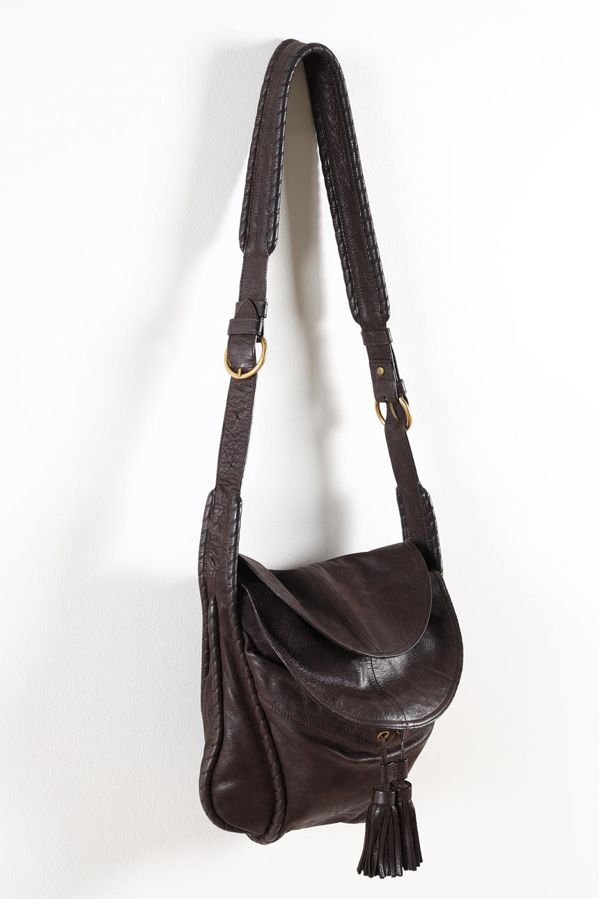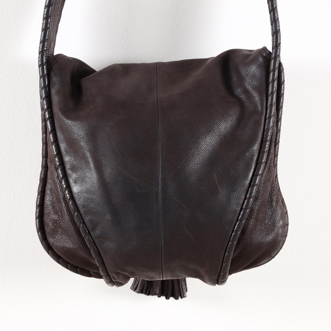 Skulderremstaske i brunt læder. Dobbelt låg med hovedrum og udvendigt rum med kvaster. Interiør i brunt tekstil med 2 åbne mindre siderum og et siderum med lynlås. Mål ca ekskl. skulderrem, 32x33 cm.