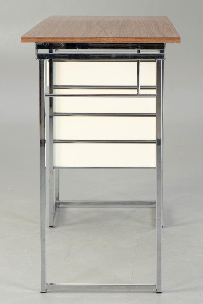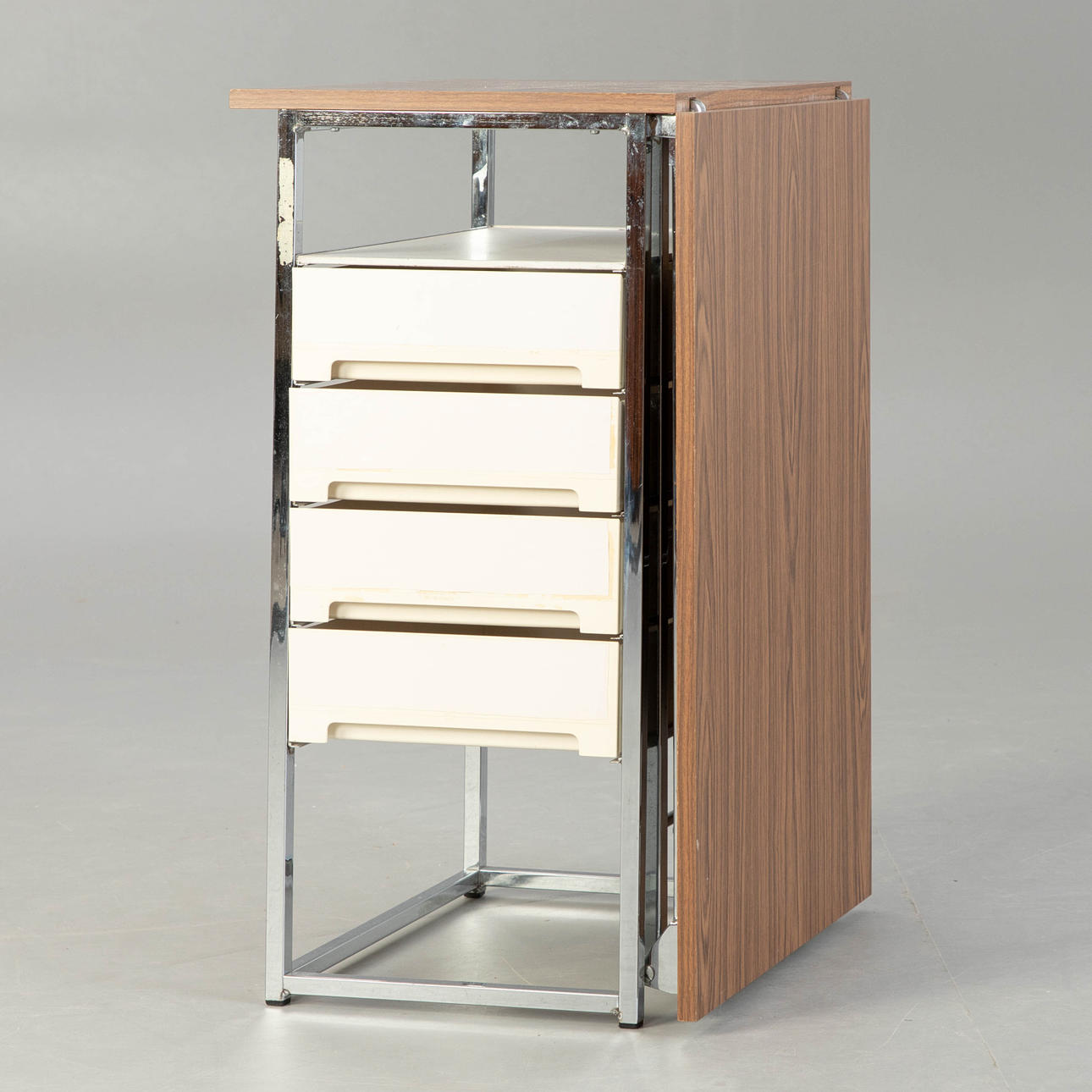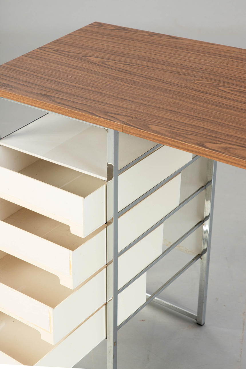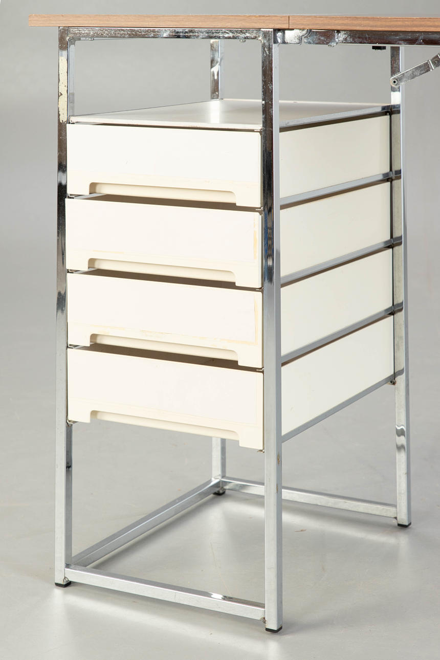 smalt klapbord af plast og forkromet stel, 1970'erne. Bordplade belagt i valnøddelook, 4 skuffer i hvid plast.