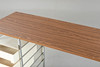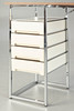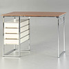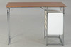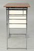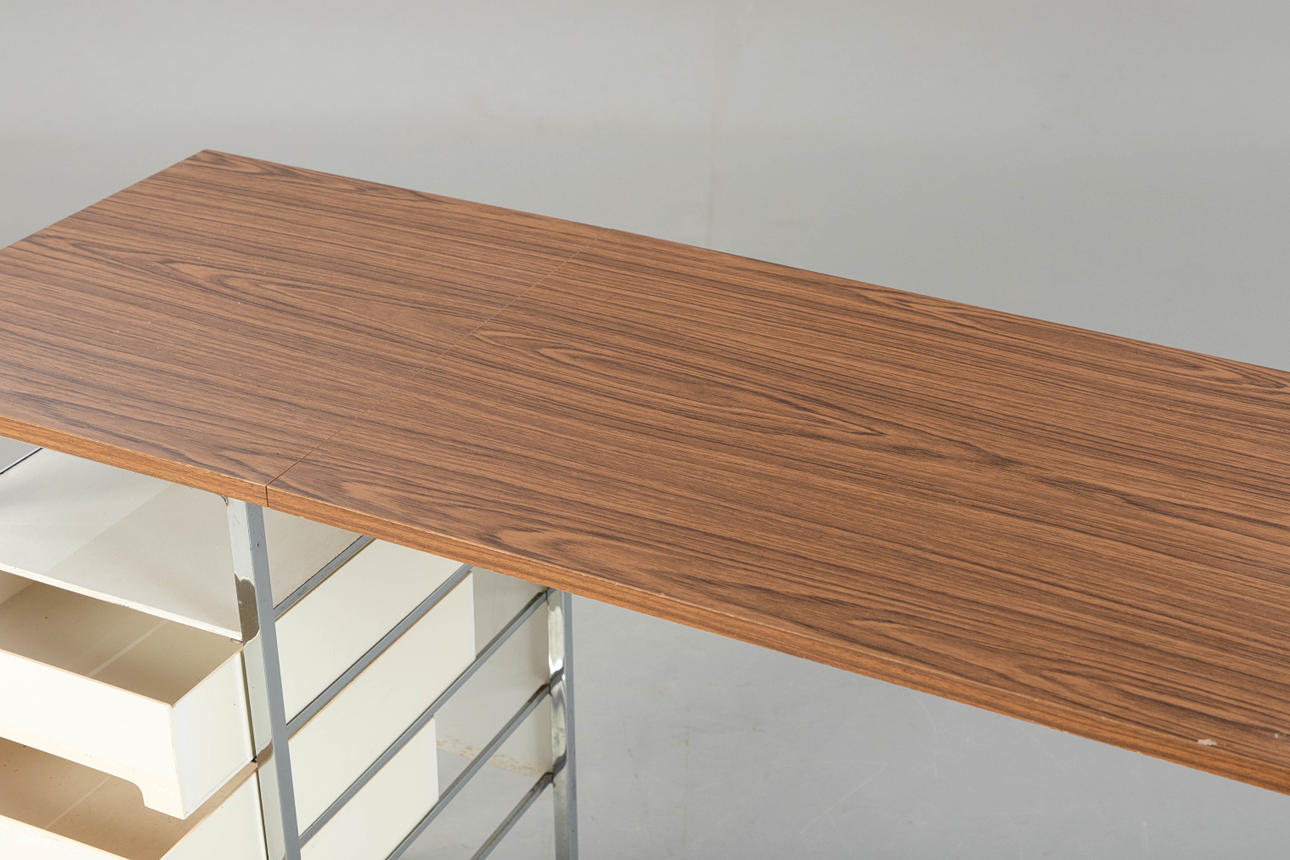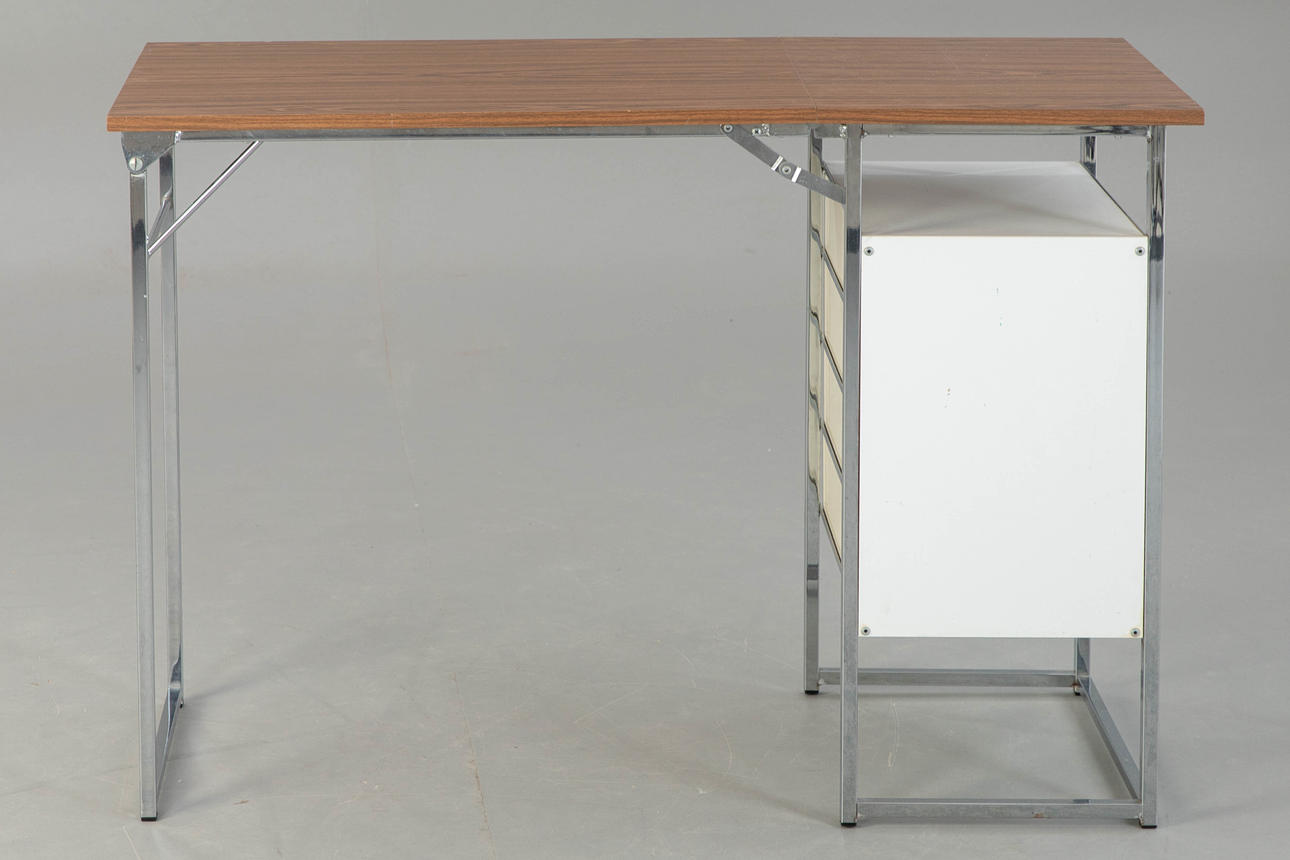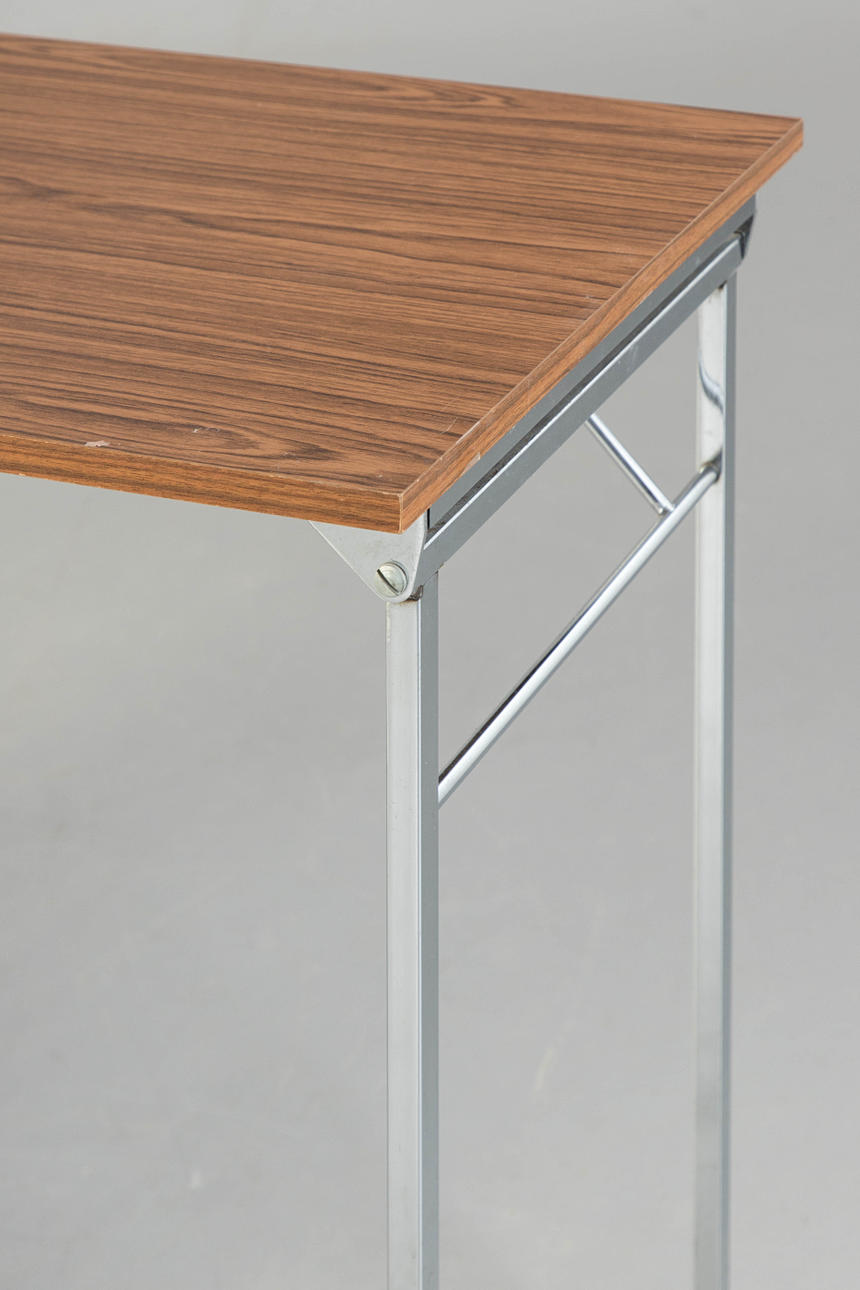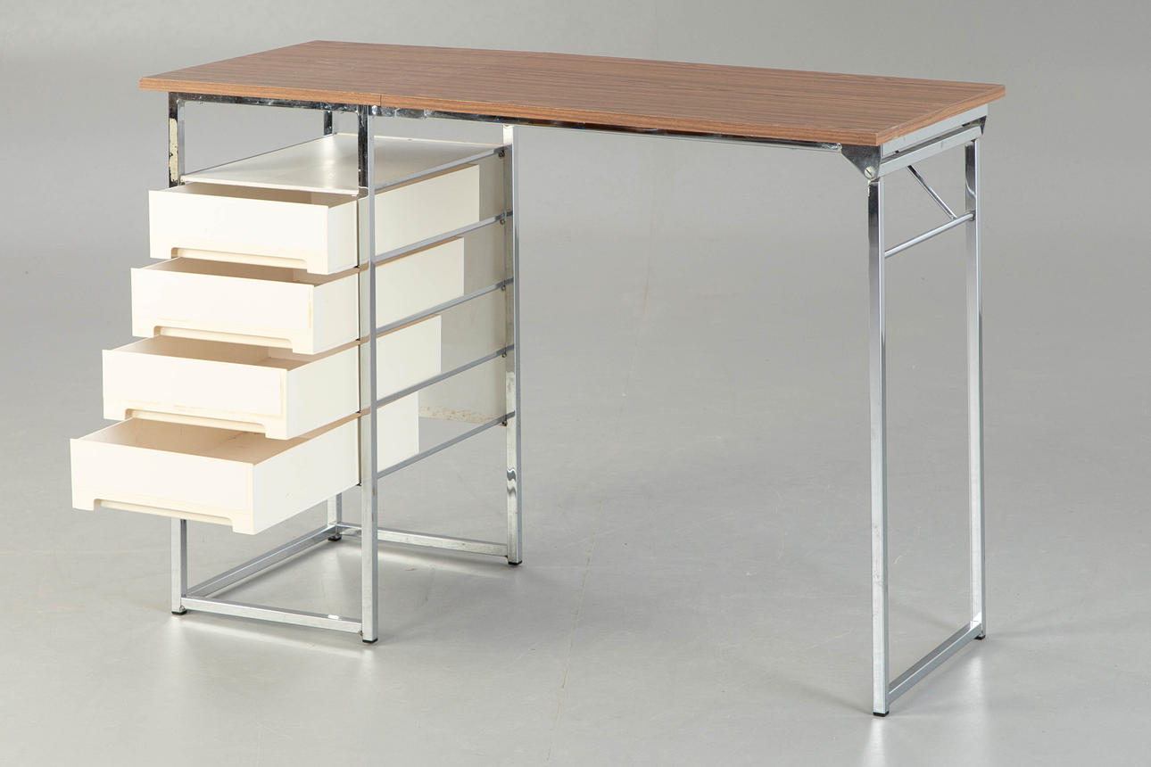 smalt klapbord af plast og forkromet stel, 1970'erne. Bordplade belagt i valnøddelook, 4 skuffer i hvid plast.