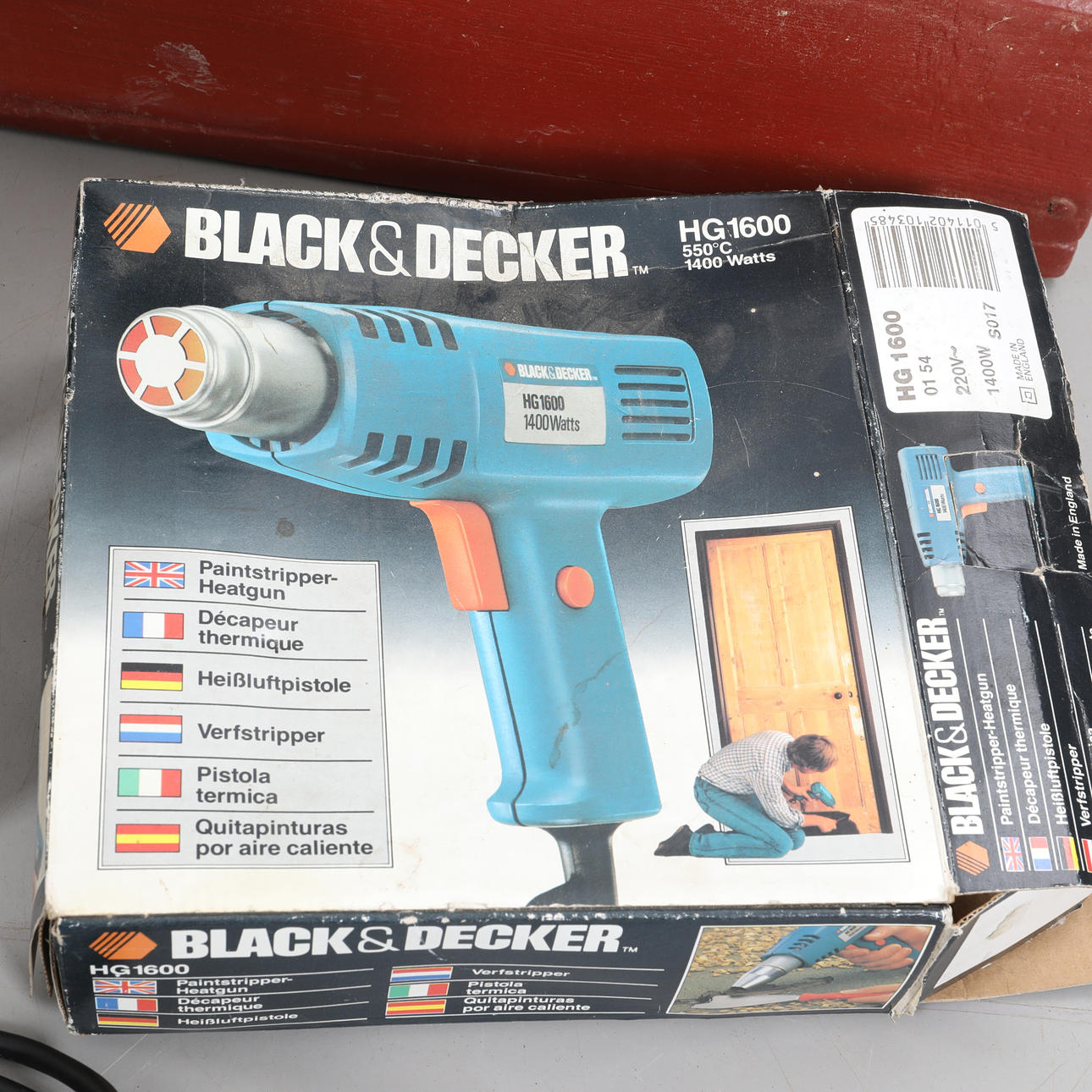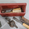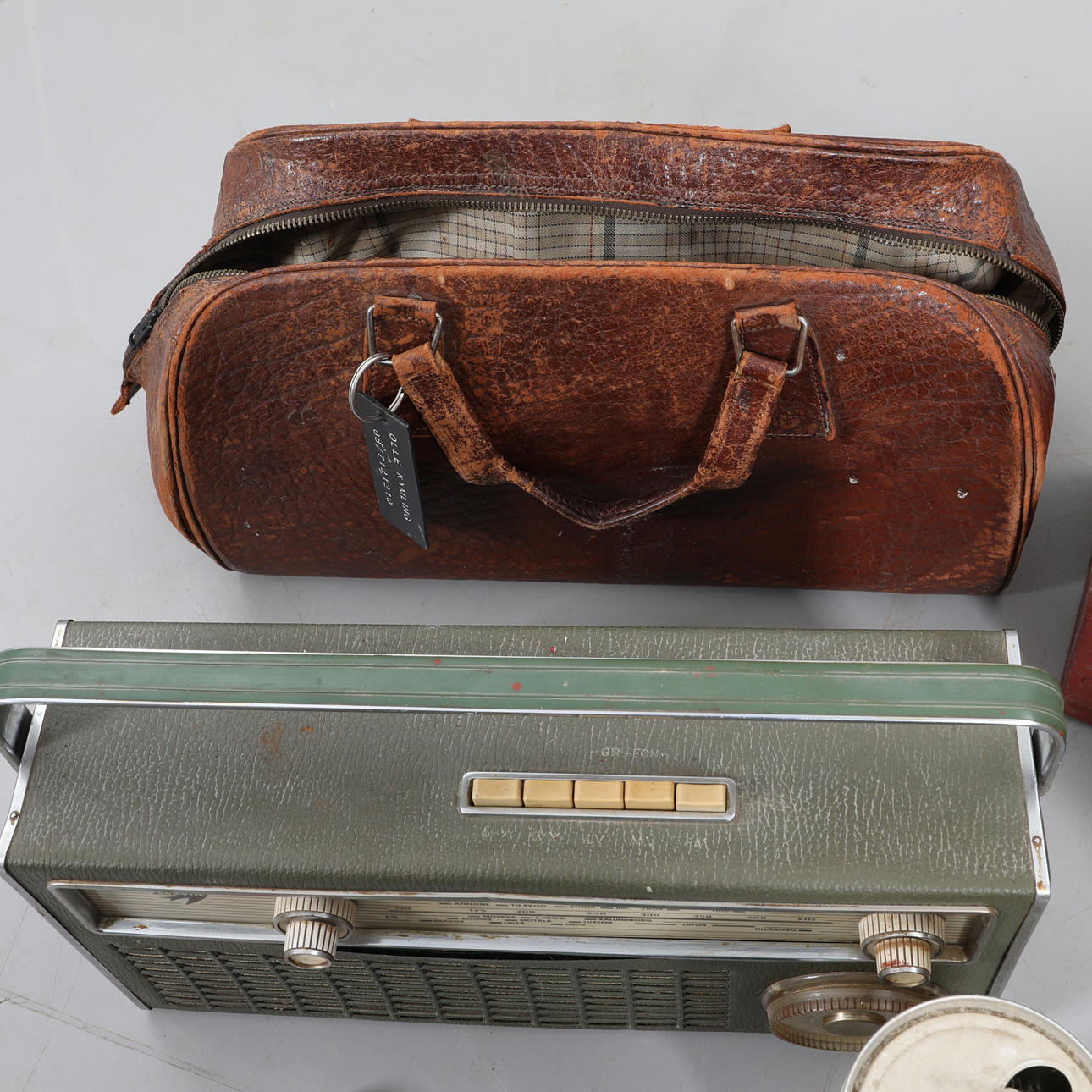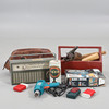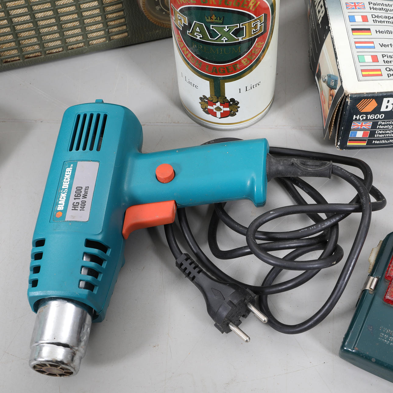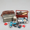 taske, værktøjskasse med diverse værktøj, lommelygter, dåse, primusbrænder, varmepistol, radio Skantic.