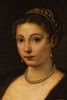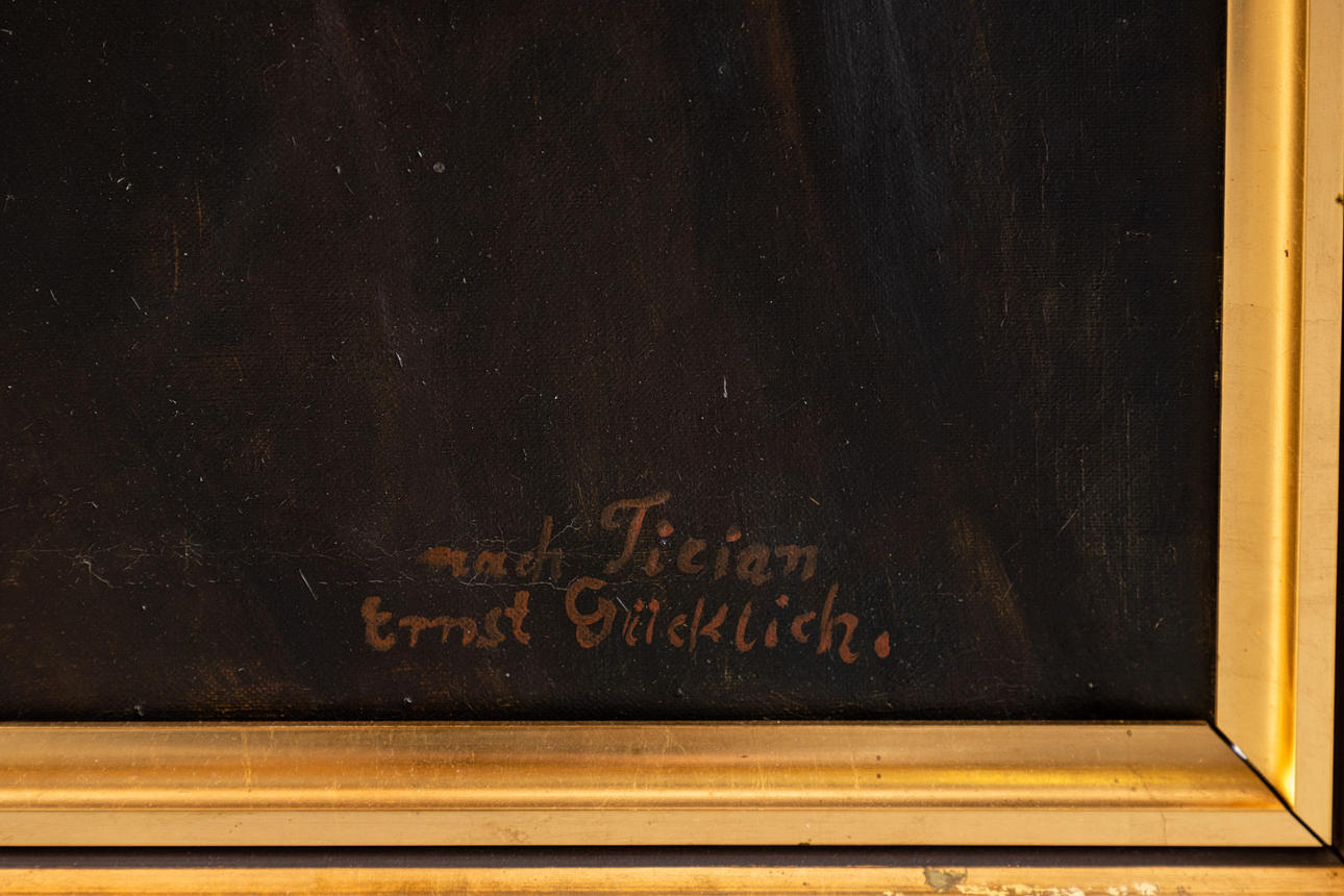 Ernst Glück, kopi efter Tizian 'Pigen i pels', olie på lærred, første halvdel af 1900-tallet, signeret 'Ernst Glück' og påskrevet 'efter Tizian', ca. 96 x 63 cm, med ramme ca. 112x80 cm.