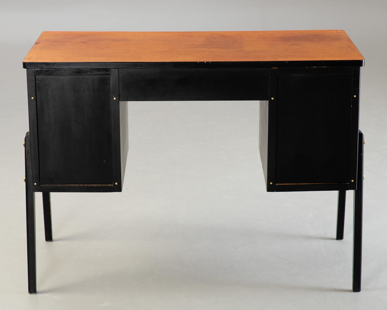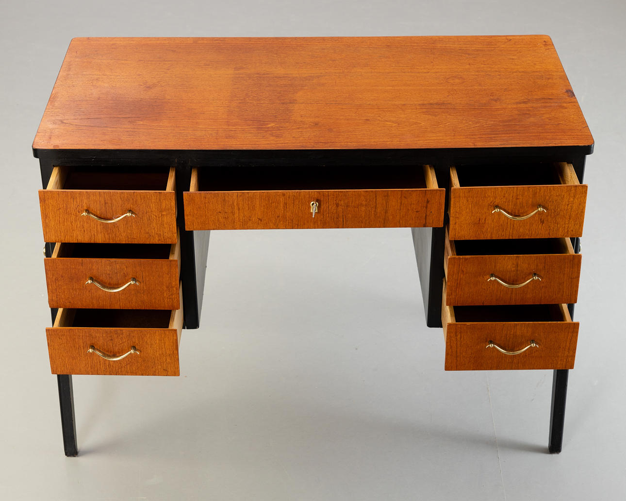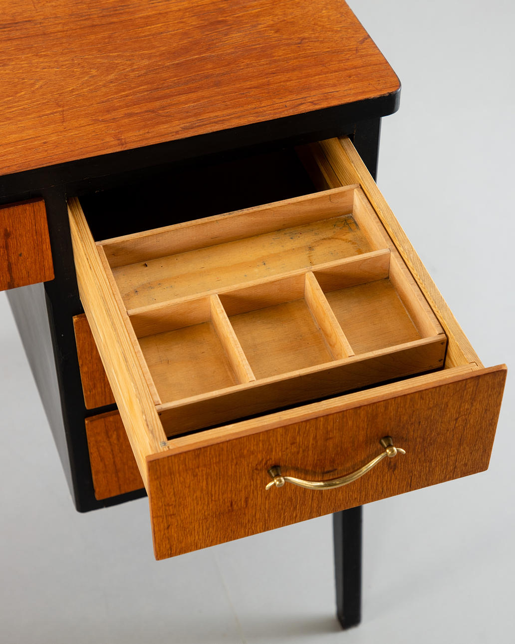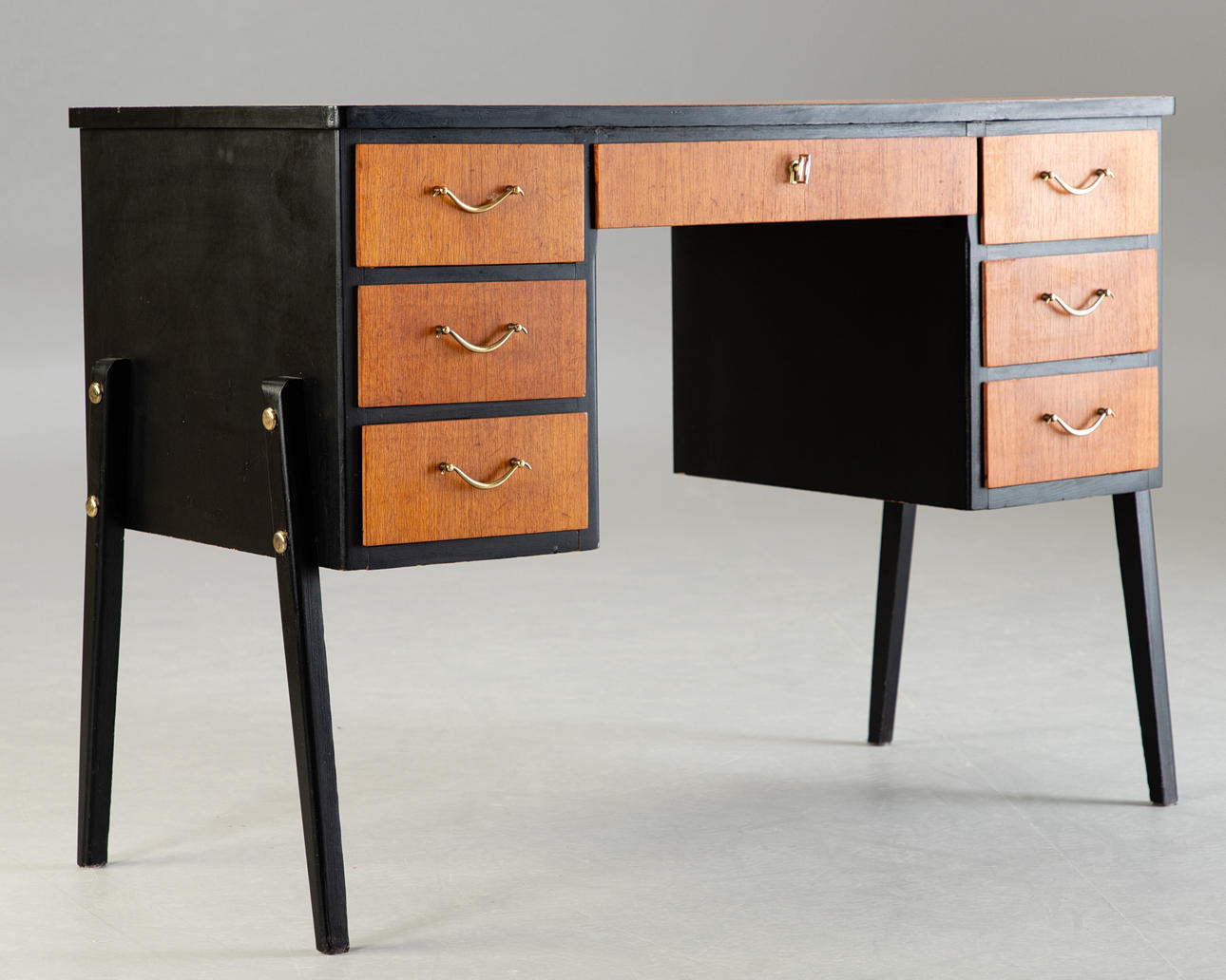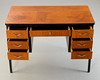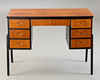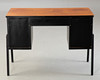 Lille skrivebord/sminkebord. 2. halvdelen af det 20. århundrede. Skrivebord med 7 skuffer, en aflåselig. Massivt træ, delvist malet sort.