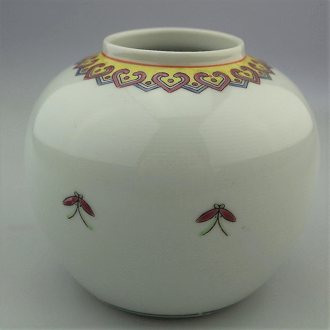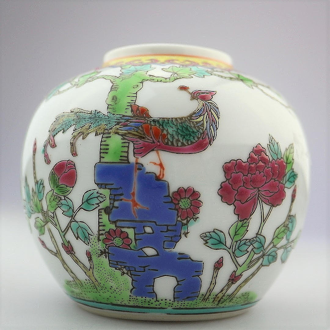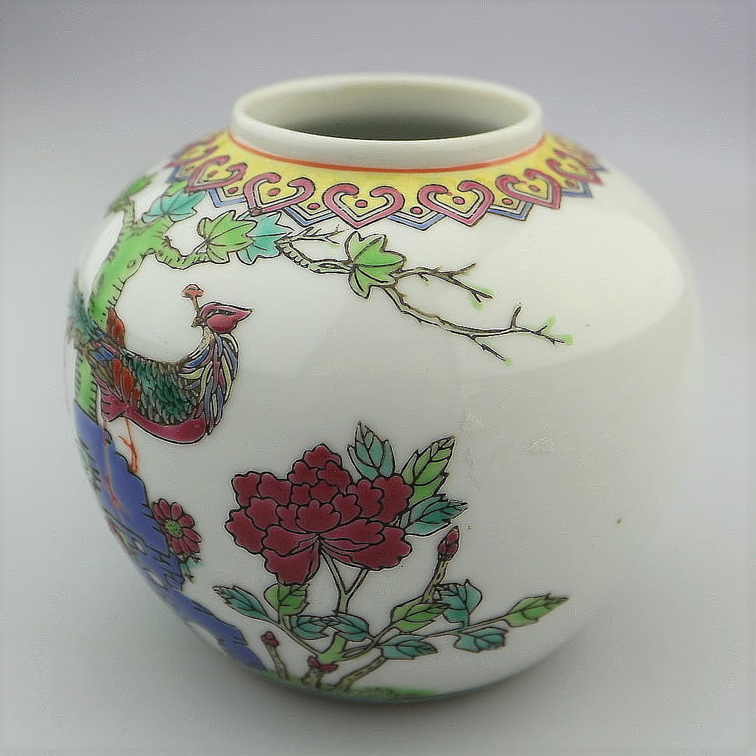 Kinesisk vase med fuglemotiv, håndmalet, højde: 10 cm, med stempel.