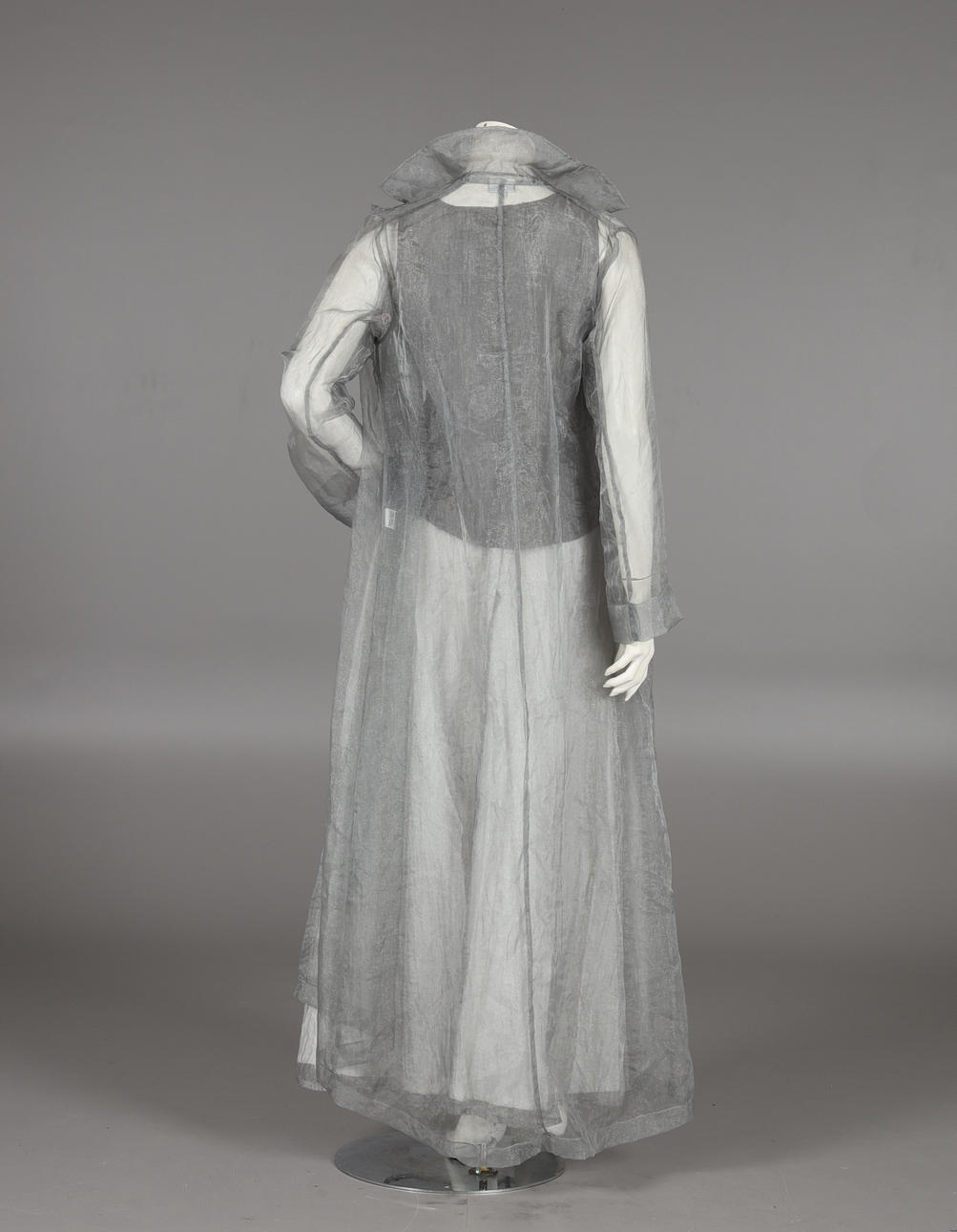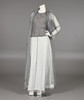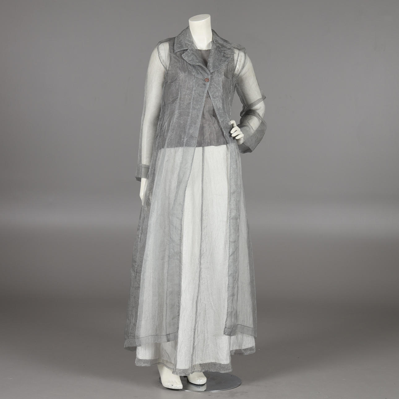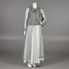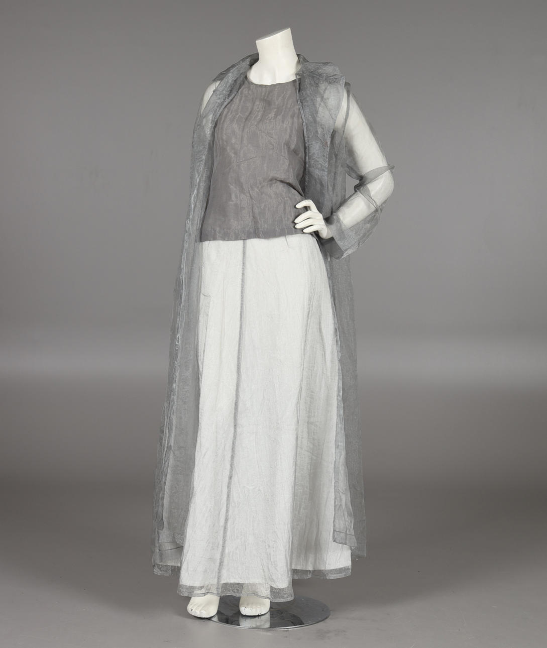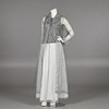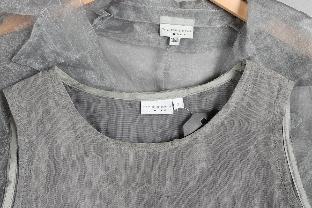 Top, nederdel og frakke, str. 38. Linned i bomuld og kobbertråd. Frakke og nederdel i tynd grå taft. Nederdelængde ca 103 cm. Taljemål ca 70 cm.