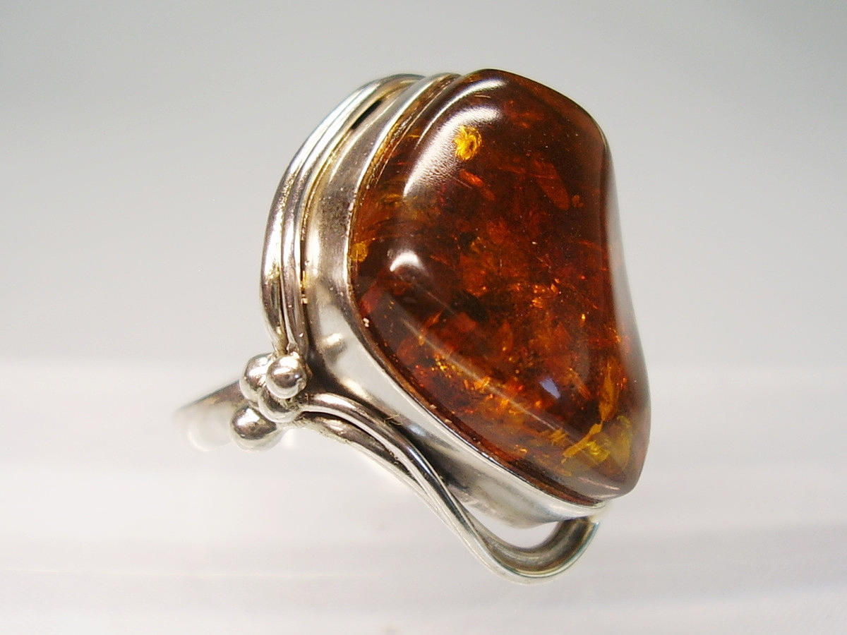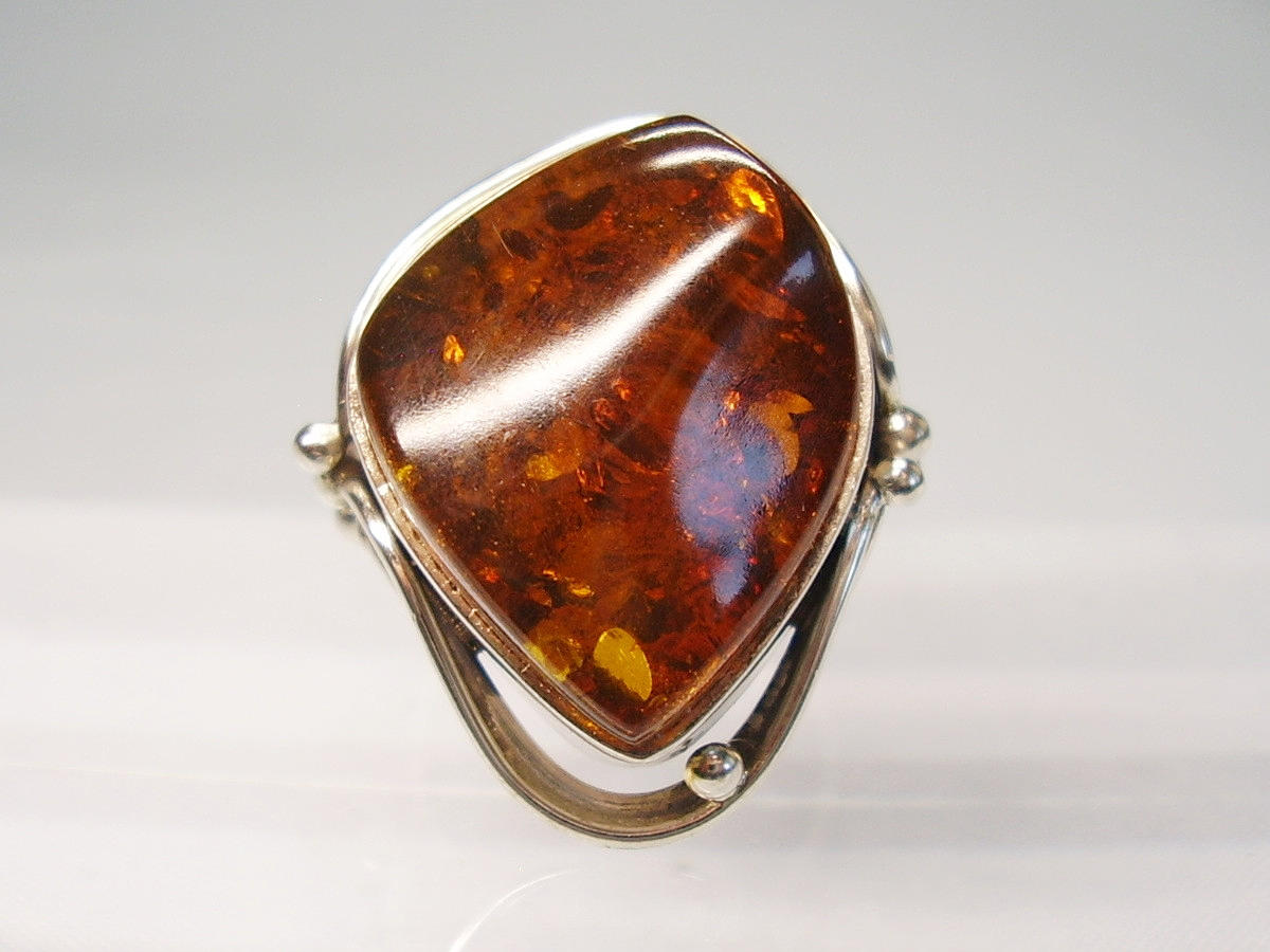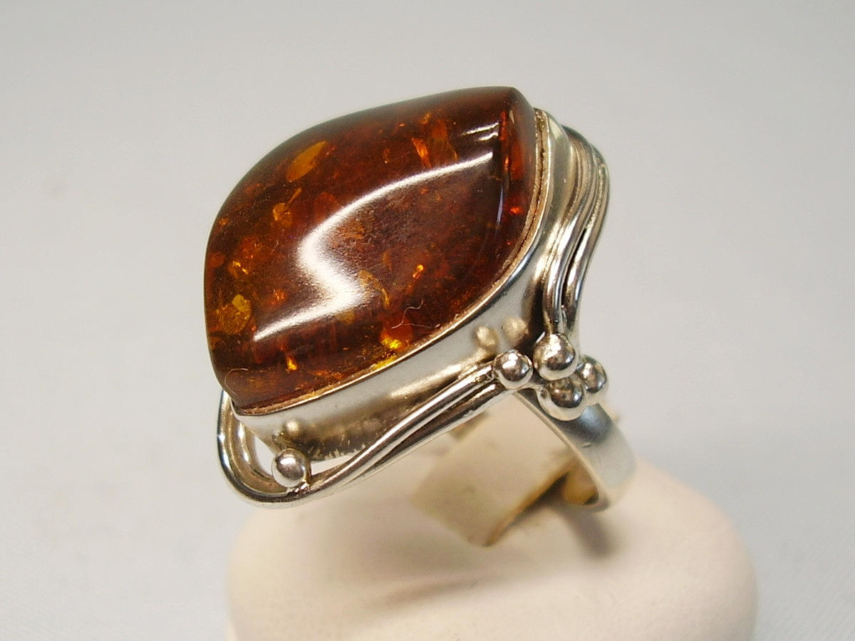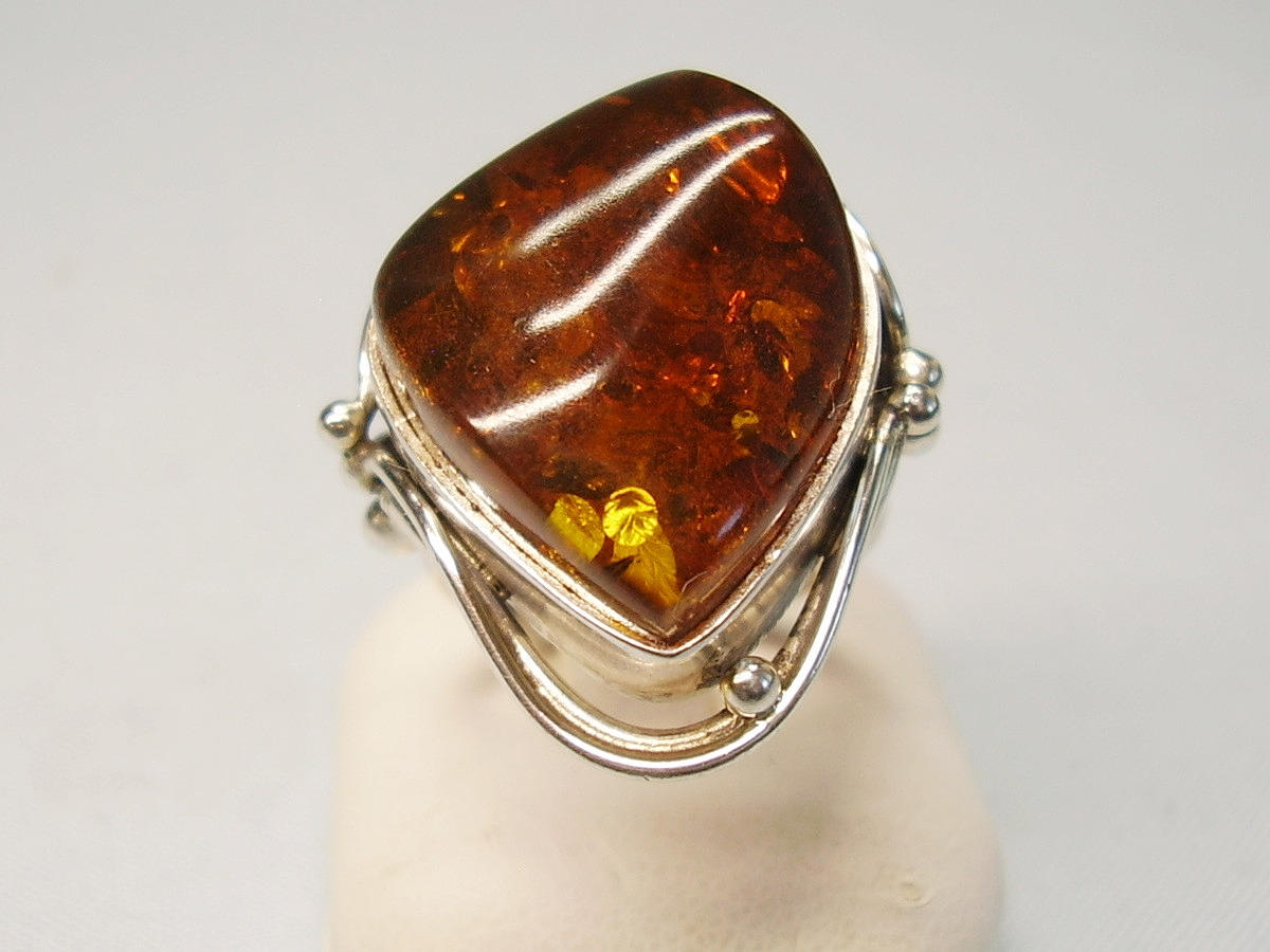 Den er sat med en poleret honningrav cabochon med en smuk, gennemsigtig farve og naturlige indeslutninger.
