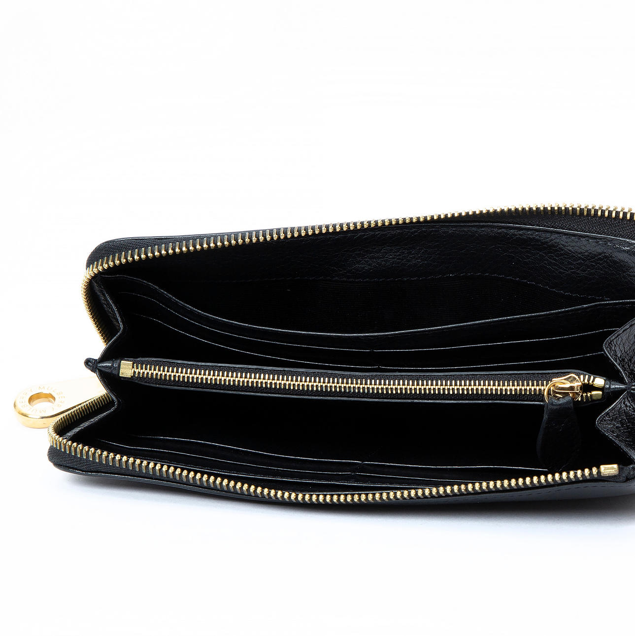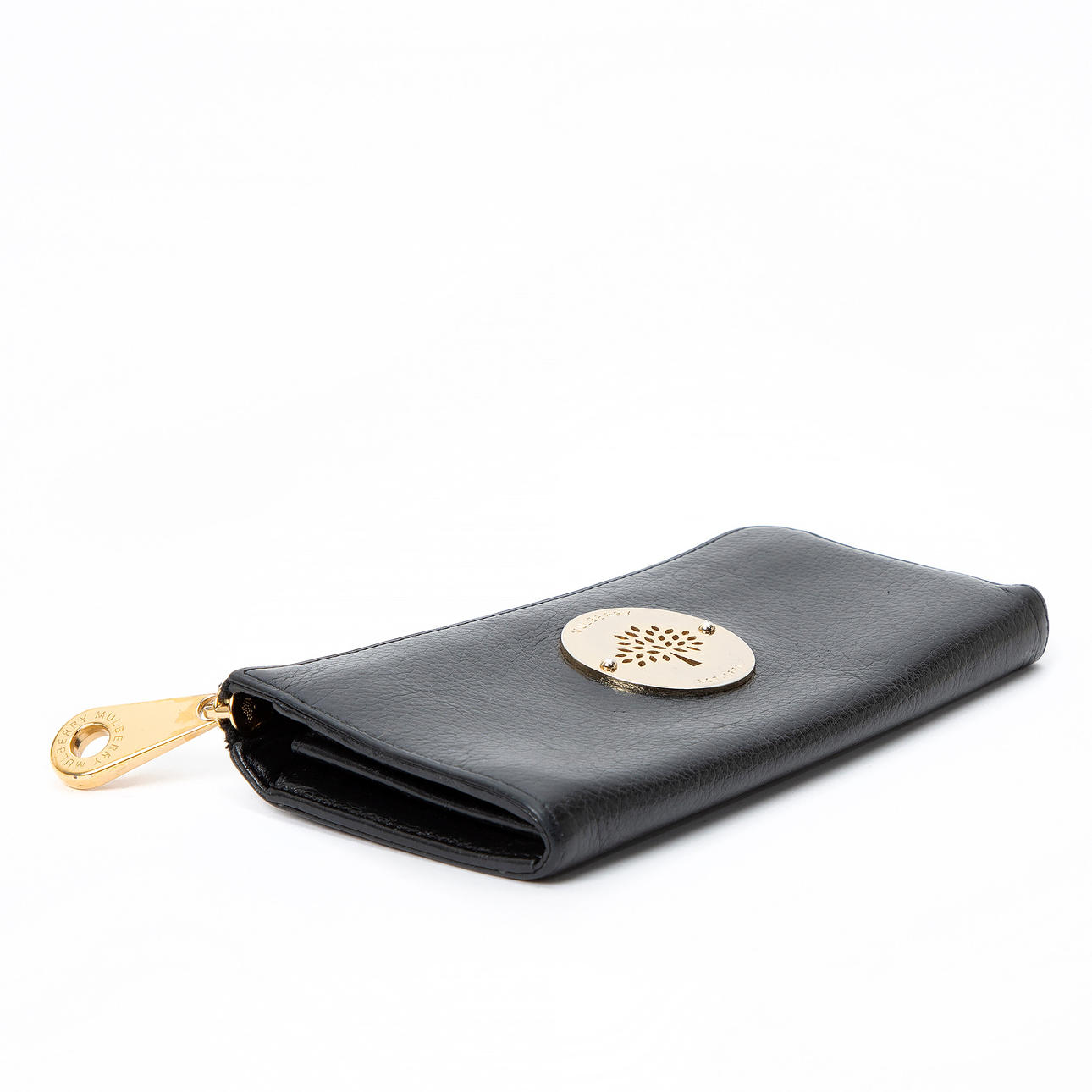 Sort læder. Indvendig med et rum til køer og et rum med lynlås. Mærket "Mulberry". Længde 20 cm, højde 9 cm.