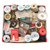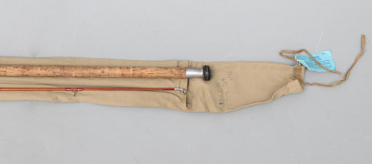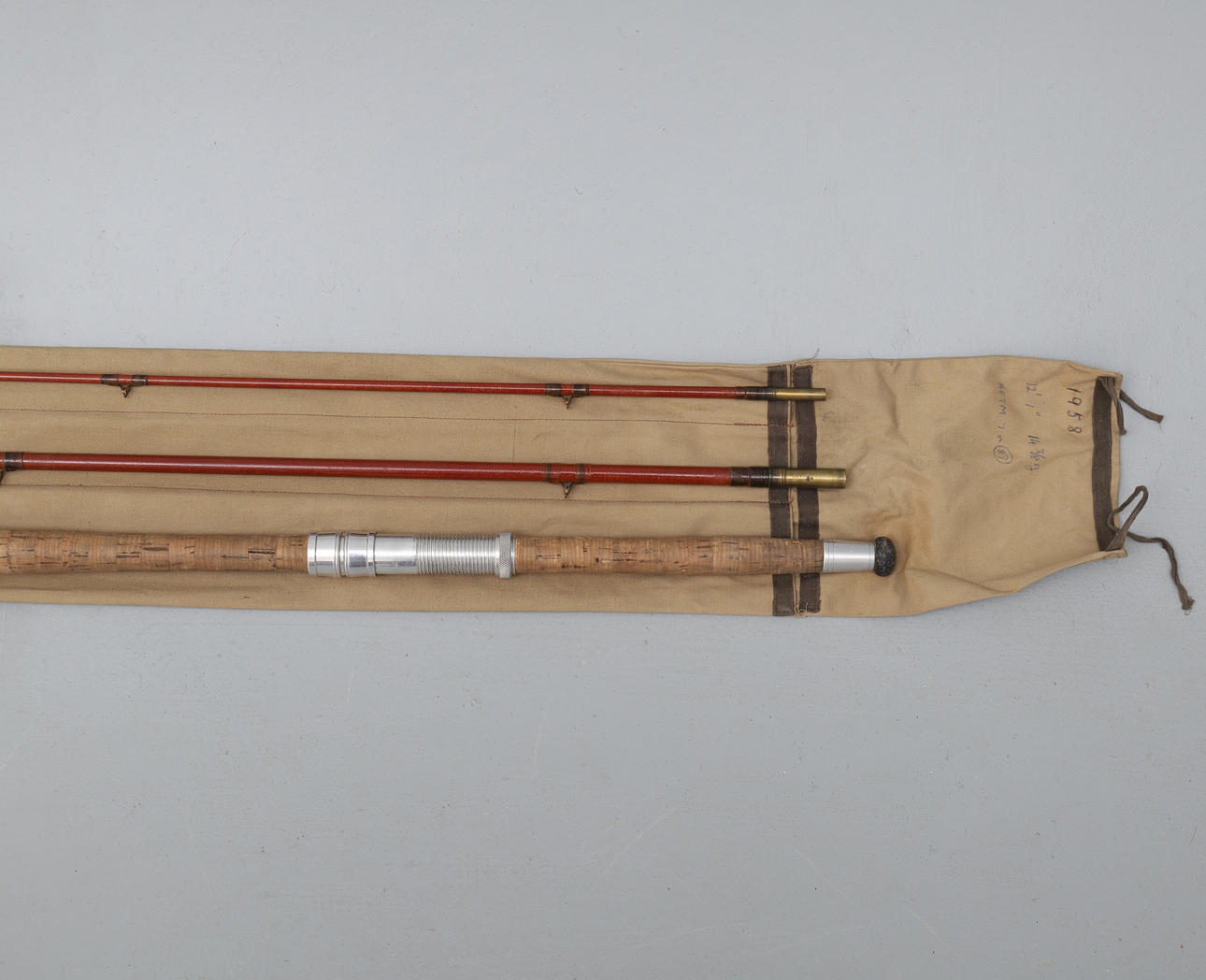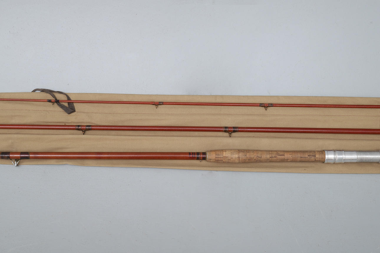 130 cm lang, i en bæretaske i lærred; AE Rudge & Son, Redditch, en 'The Dorchester' todelt fiskespinnestang, 158 cm lang, i en bæretaske af grøn lærred; Edgar Sealey 7 Son Ltd, Redditch, en 'Octopus' todelt fluefiskestang, 125 cm lang, i en Edgar Sealey grøn kanvas bæretaske og en stor samling af delehjul med fiskesnøre, en samling vintage blyvægte, kroge, svirvler og andet fiskegrej (antal).