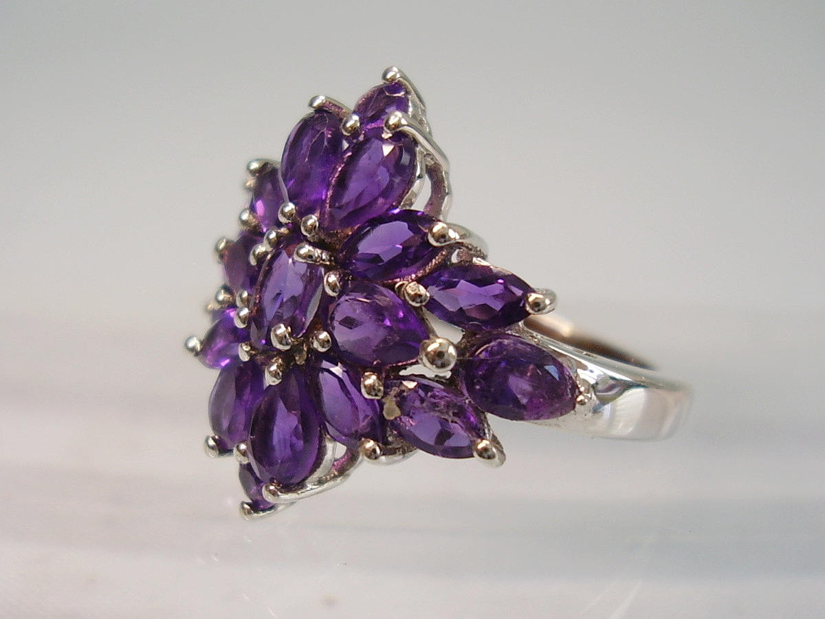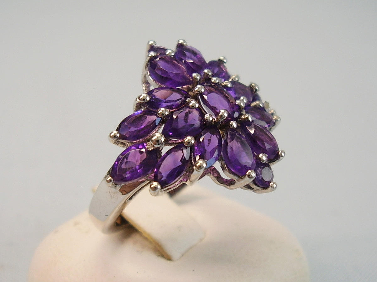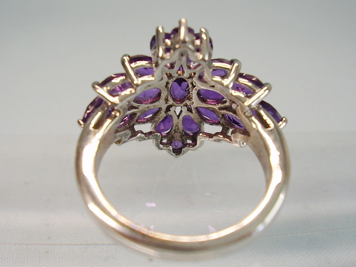 Ringhovedet er designet i form af en blomst og prydet med facetslebne ametyster. Disse har en karatvægt på mere end 3. ct.