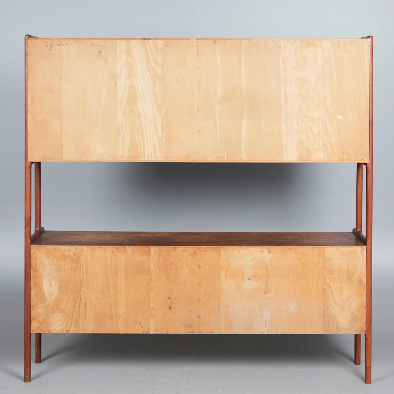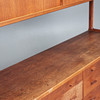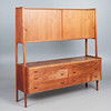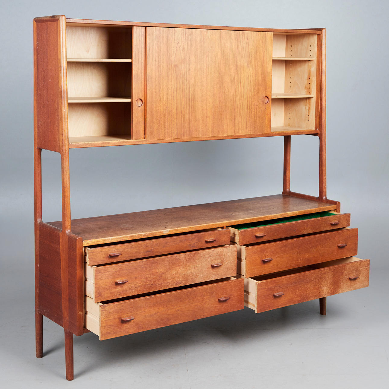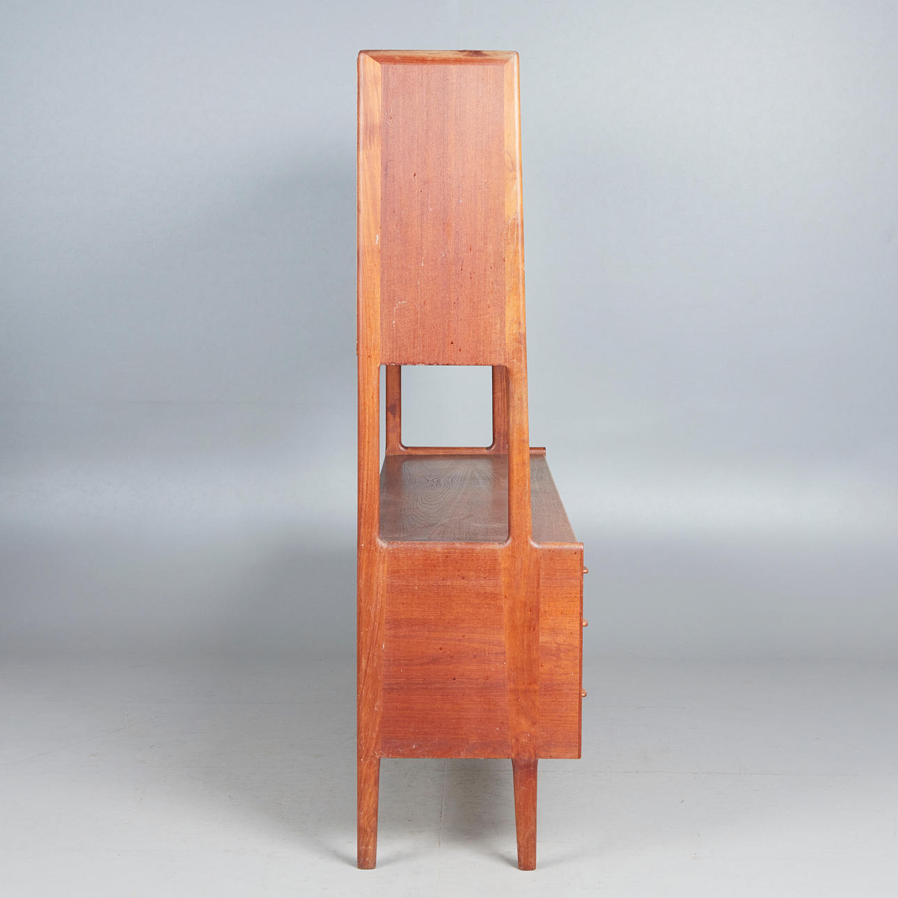 Hylde / ståhylde, teaktræ, 1960'erne. Teakhylde med to skydelåger øverst, monterede hylder indvendigt, seks skuffer under, en skuffe med grøn filtbestikrum, H.180cm, L.180cm, B.50cm.