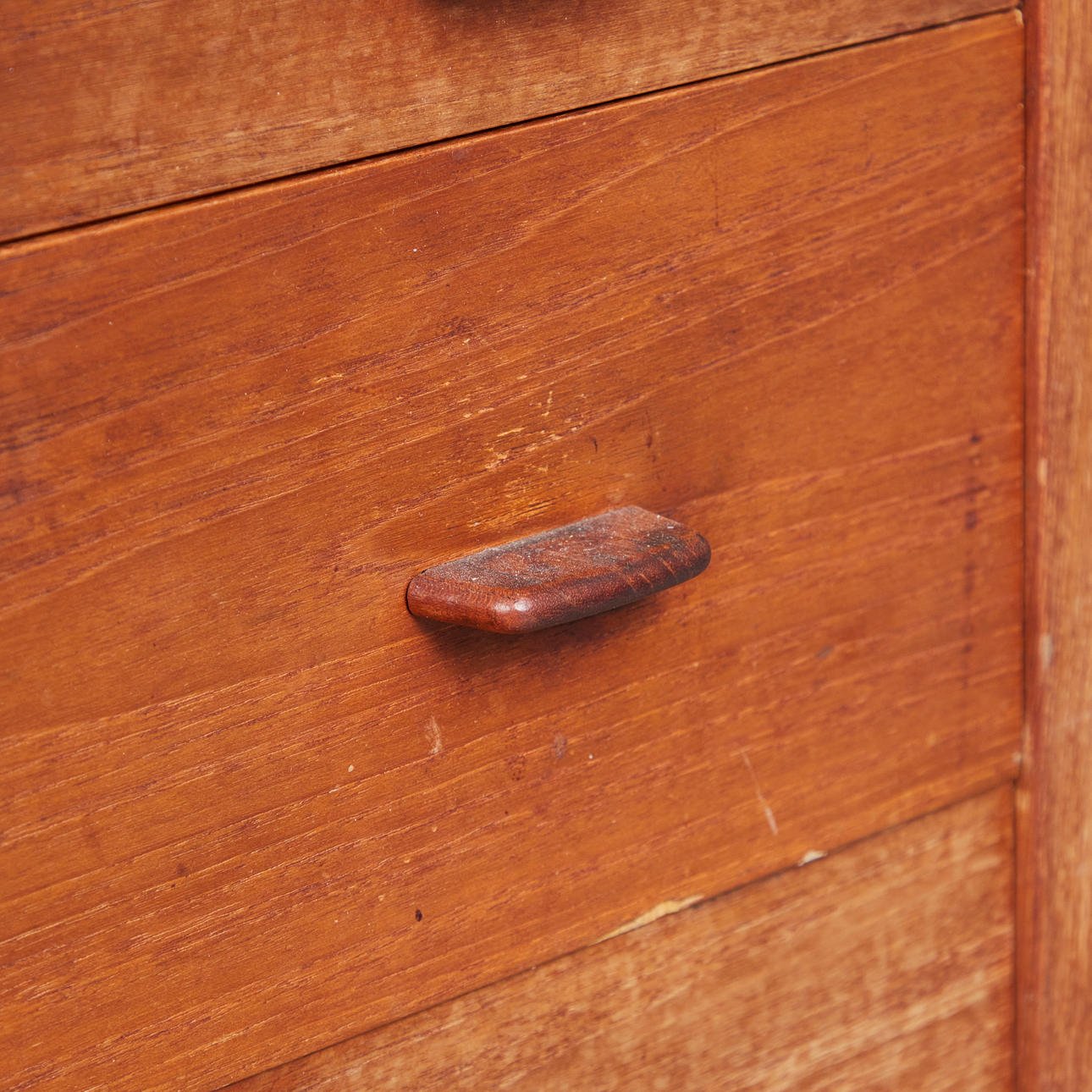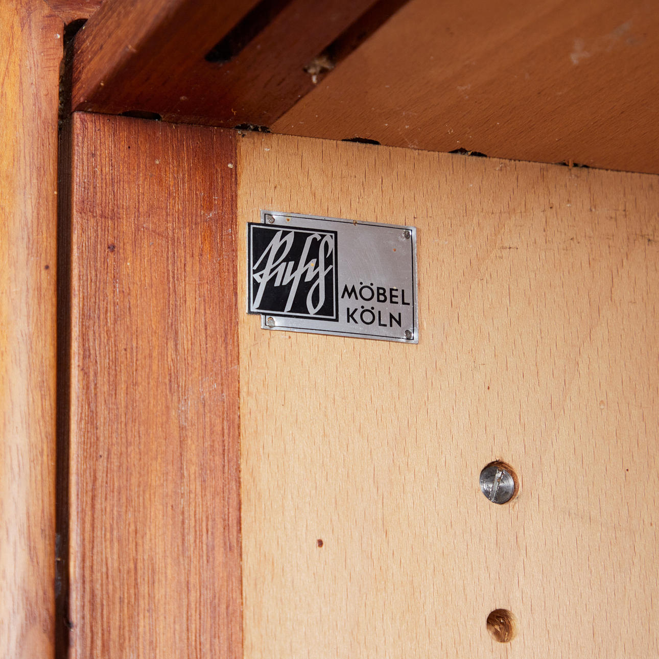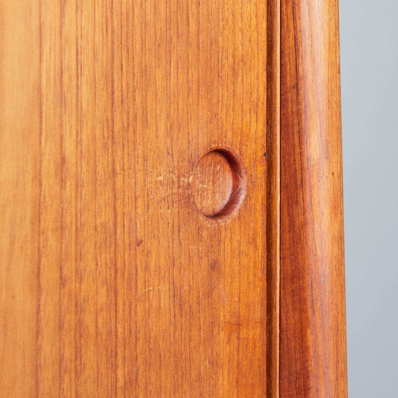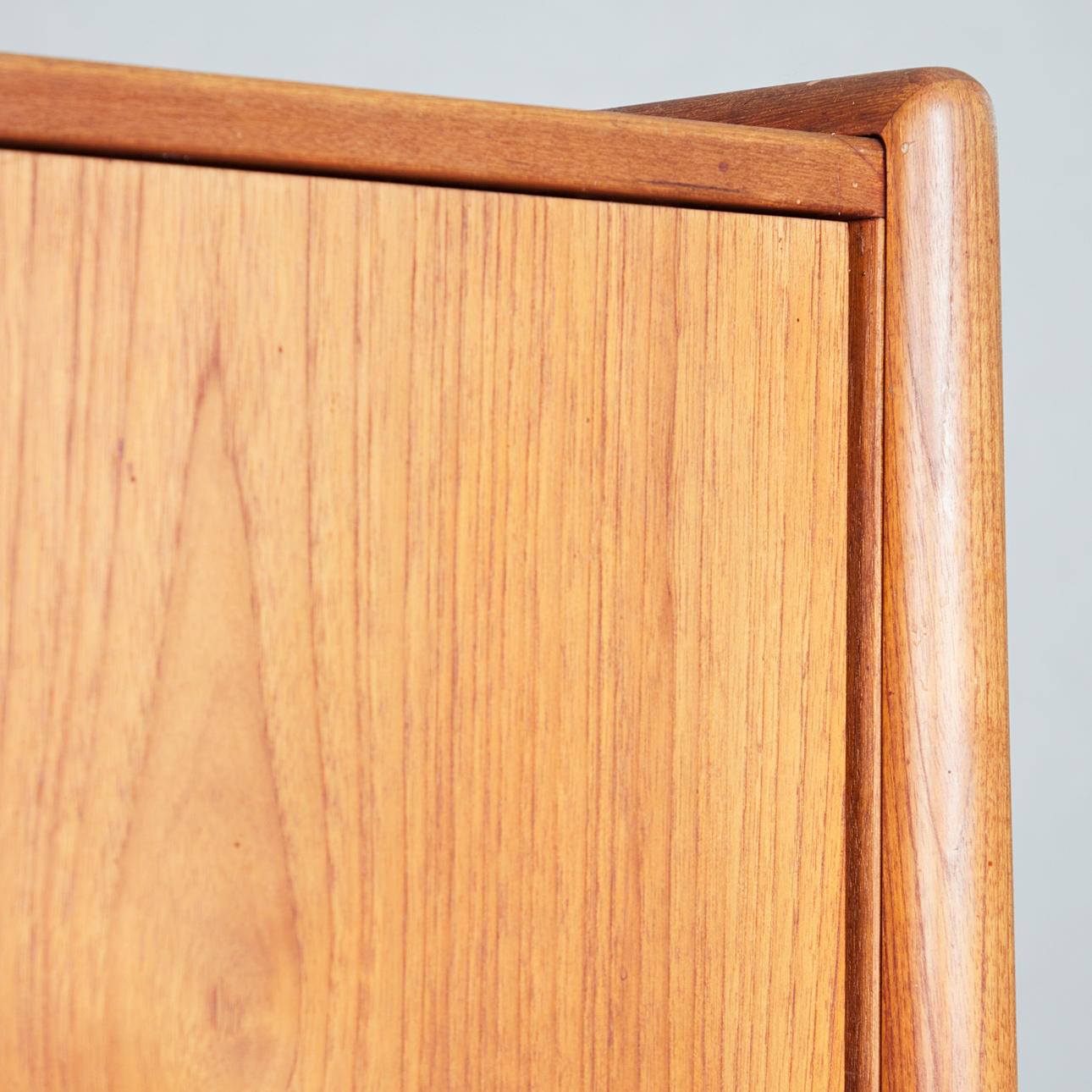 Hylde / ståhylde, teaktræ, 1960'erne. Teakhylde med to skydelåger øverst, monterede hylder indvendigt, seks skuffer under, en skuffe med grøn filtbestikrum, H.180cm, L.180cm, B.50cm.