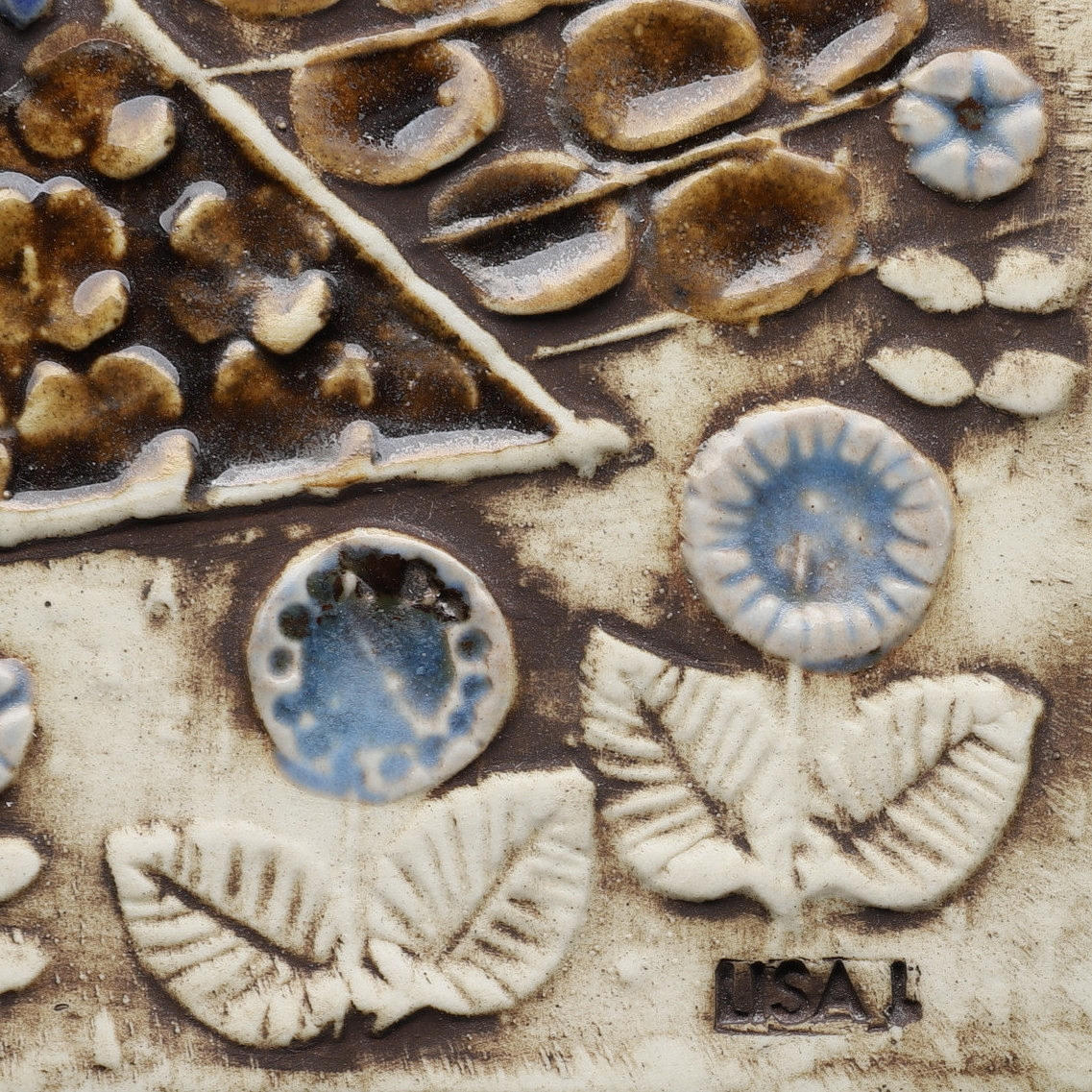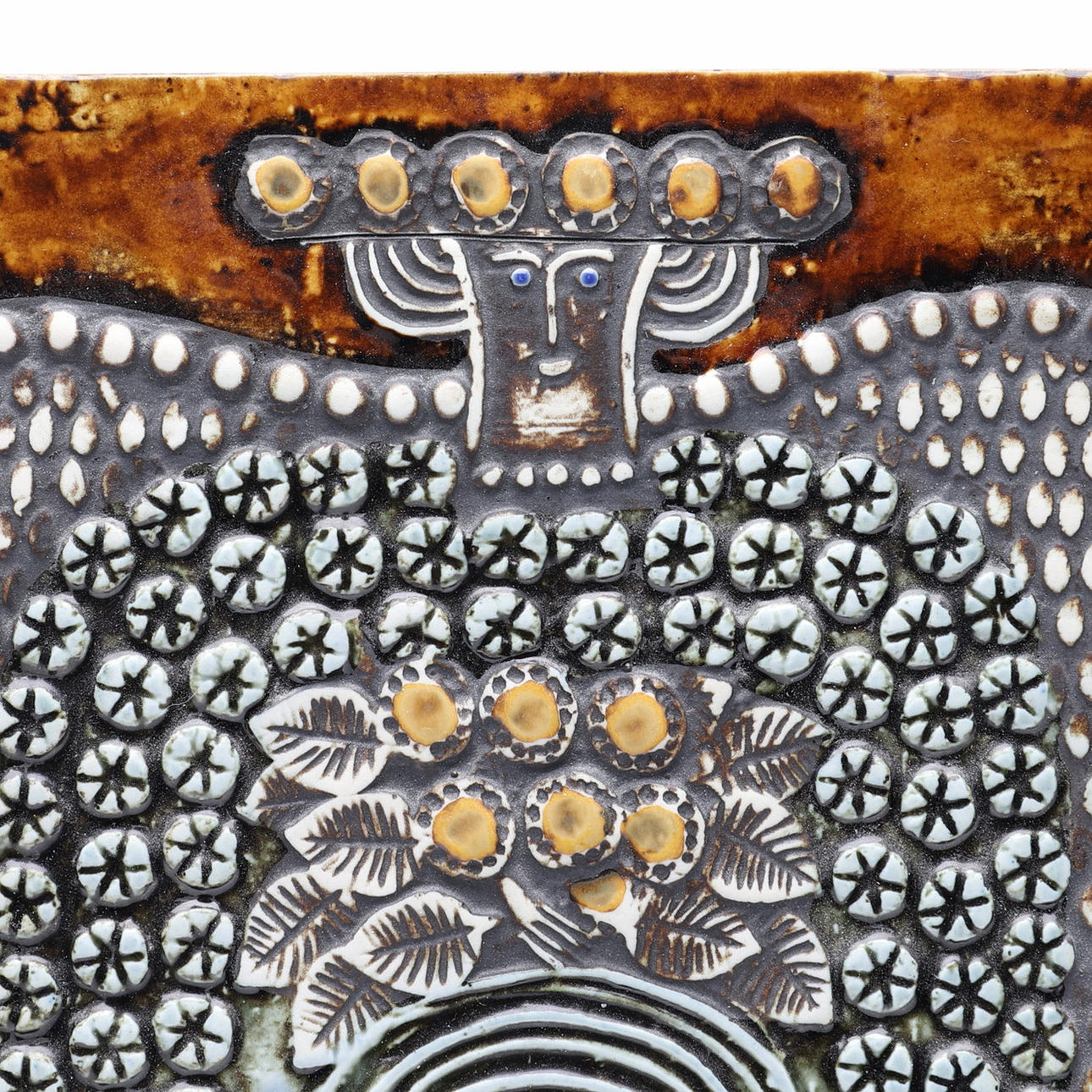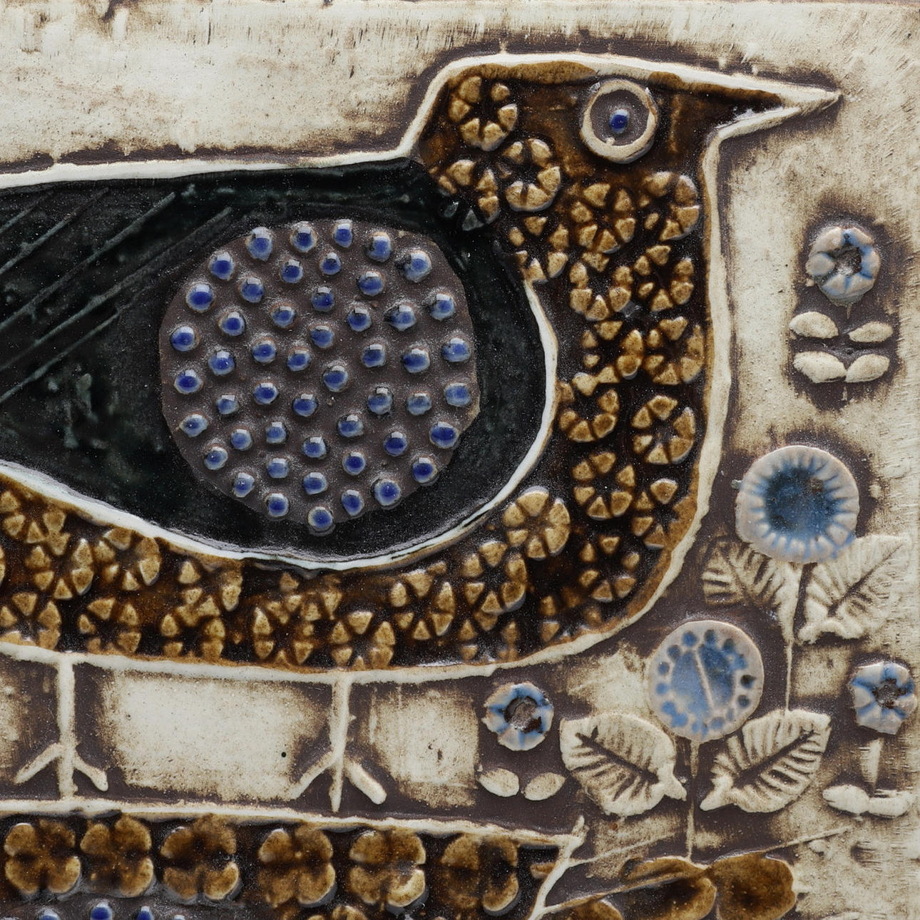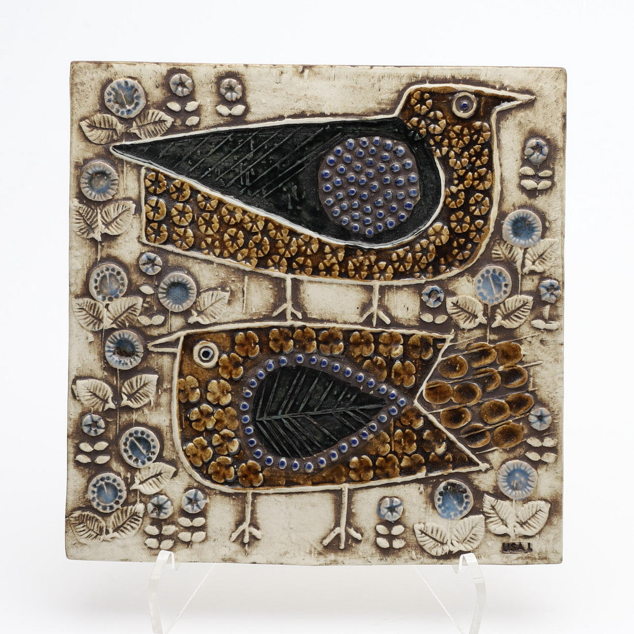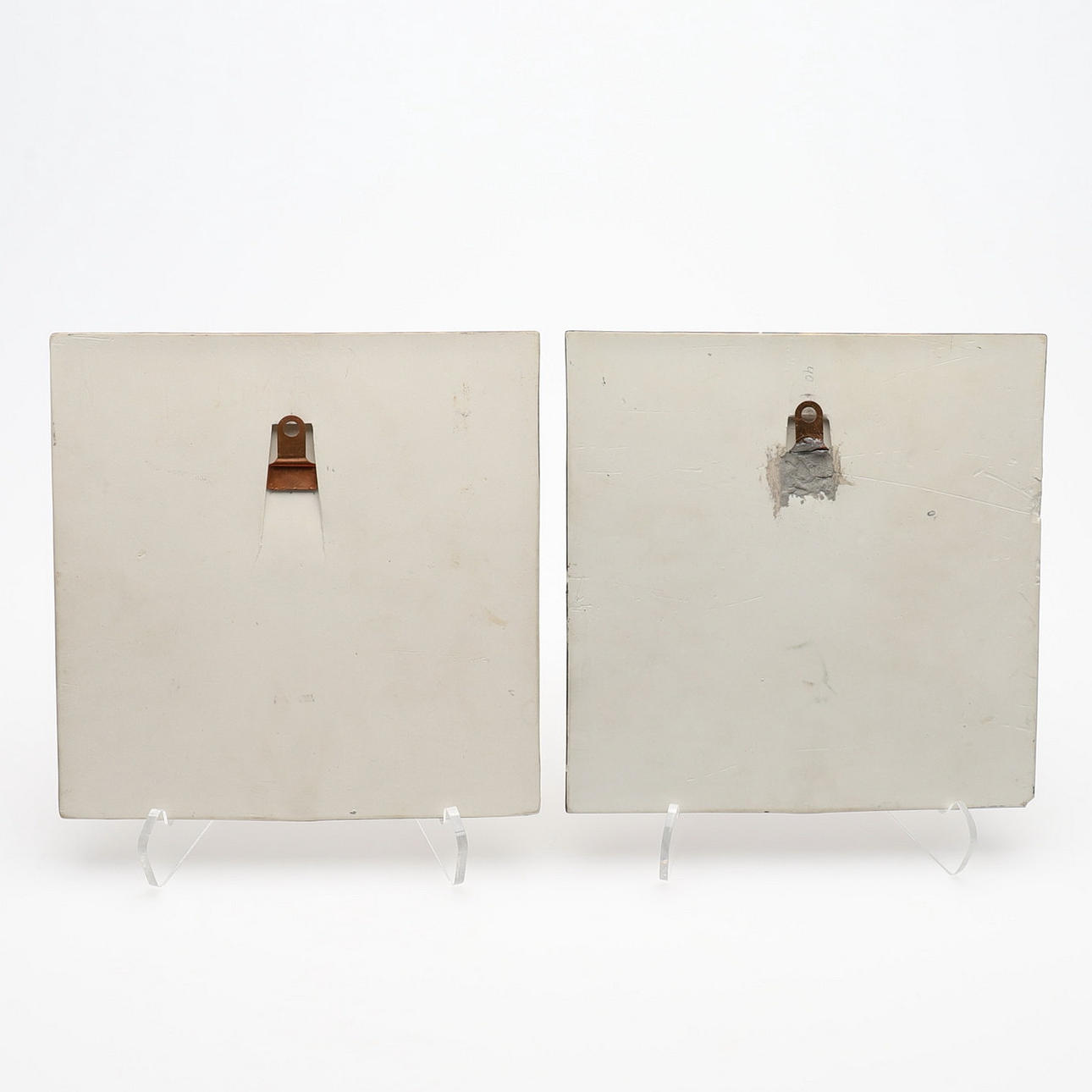 "Damer" og "Fugle", delvist glaseret reliefdekor, trykket signatur, ca 22x23 cm.