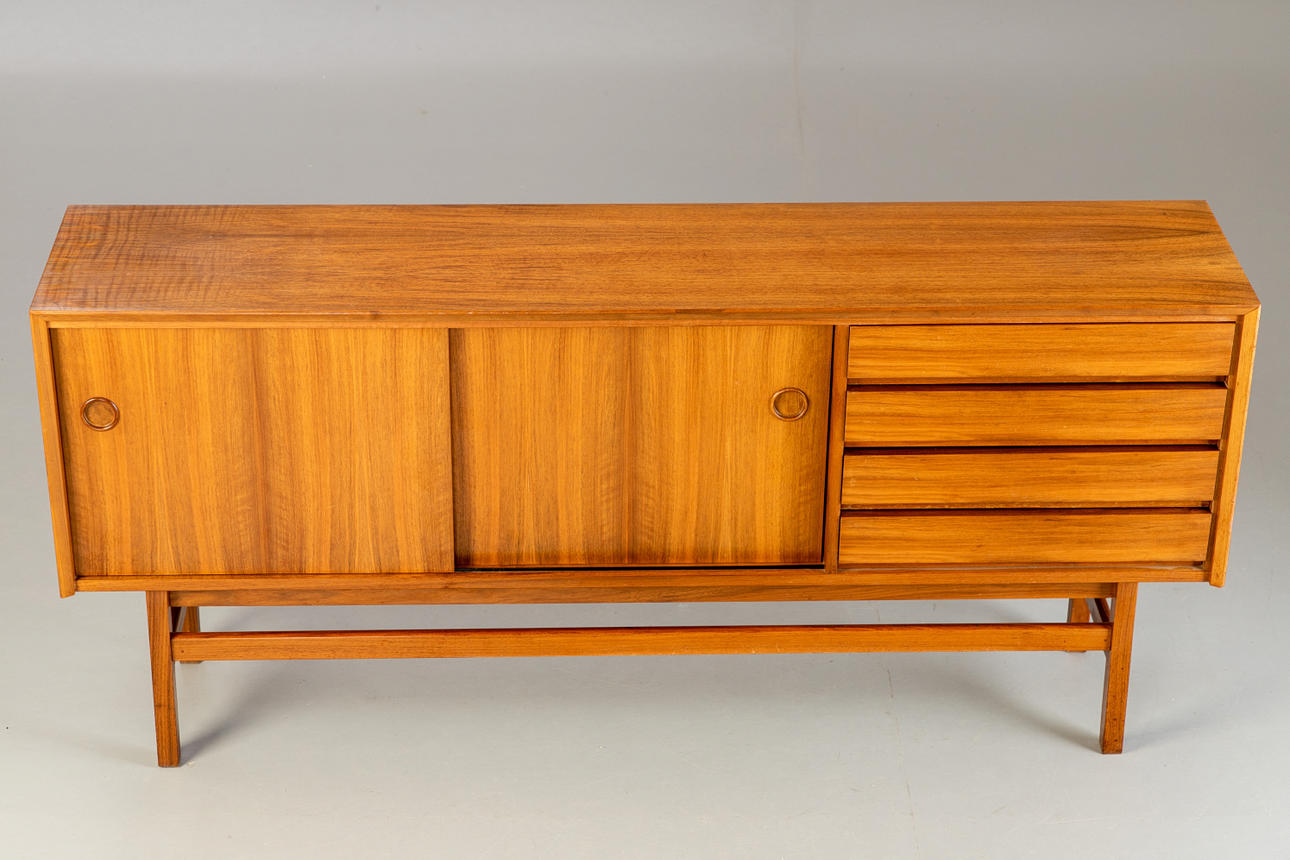 Teak skænk, skandinavisk Midcentury design. 4 skuffer og 2 skydelåger med 1 hylde.