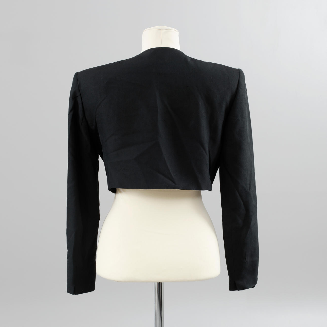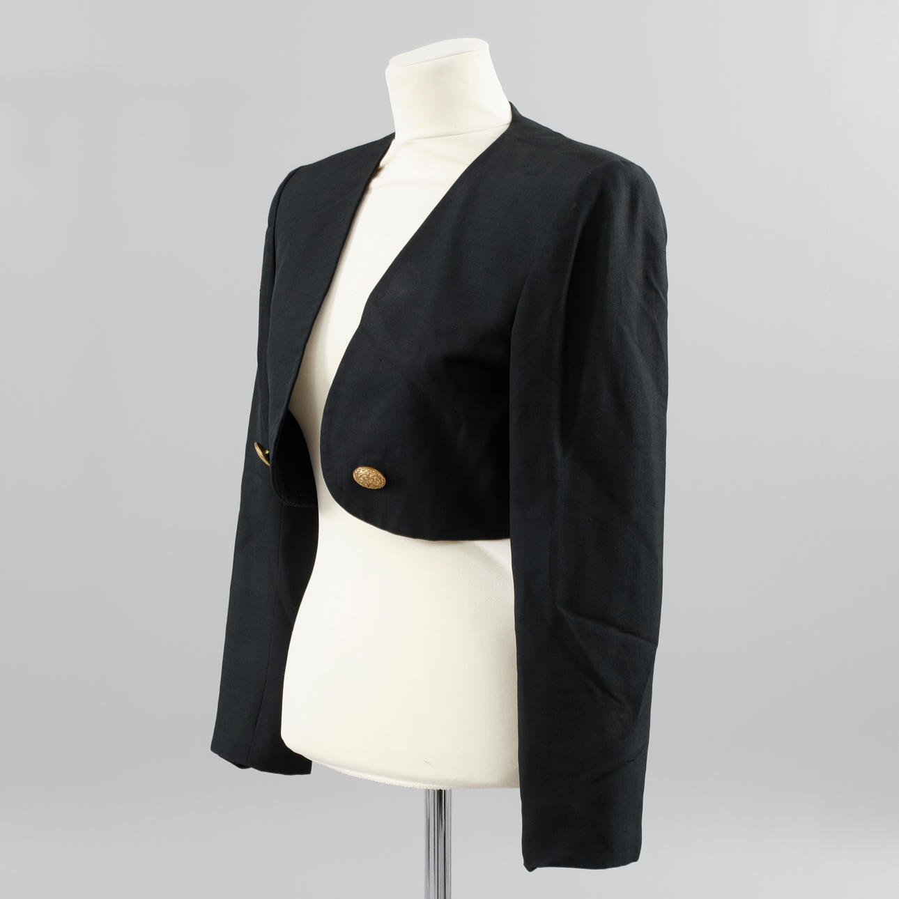 Kort bolero/jakke i silke, knapper i gult metal. Mærket størrelse 4. Estimeret størrelse 36.