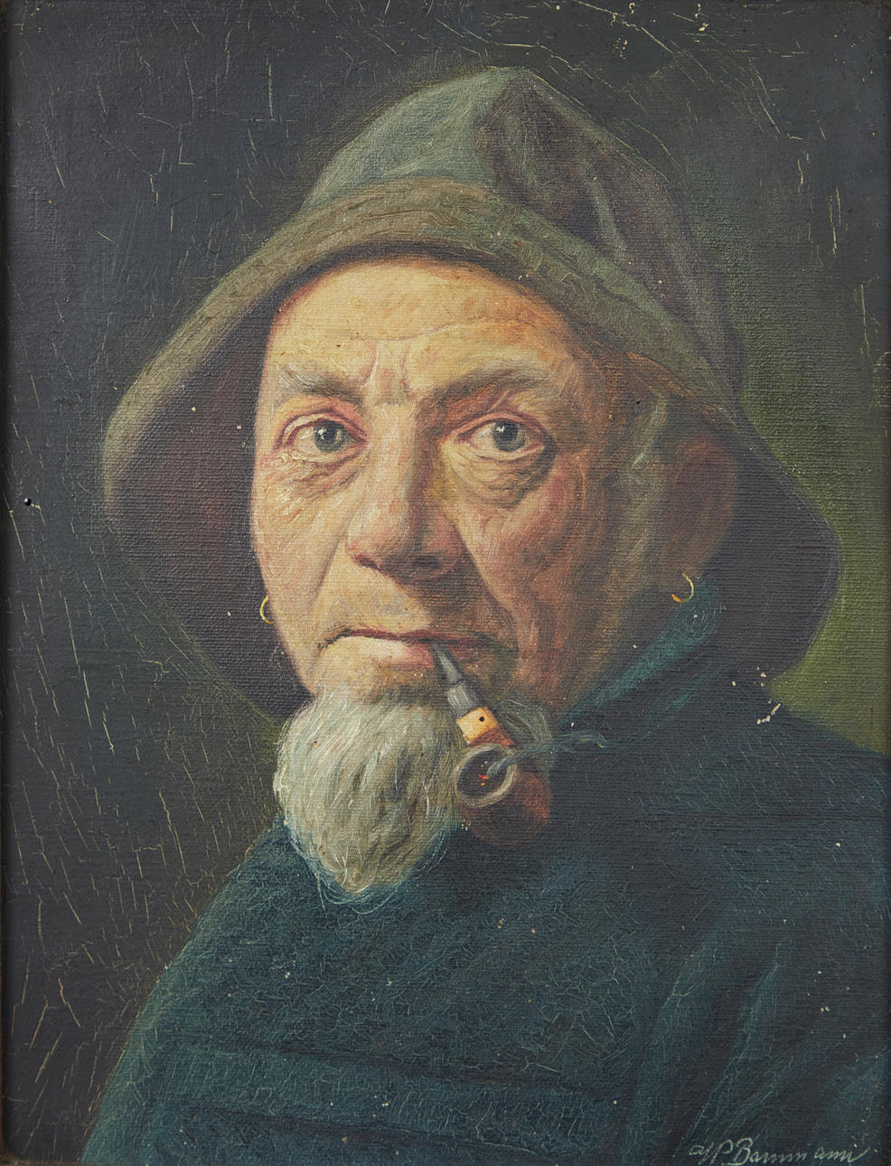 Baumann, maleri, portræt af en sømand, olie på lærred. Afbildning af en mand i trekvart profil med sømandshat og pibe foran mørk baggrund, signeret nederst til højre, 25x19cm (34x28cm).