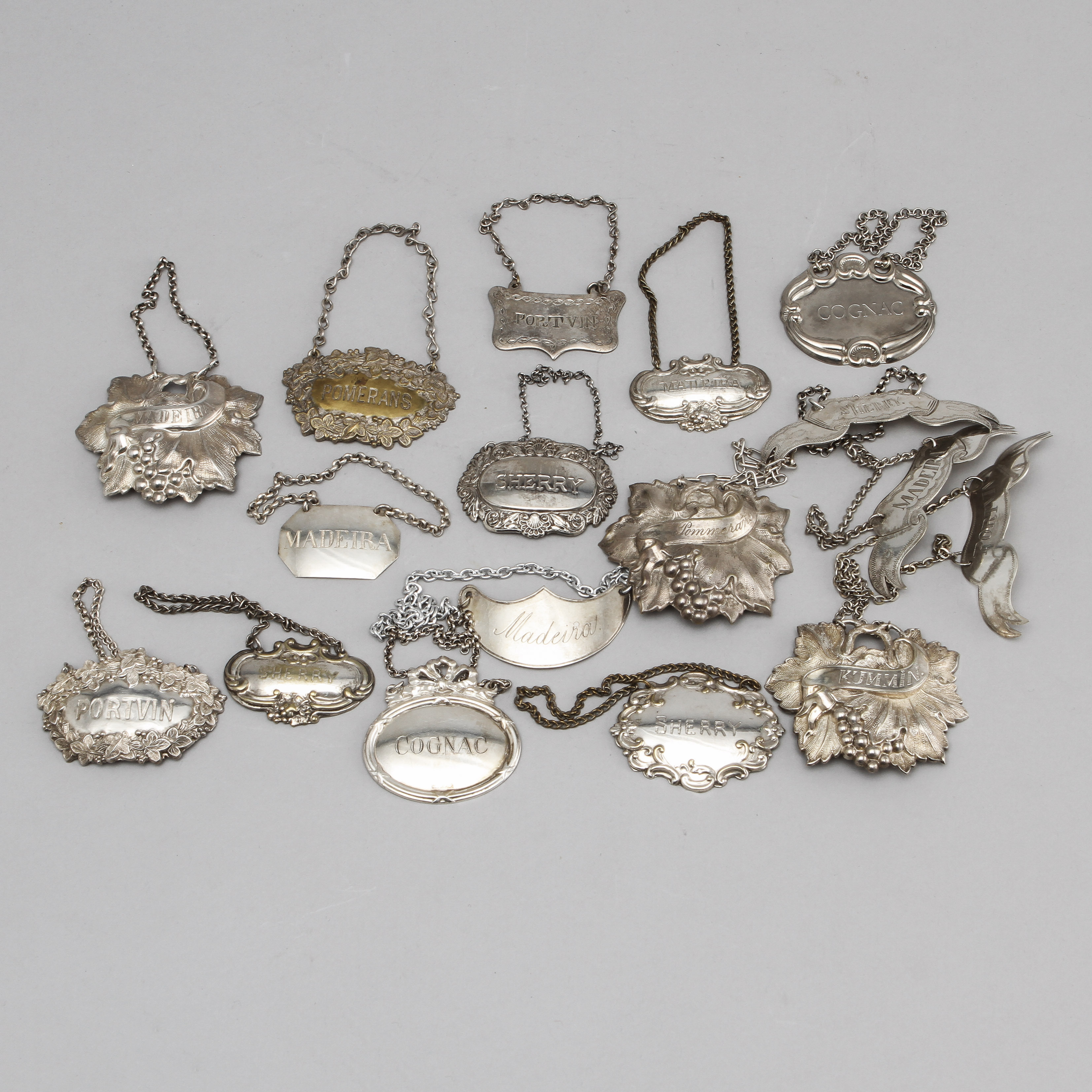 220441. KARAFFSKYLTAR, 17 stk, nysølv, 1900-tallet.