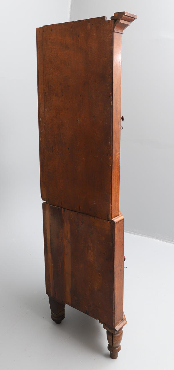 den øverste del med en støbt gesims over tre hylder omsluttet af en glaseret buet paneldør, den udragende base omsluttet af en paneldør, med et formet forklæde, på drejede ben, 89 cm bred x 50 cm dyb x 212 cm høj, med to nøgler.
