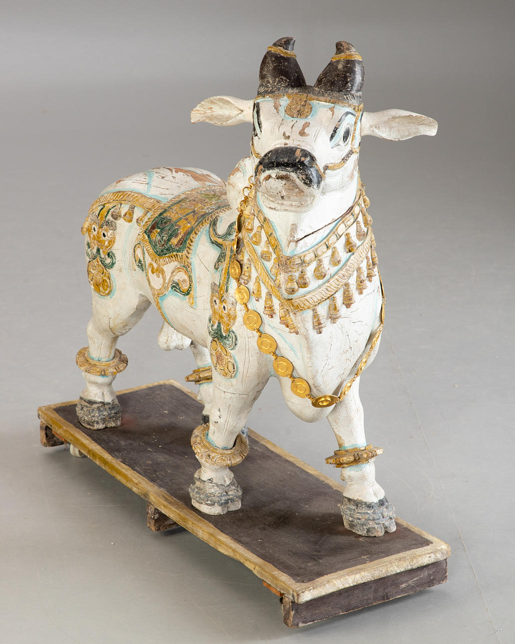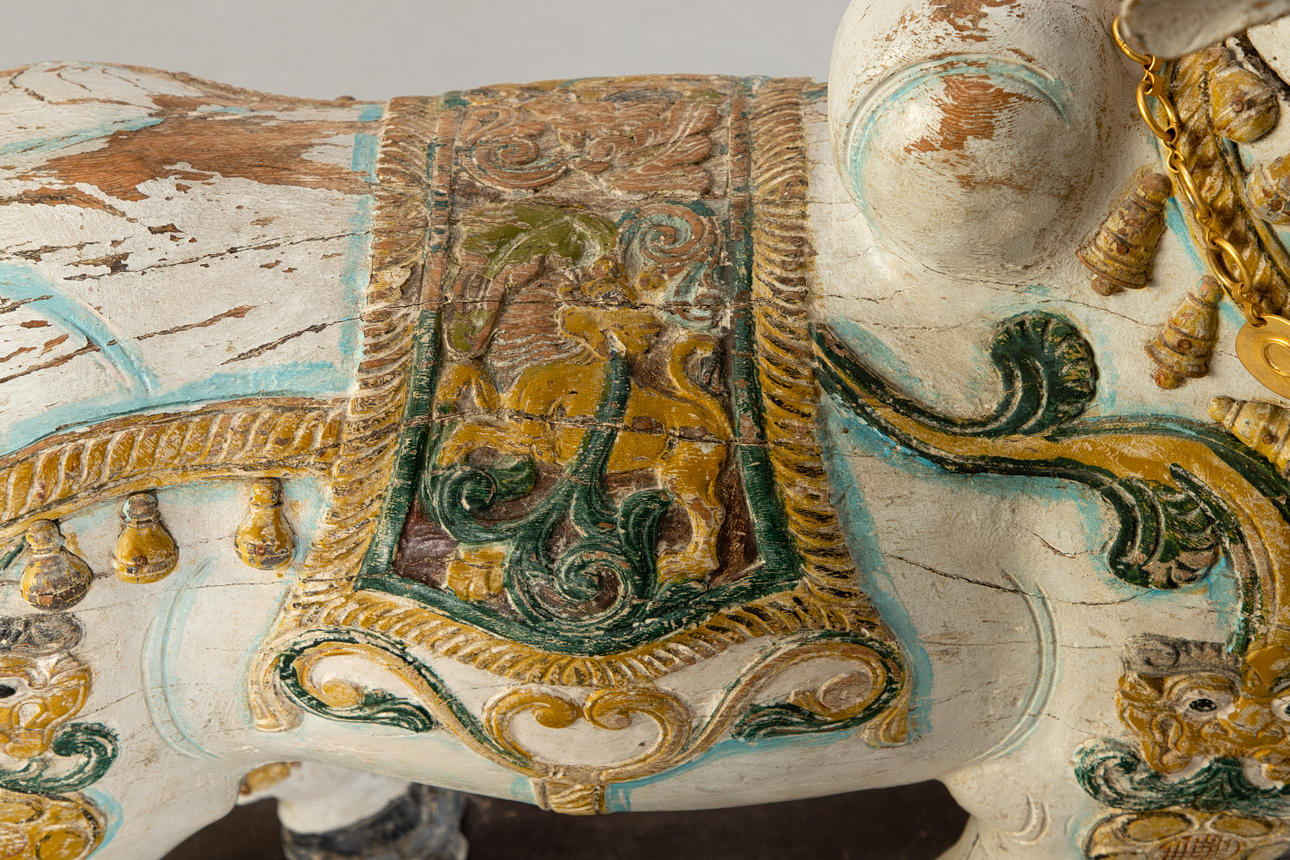 Træ, udskåret, 2 dele, malet. på træplade med hjul. HxBxD: ca. 83x95x35 cm, HxBxD: ca. 92x91x35 cm (samlede mål).