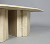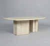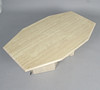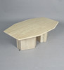 Materiale: travertin Mål: H: 43 cm, B: 120 cm, D: 100 cm Bordpladen er fiberforstærket på undersiden og er derfor mere brudsikker end de sædvanlige produktionsmetoder for disse borde.