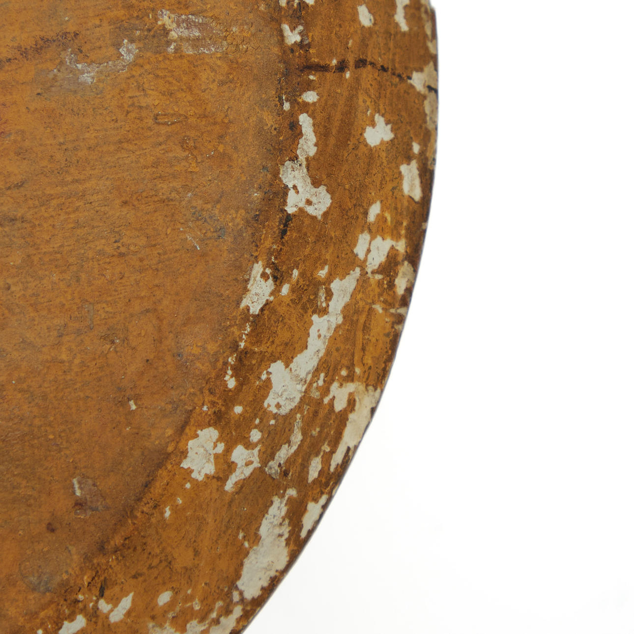 Fremstår med alderssvarende gnidningsspor, guldmaling delvist gnidet og med ridser samt buler og revner.