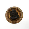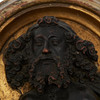 Billede af en helgen/portrætmedaljon, træ. Portrætmedaljon lavet af træ med rund, profileret ramme i guldmaling og indstøbt semi-plast portrætbuste forestillende en skægget mand, med ophængsanordning på ryggen, H.16cm, D.16cm, D.5cm.