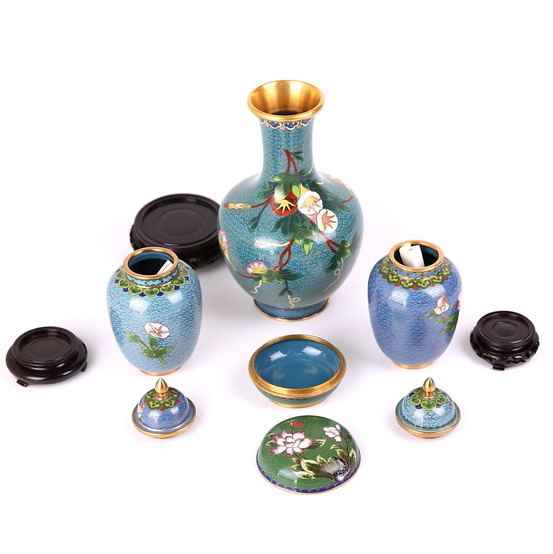 221963. VAS, 2 LOCKURNOR, LOCKASK, Cloisonné, Kina, 1900-tallet.