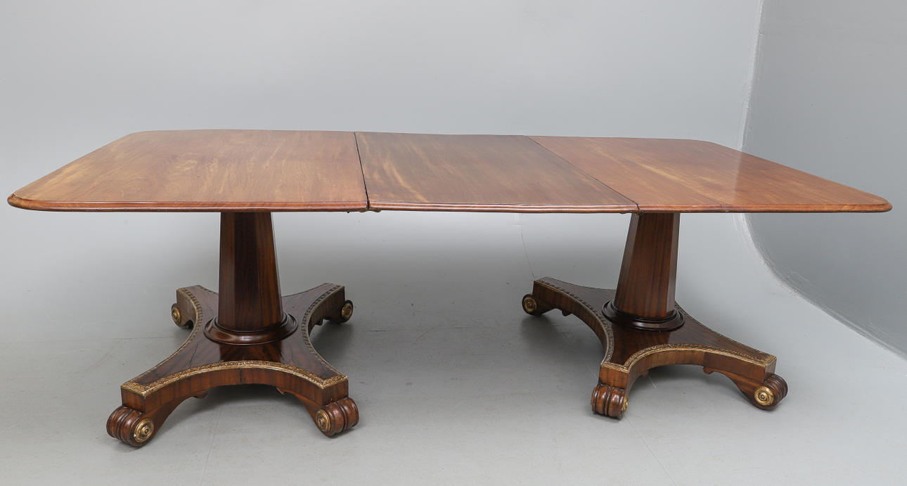 ændringer og restaureringer, den formstøbte kant tilt-top med afrundede hjørner og med et ekstra blad, på to ottekantede tilspidsede søjler med drejede sokler, de konkave siderede platformsbaser med pakkeforgyldte bladfyldte lunettekanter, de formstøbte rullede fødder med skjulte hjul og påførte pakke forgyldte rundeller, 162 cm bred x 119 cm dyb x 72 cm høj, 230,5 cm bred med ekstra blad i *** Bordet har to smalle støbte kantforlænger, der gør det muligt at danne to separate borde English Country House Collection Part II.