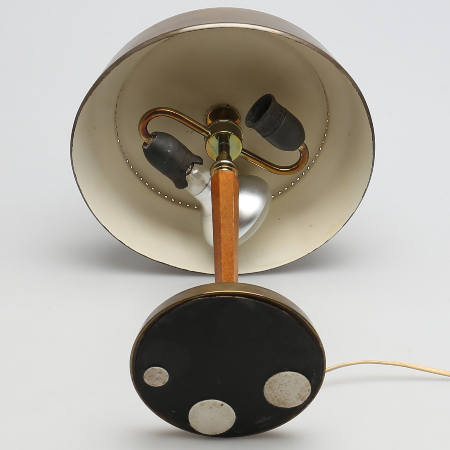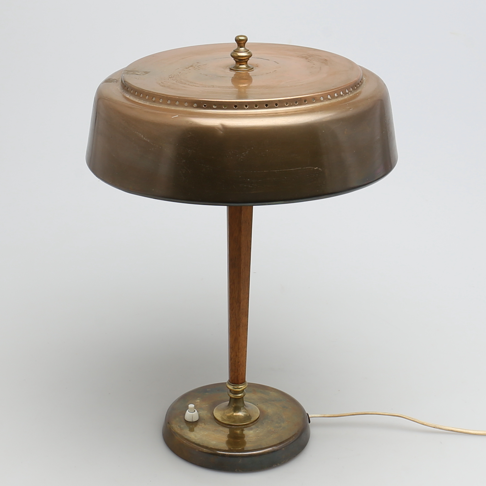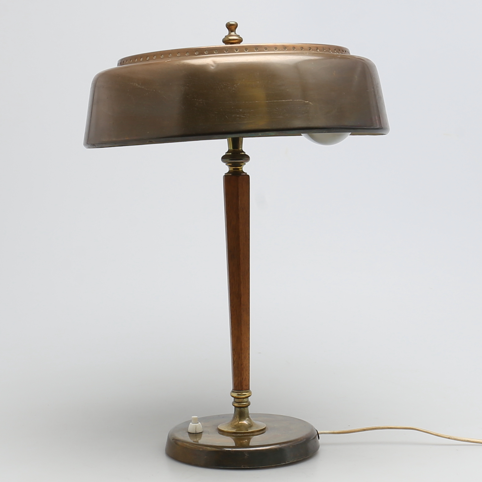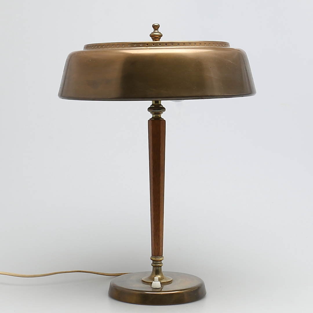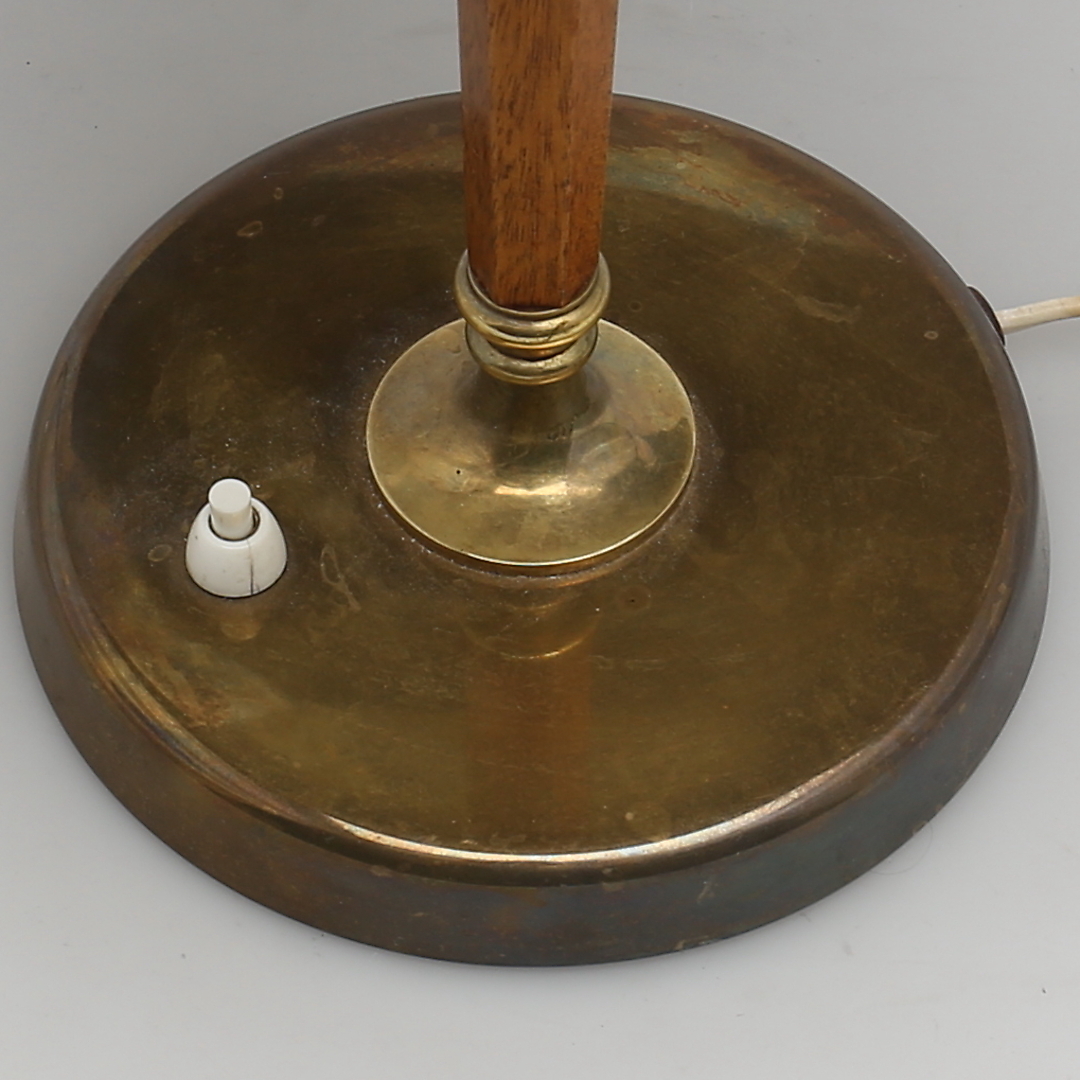 222720. SKRIVEBORDSLAMPE. Messing og træ. 1900-tallet.