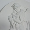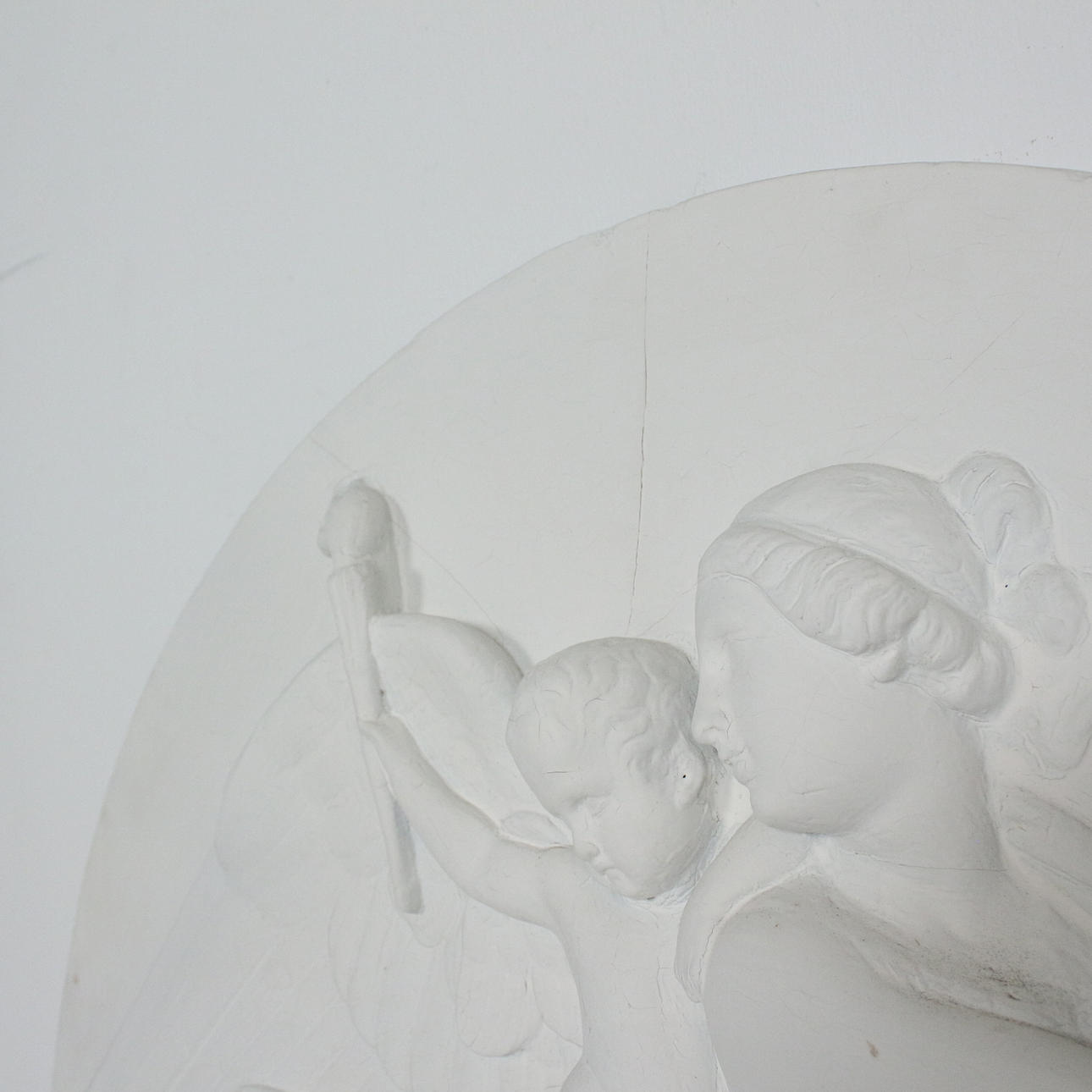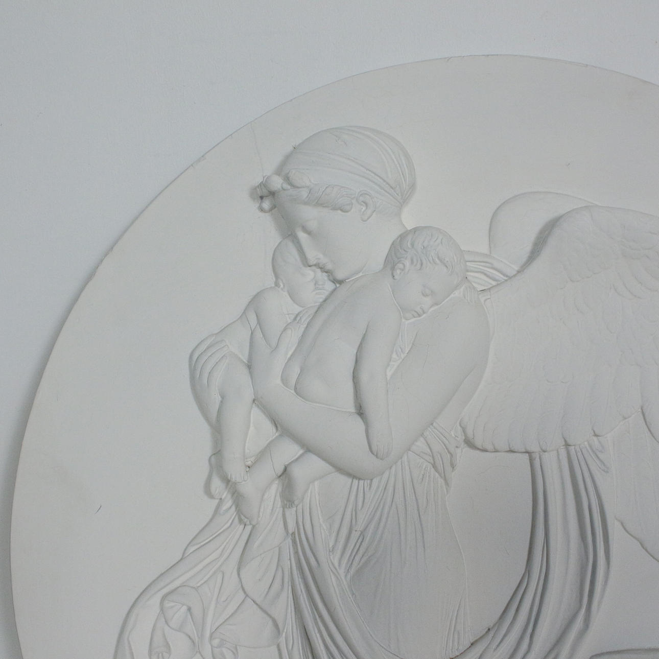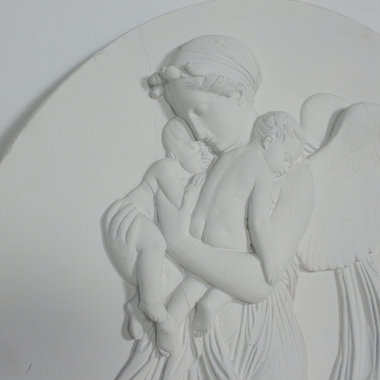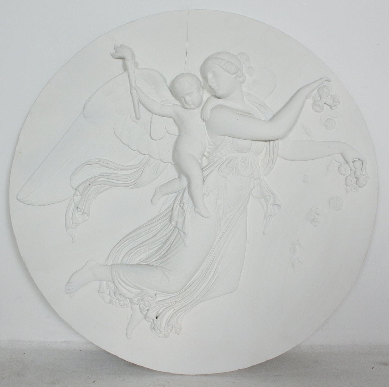 To store vægrelieffer efter Bertel Thorvaldsen, 'Dagen' og 'Natten', gips, med plakette på bagsiden: 'Thorvaldsens Museum', mål hver ca.: Ø 82 cm.
