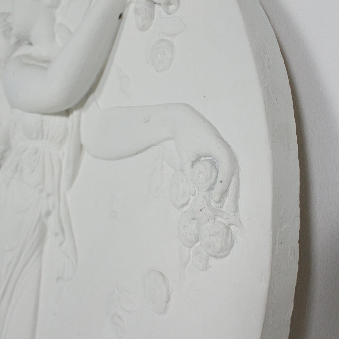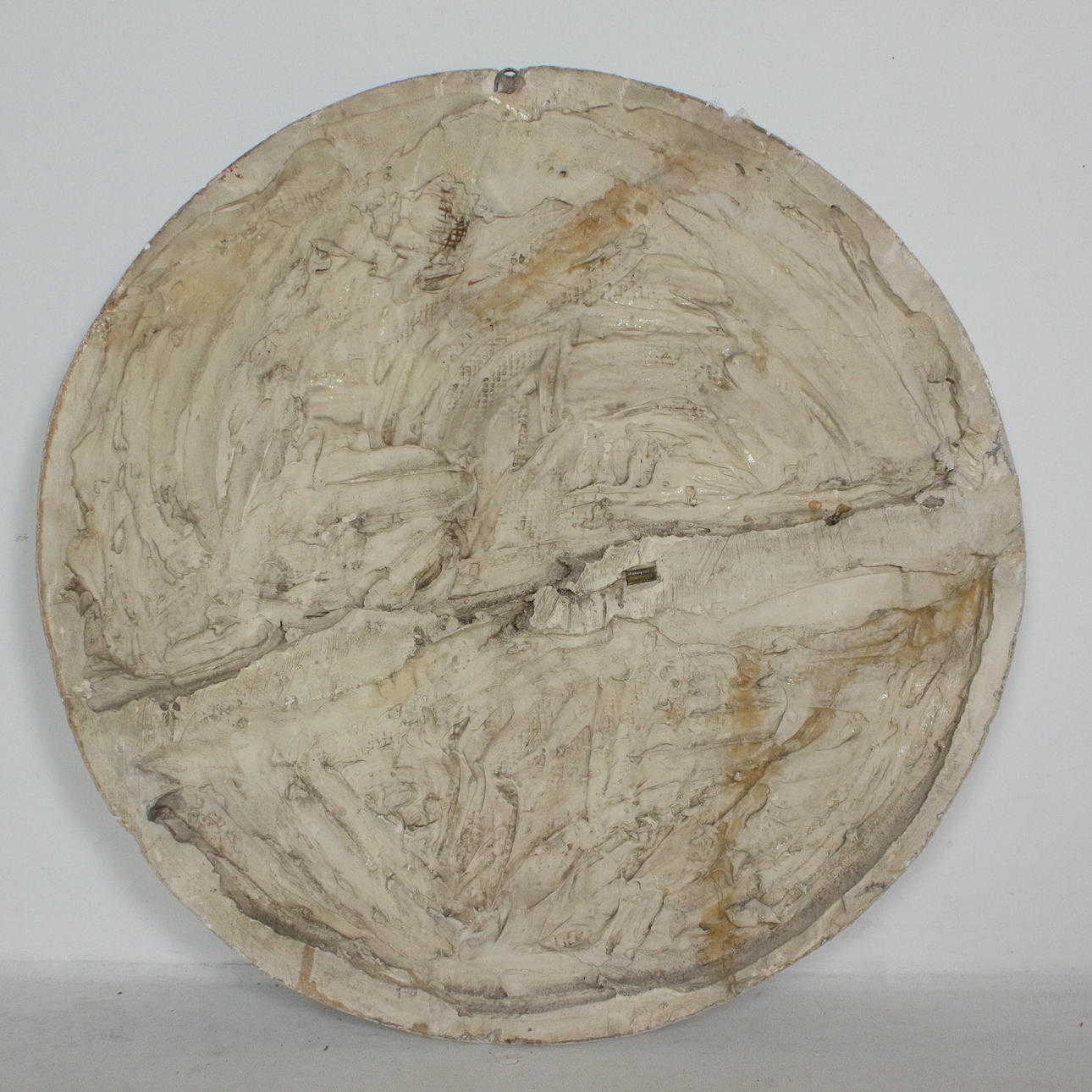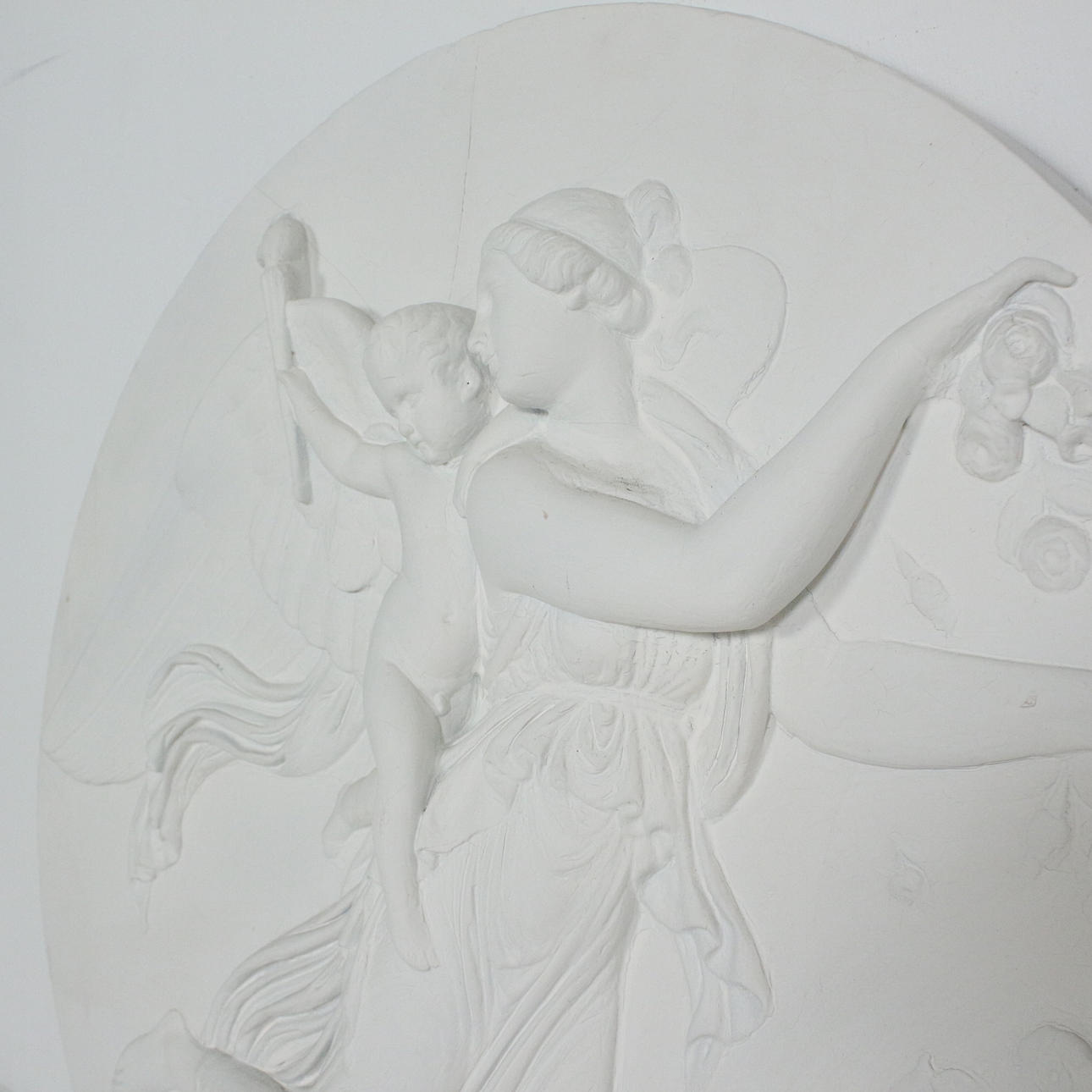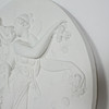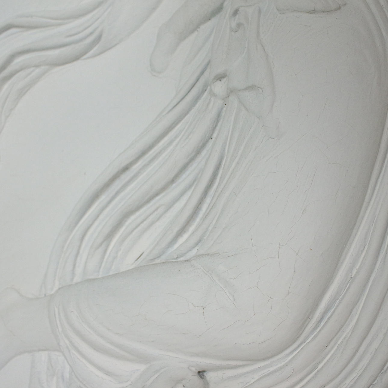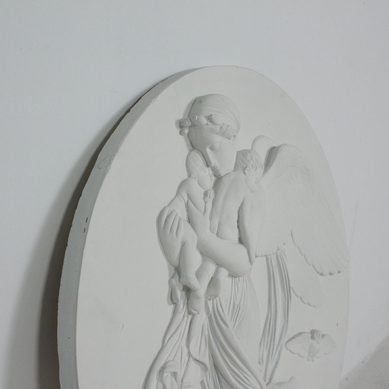 To store vægrelieffer efter Bertel Thorvaldsen, 'Dagen' og 'Natten', gips, med plakette på bagsiden: 'Thorvaldsens Museum', mål hver ca.: Ø 82 cm.