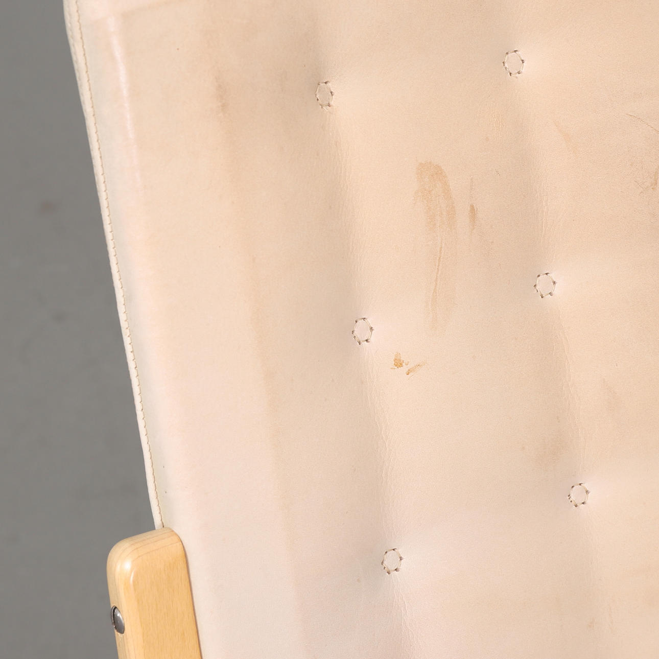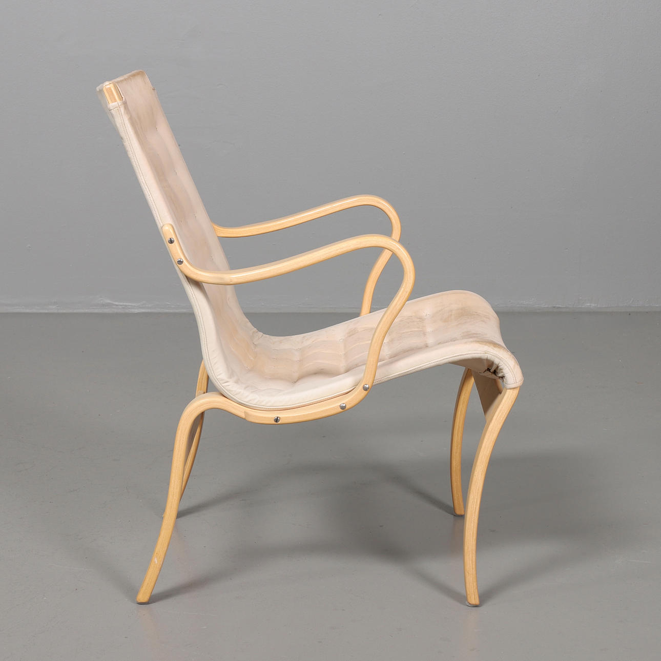 Lænestol model Mina designet af Bruno Mathsson og fremstillet af Bruno Mathsson International. Stel af bøgetræ og læderbeklædt sæde.