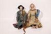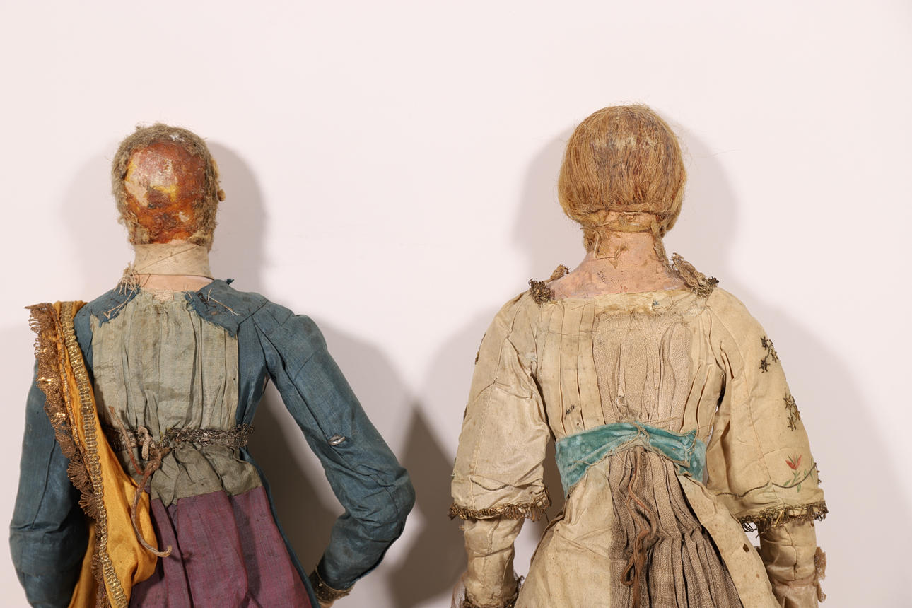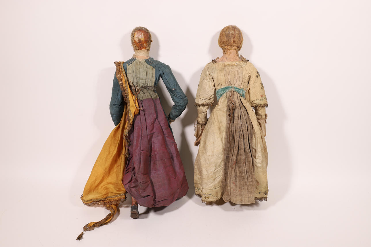 Et par kvinde- og mandsfigurer i polykromt træ med tidstypisk beklædning. Leddede arme og ben.